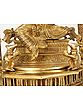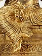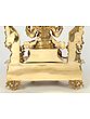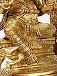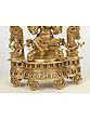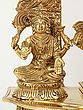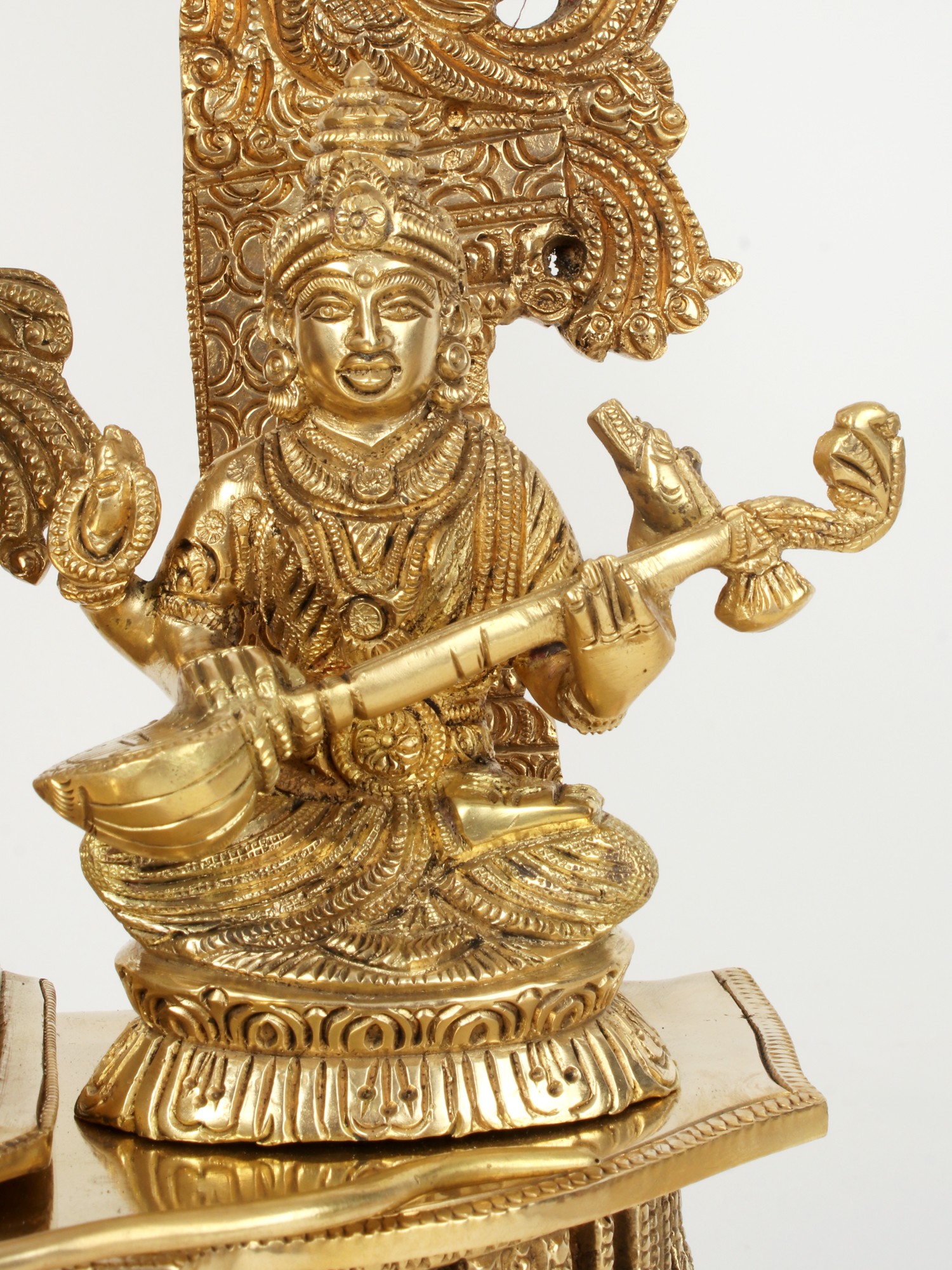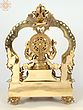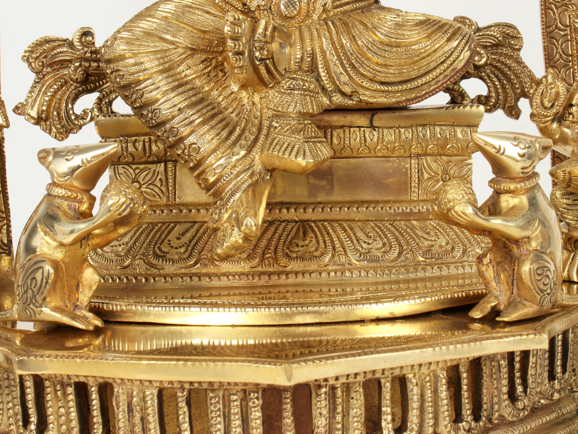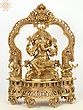 This statue is meticulously crafted from superfine brass, showcasing exceptional artistry and attention to detail. The intricate carvings, adorning both the figures and the Kirtimukha throne, depict traditional motifs and floral patterns, typical of ancient Indian craftsmanship. The lustrous golden hue of the brass enhances the statue's divine presence, creating a radiant and captivating aura. The detailed craftsmanship highlights the skill and dedication of the artisans, making this piece a testament to India's rich artistic heritage. Each element, from the folds in the goddesses' garments to the playful muses at Ganesha's feet, are rendered with precision and care, showcasing the level of expertise invested in its creation.