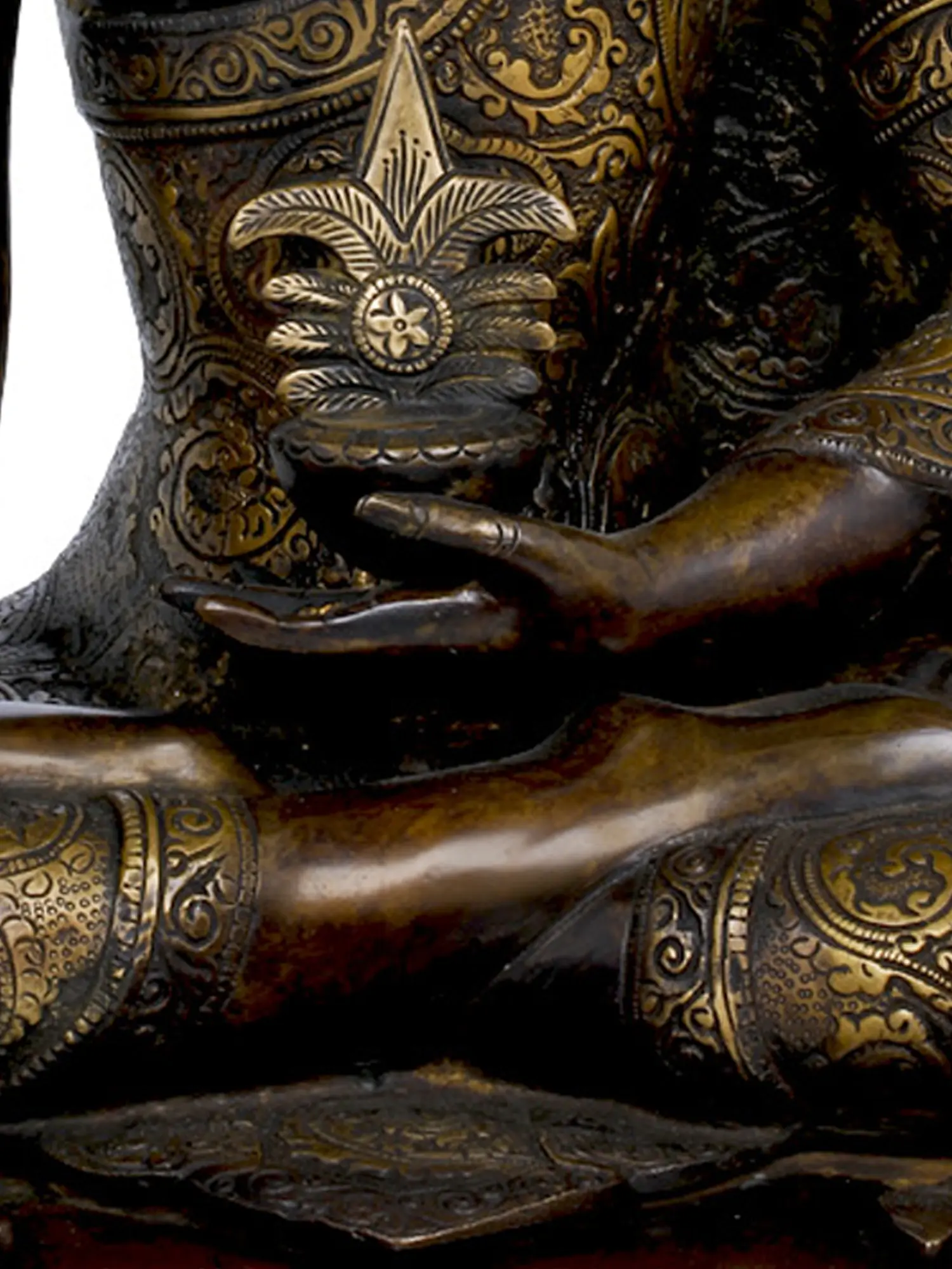 This magnificent brass statue depicts the Medicine Buddha, also known as Bhaisajyaguru in Sanskrit or Sangye Menla in Tibetan. Revered as the Buddha of healing, he embodies the supreme physician who cures the suffering of the world. In Buddhist cosmology, the Medicine Buddha is one of the eight great bodhisattvas and a master of the eastern paradise of pure lapis lazuli. Legends tell of his twelve vows, taken before his enlightenment, to liberate all sentient beings from the three poisons of greed, hatred, and ignorance, and to heal them from physical and mental ailments. This exquisite sculpture captures his serene presence and the profound compassion he offers to all who seek solace and well-being.