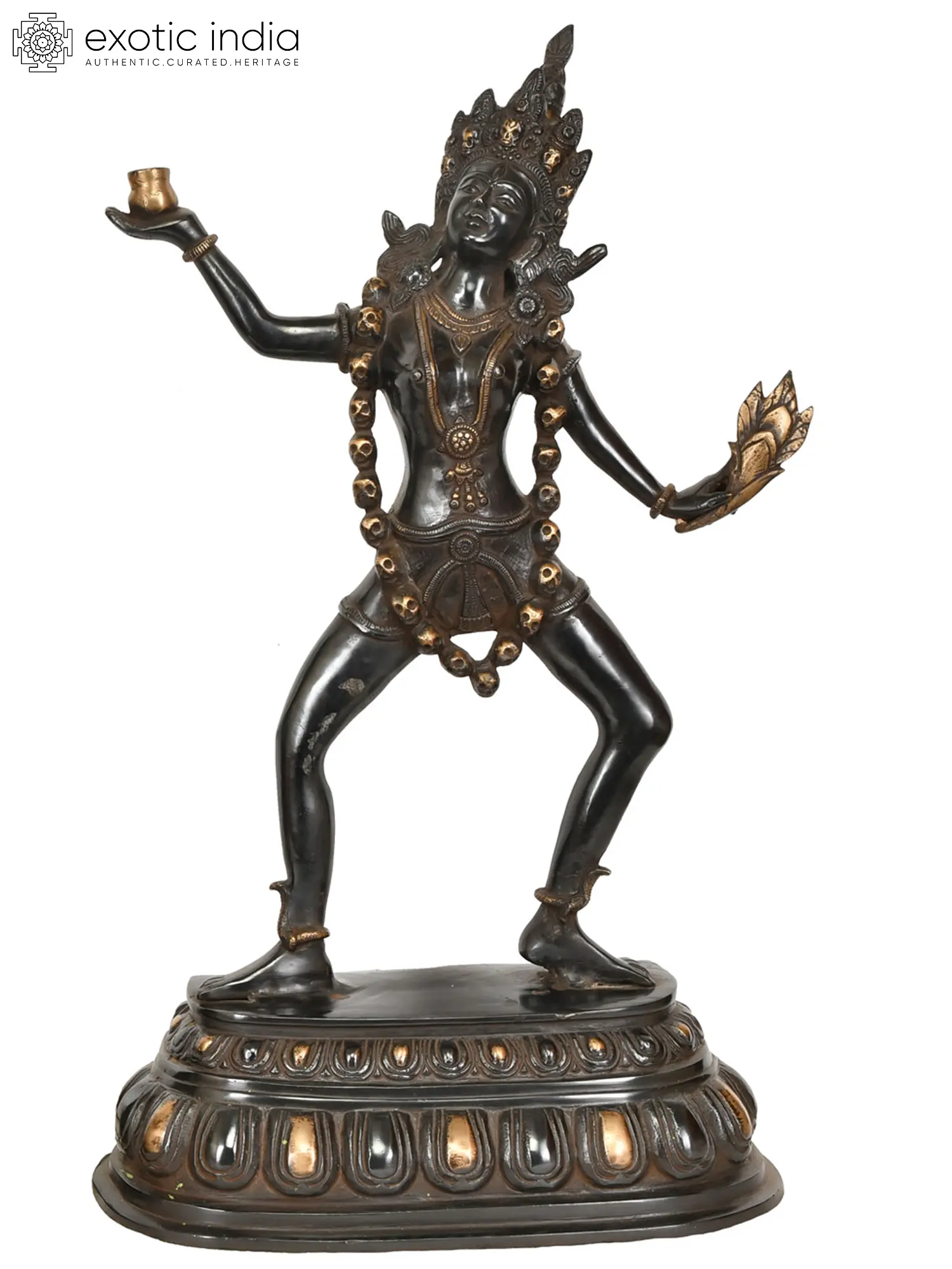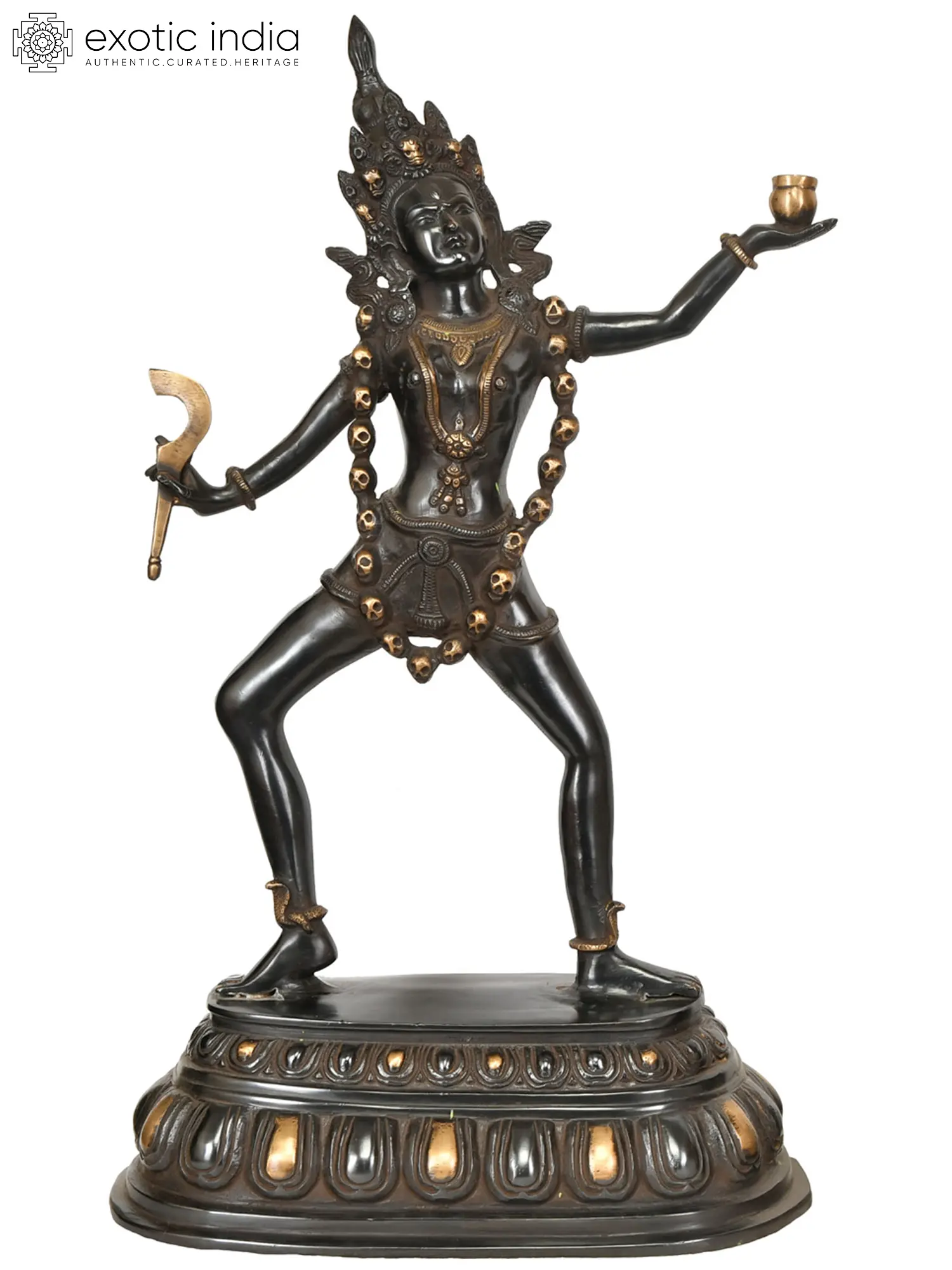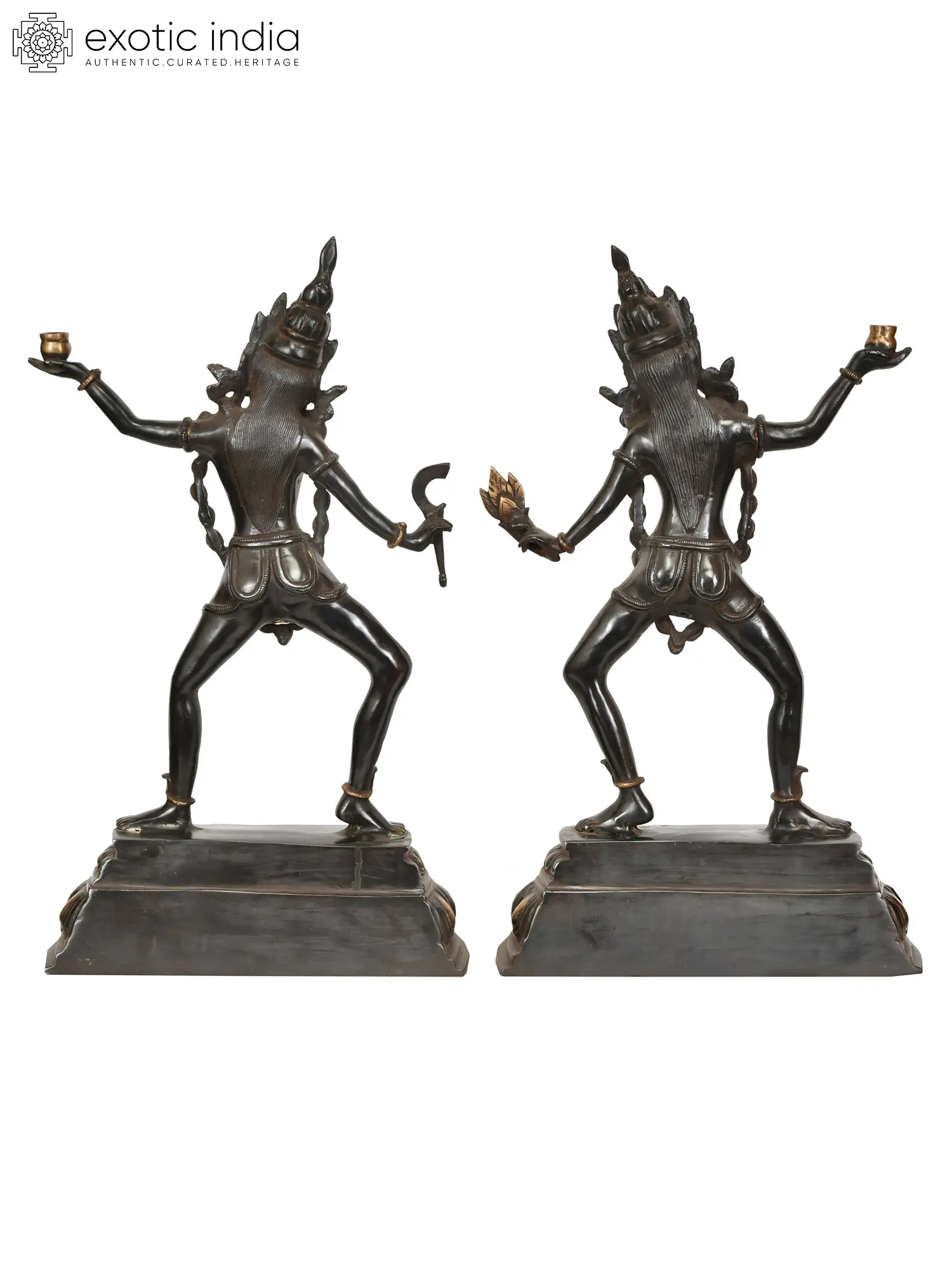 This exquisite pair of brass figures embodies the formidable and transformative energy of the divine feminine, as depicted in the rich tapestry of Tantric traditions. Each yogini, rendered with a striking dynamism, stands on a lotus pedestal, a symbol of purity and spiritual awakening that transcends the material world. The deep, dark patina of the brass evokes a sense of ancient mystery and profound power, a testament to the skilled craftsmanship that brought these beings to life in India. The figures are adorned with garlands of skulls, a potent reminder of impermanence and the cycles of life and death that are central to Tantric philosophy. These are not symbols of morbidity, but rather of the yoginis' mastery over fear and their ability to find liberation through confronting the ultimate truths of existence. The delicate rendering of their musculature and posture suggests immense energy contained within, ready to be unleashed. The headdresses, elaborate and fiery, further enhance their aura of power and otherworldliness. ––––––––––––––––––––