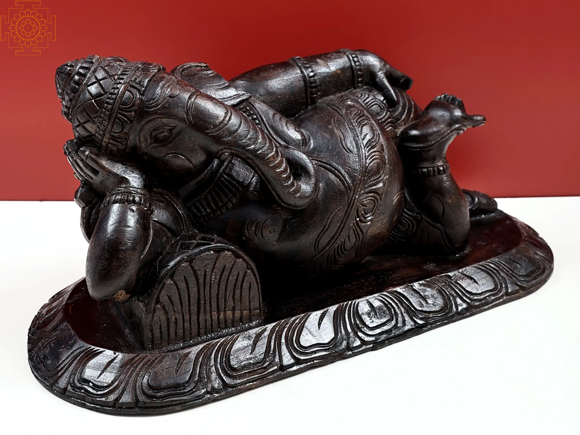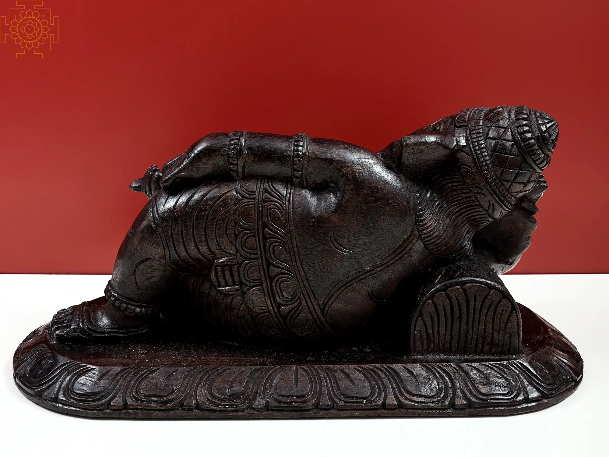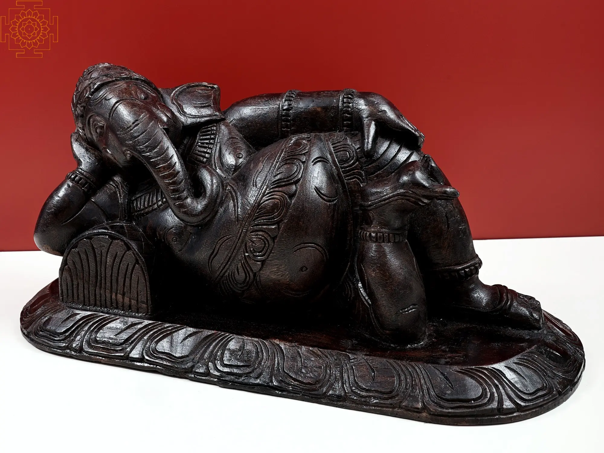 An image of the gracefully reclining Ganesha, carved entirely from wood. The variety is known as Vengai wood, derived from a tree endemic to South India. It is believed to be infused with miniscule proportions of divine life; as such, when it comes to creating traditional iconography, it is the medium of choice with the highly skilled artisans of the region.