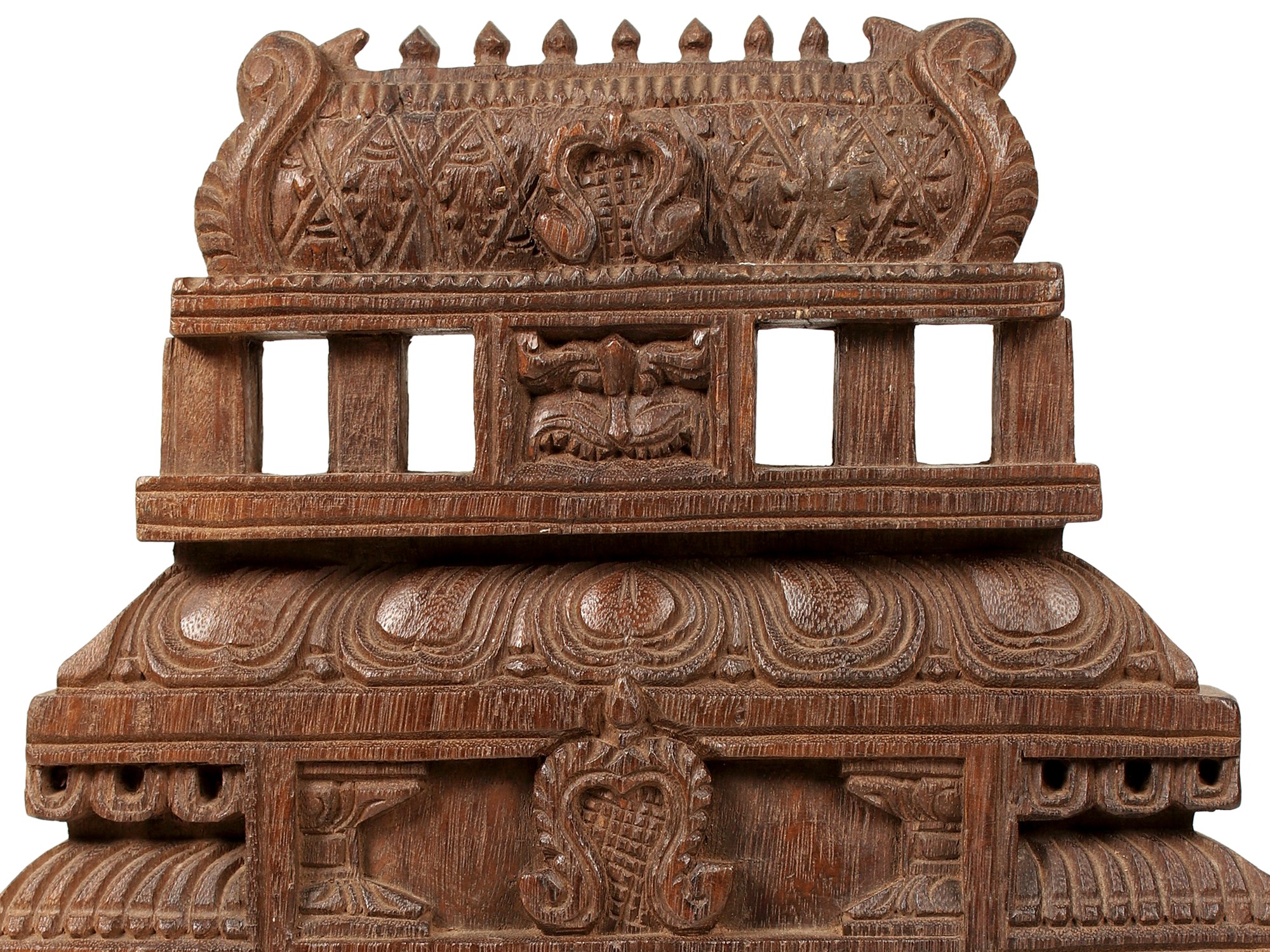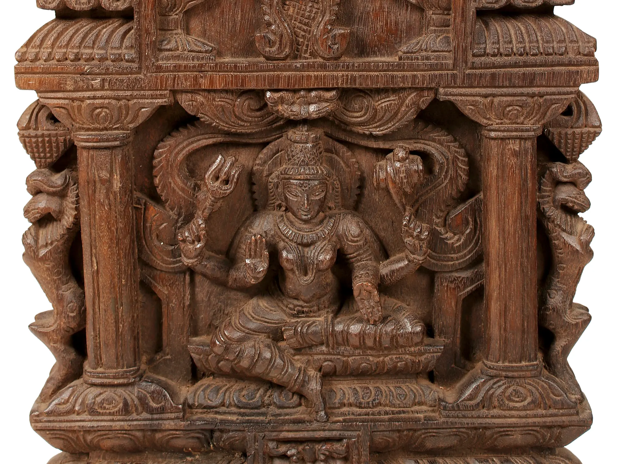 Elevate your space with this exquisite wooden wall panel, a testament to traditional craftsmanship and spiritual devotion. At its heart resides a beautifully carved depiction of Goddess Parvati, the divine consort of Lord Shiva and the mother of the universe. Seated in a posture of serene contemplation, she is adorned with intricate jewelry and emanates an aura of grace and power. Her presence is often associated with fertility, love, devotion, and strength, making her a revered figure in Hindu mythology. The panel itself is a masterpiece, designed to resemble a miniature temple or chariot, known as a "Kavadi." This architectural style, reminiscent of ancient South Indian temple gopurams, showcases a wealth of detail and symbolism. The central niche where Parvati is seated is framed by intricately carved pillars and decorative motifs, creating a sense of depth and grandeur. Look closely, and you will discover representations of mythical serpents, often associated with protective energies and the divine feminine, flanking the goddess. The upper portion of the panel features tiered levels with openwork detailing, suggesting the celestial realms or the many mansions of the gods. The base of the panel is equally impressive, featuring scrolling foliage and ornate carvings that add to its visual appeal and structural integrity. The entire piece is carved from solid wood, lending it a natural warmth and a timeless quality. The rich, aged patina of the wood speaks of its heritage and the care with which it has been preserved. This wall panel is more than just a decorative item; it's a piece of art imbued with spiritual significance, designed to bring a sense of peace, prosperity, and divine blessing to any home or sacred space.