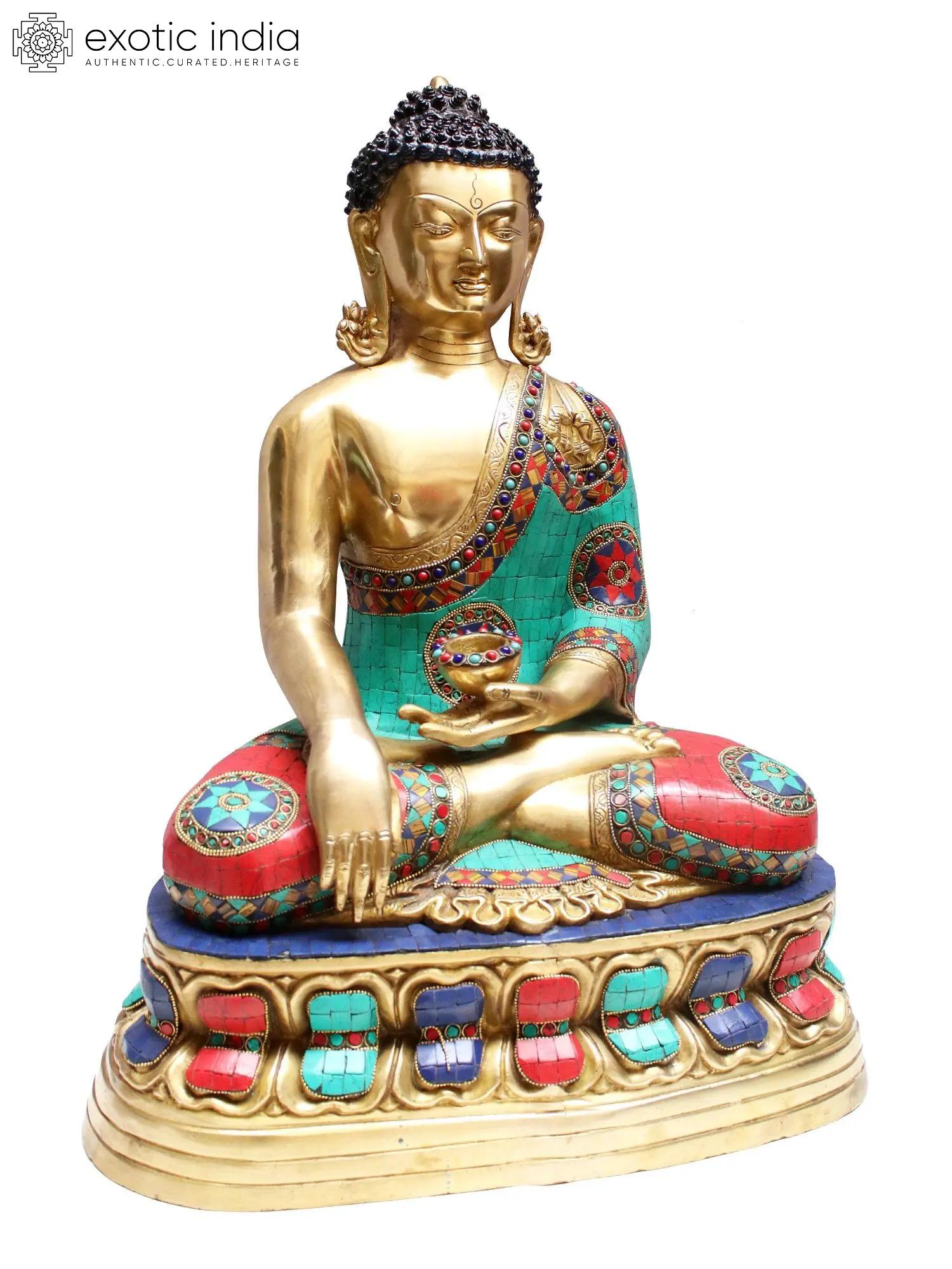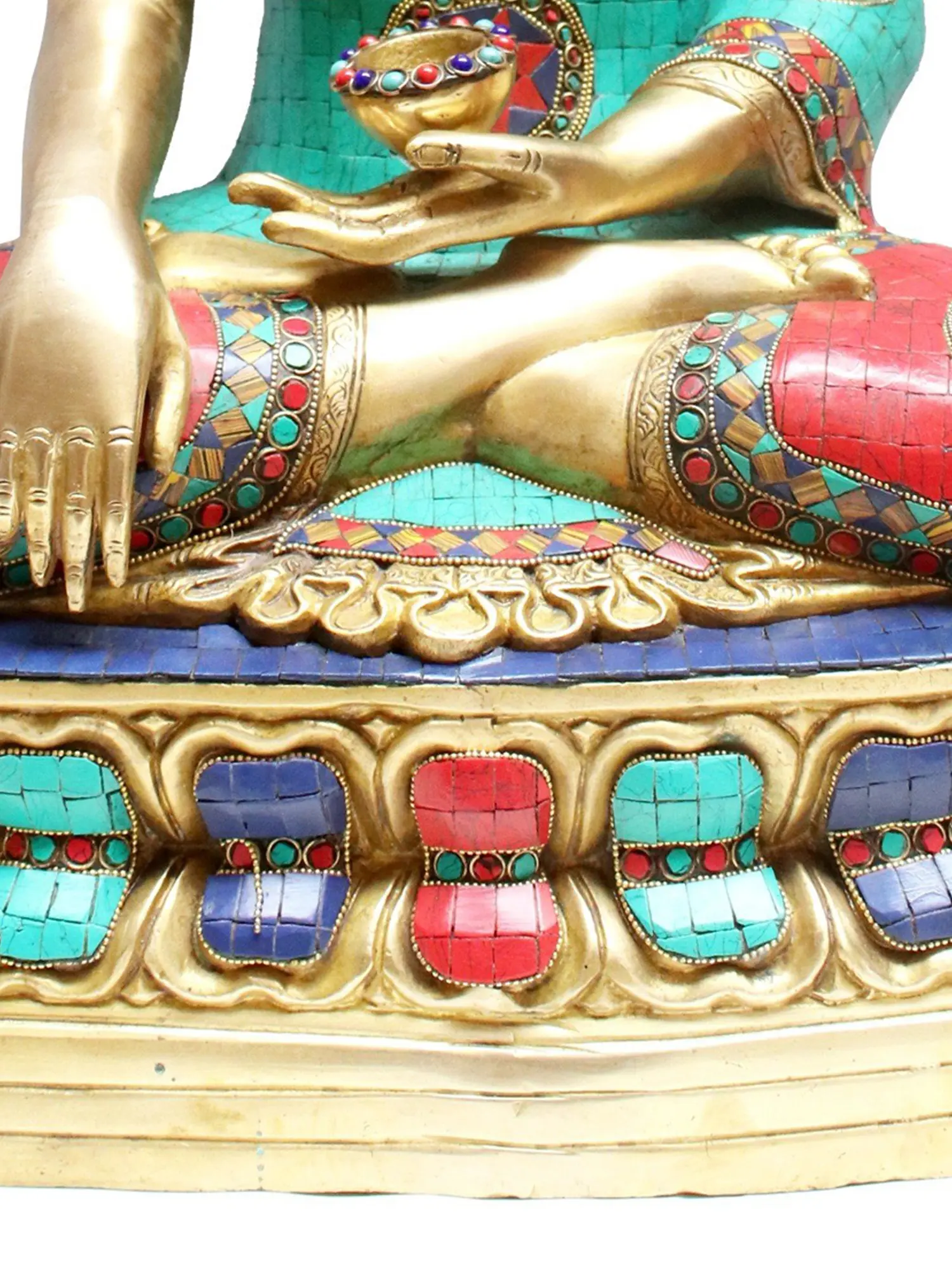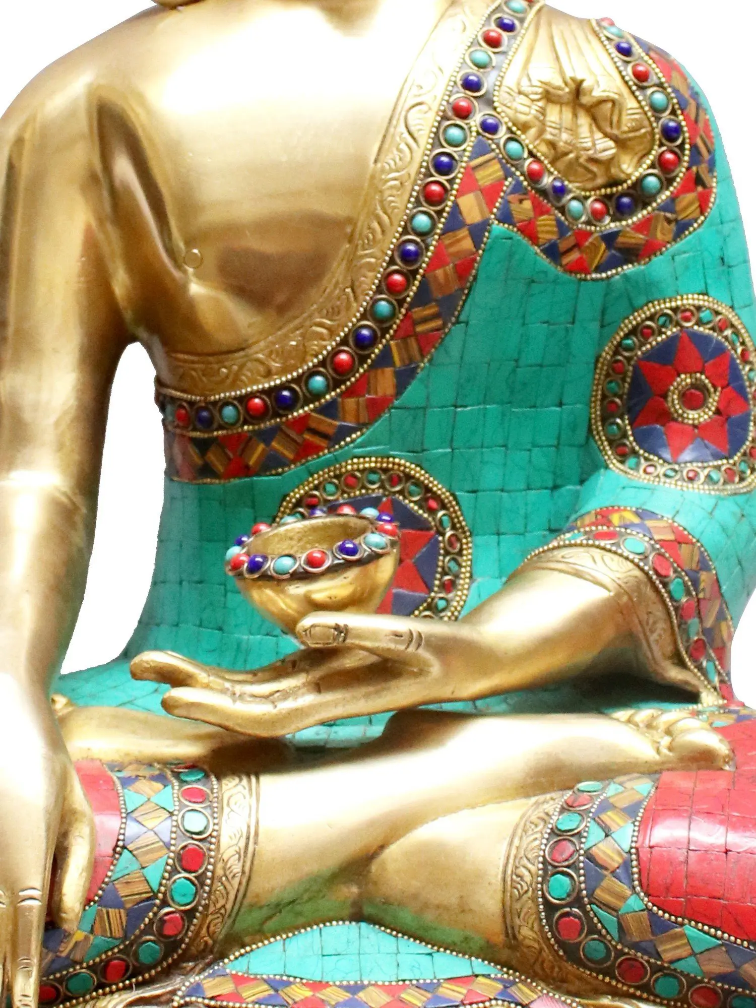 Crafted from high-quality brass, this statue is a testament to masterful artistry. The lustrous gold finish of the Buddha's form exudes serenity and divine presence. The true marvel of this piece lies in its intricate inlay work, which elevates it beyond a mere representation to a work of art. Vibrant, precisely cut pieces of turquoise, coral, and other semi-precious stones are meticulously embedded into the Buddha's robes and the base. The rich teal of the robes, adorned with concentric circular patterns and a border of colorful beads, creates a visually stunning effect. The lap and the lotus-like base are also embellished with these precious stones, adding layers of depth and opulence. This decorative technique not only enhances the aesthetic appeal but also subtly suggests the richness and multifaceted nature of the Dharma. ––––––––––––––––––