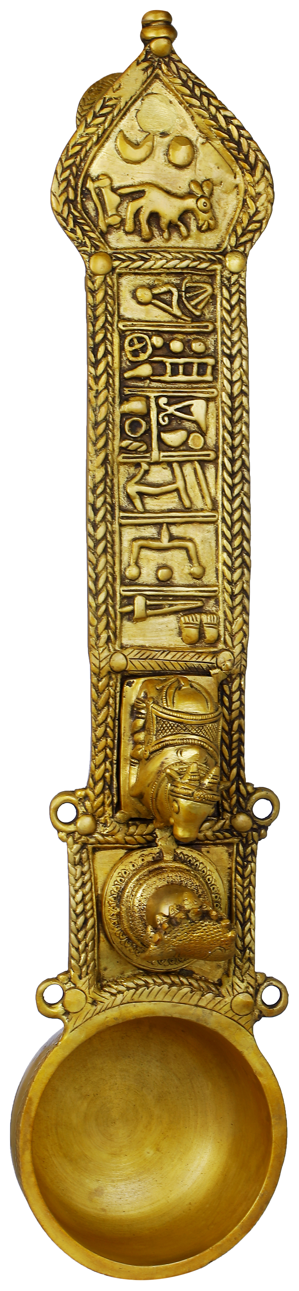 Presenting you the enchanting world of the Large Size Ritual Spoon, known as the Uddharani, adorned with figures of Nandi and the Shiva Linga, lovingly handcrafted in brass and hailing from the artistic heart of India. Imagine a piece that bridges the earthly and the divine, crafted in the very land where spirituality and art intertwine. This remarkable Ritual Spoon, the Uddharani, is not just an artifact, it's a testament to the profound connection between art and spirituality, all born in the heart of India.