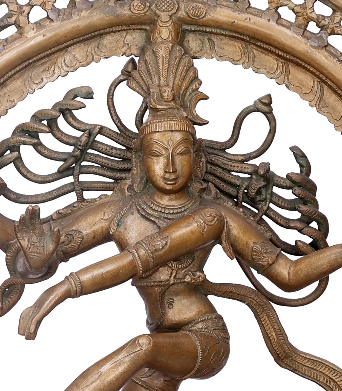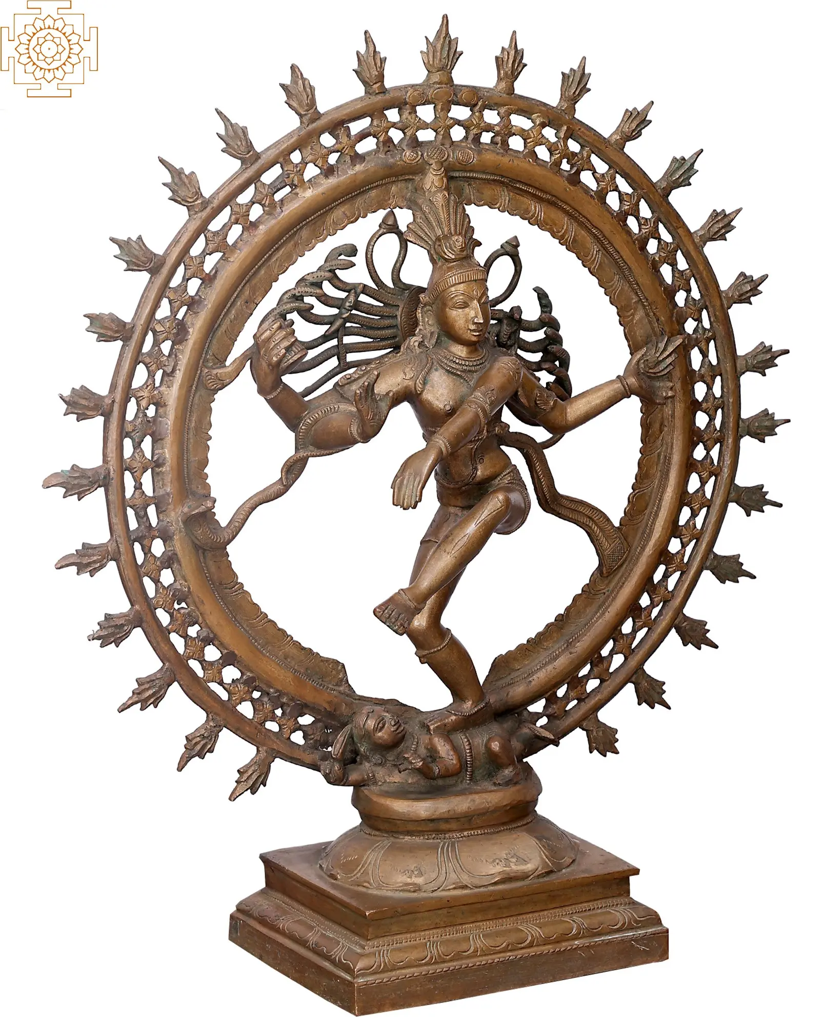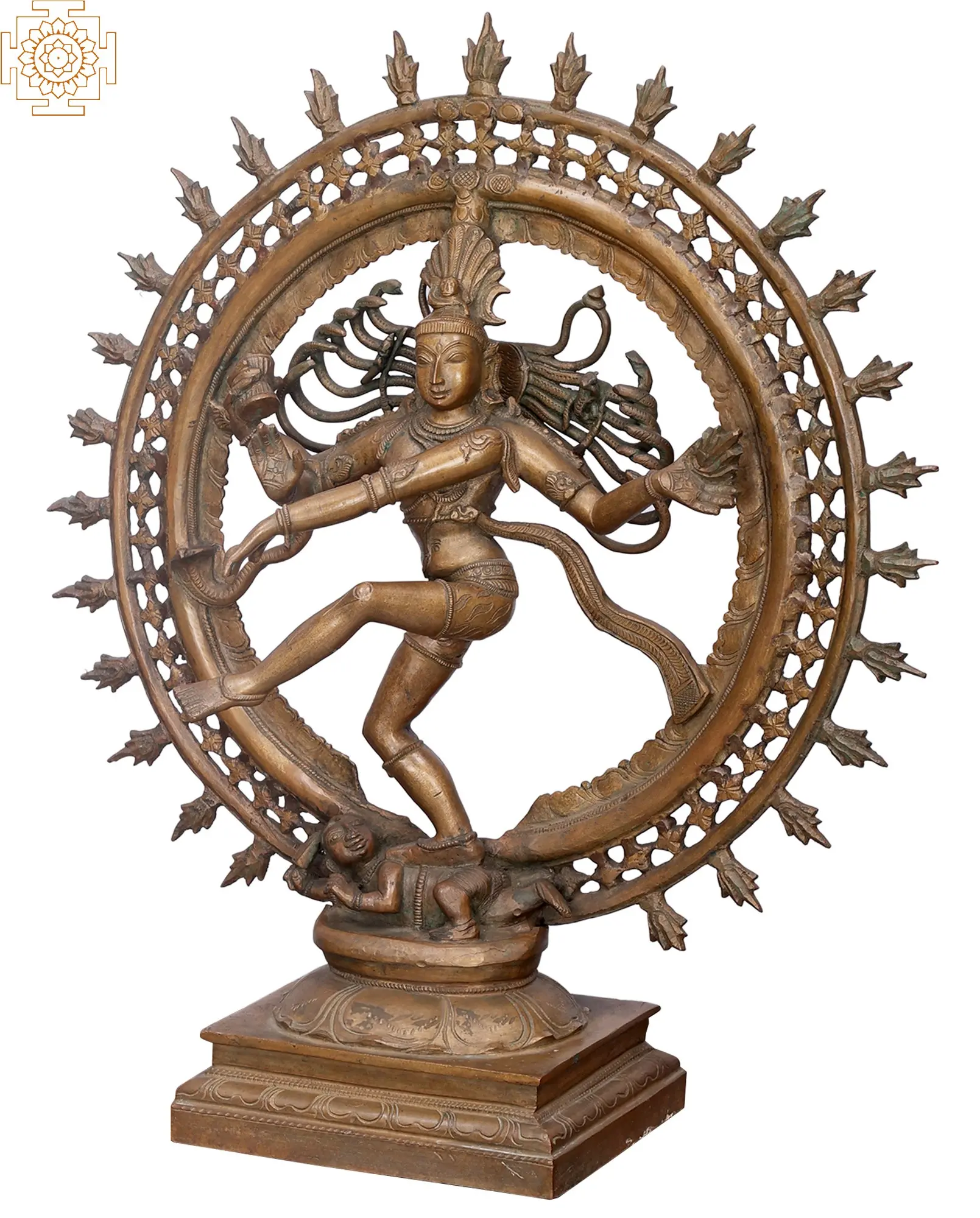 This magnificent bronze sculpture captures the essence of Lord Shiva as Nataraja, the Lord of Dance. Rendered in the ancient and revered Panchaloha (five-metal alloy) bronze, a traditional mixture of gold, silver, copper, zinc, and tin, this piece is a testament to centuries of artistic and spiritual heritage. Each detail is brought to life through the intricate Madhuchista Vidhana, or lost-wax casting method, a technique perfected by artisans in Swamimalai, a region renowned for its metalcraft. The Nataraja form embodies the cyclical nature of the universe – creation, preservation, and destruction. Shiva's Tandava dance, depicted here, is not a dance of rage but a powerful cosmic ballet that sustains the universe and obliterates illusion. The ring of fire surrounding him symbolizes the boundless energy of the cosmos, the cycle of birth and death, and the dissolution of all things. Within this fiery halo, the intricate filigree work speaks to the delicate balance and interconnectedness of existence. ––––––––––––––––––––