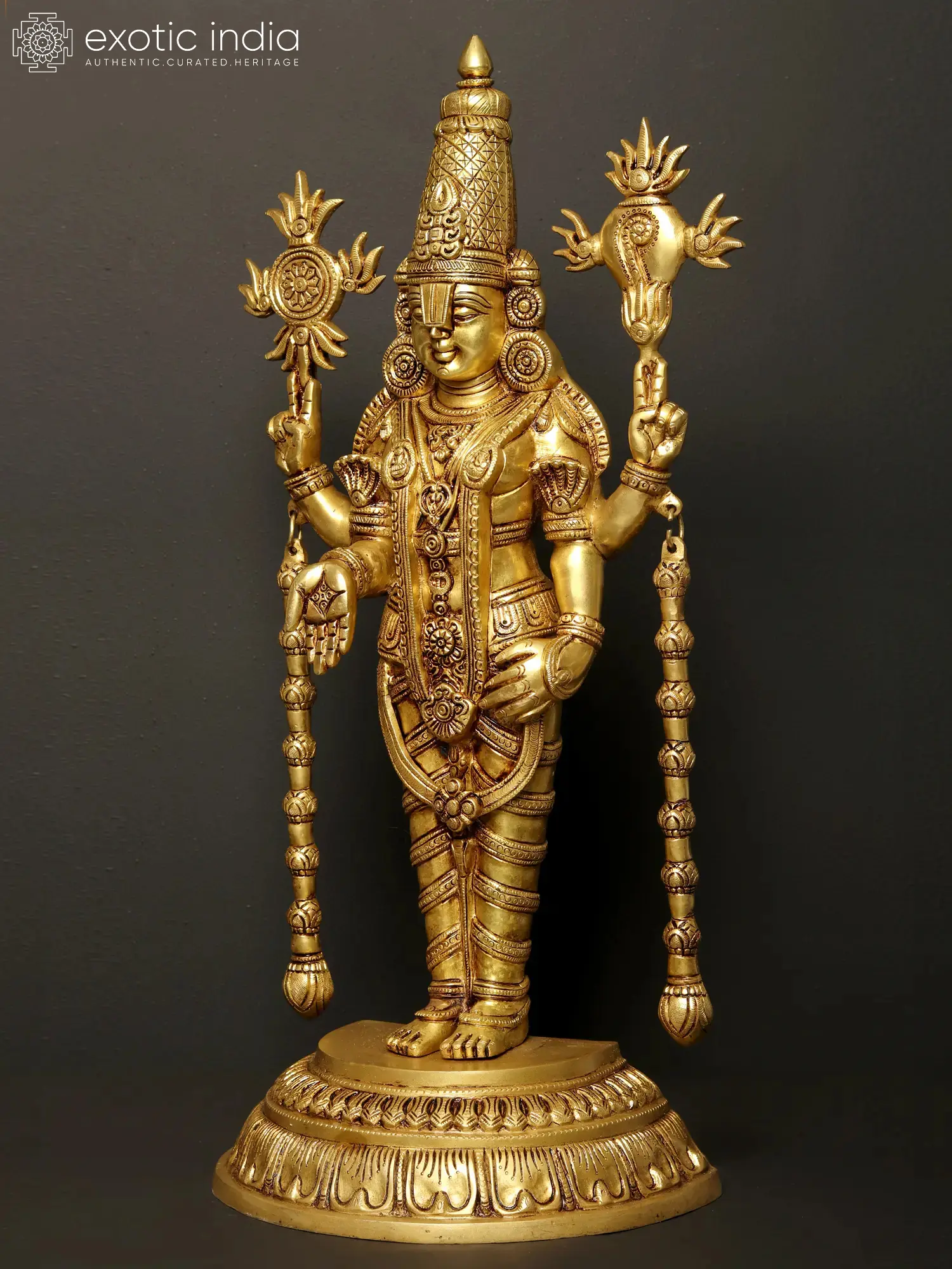 This Venkateshvara idol made of brass is rich with symbolism and sacred significance. Depicted as a standing figure, Lord Venkateswara is shown with four hands, holding a discus (Sudarshana Chakra) and a conch shell (Shankha) in his upper hands, symbolizing his divine power and protection. His lower hands are depicted in the Katihasta (Hand resting on the lap) mudra and varada mudra (granting boons). The artist has surpassed his art by depicting the fine folds of the Paridhana (lower garment). The golden borders of the paridhana are also depicted with precision. The fine ornamentation dangling from the wrists of the deity are giving a sense of opulence. Lord Venkateswara's face radiates serenity and compassion, with expressive eyes and a gentle smile.