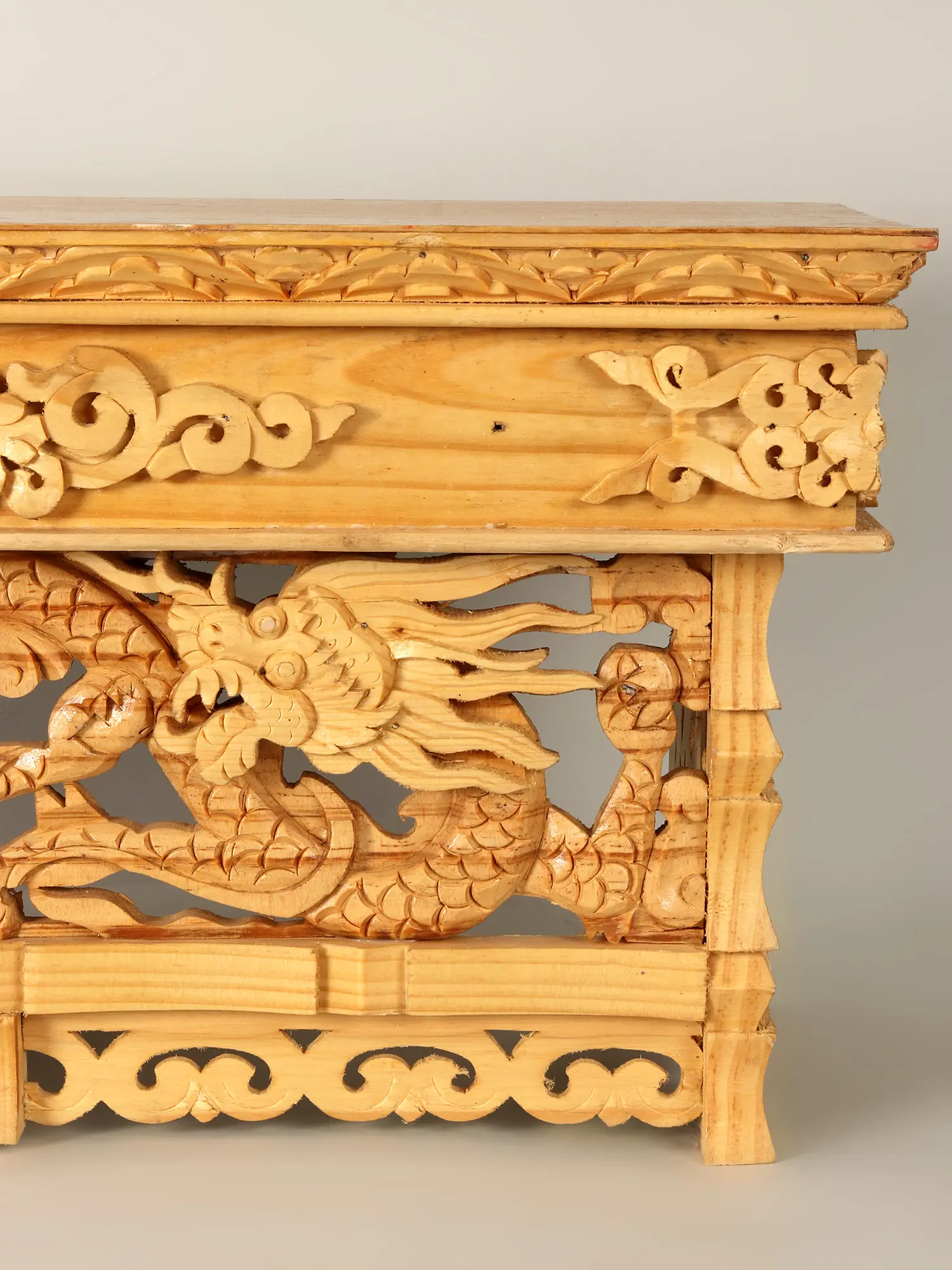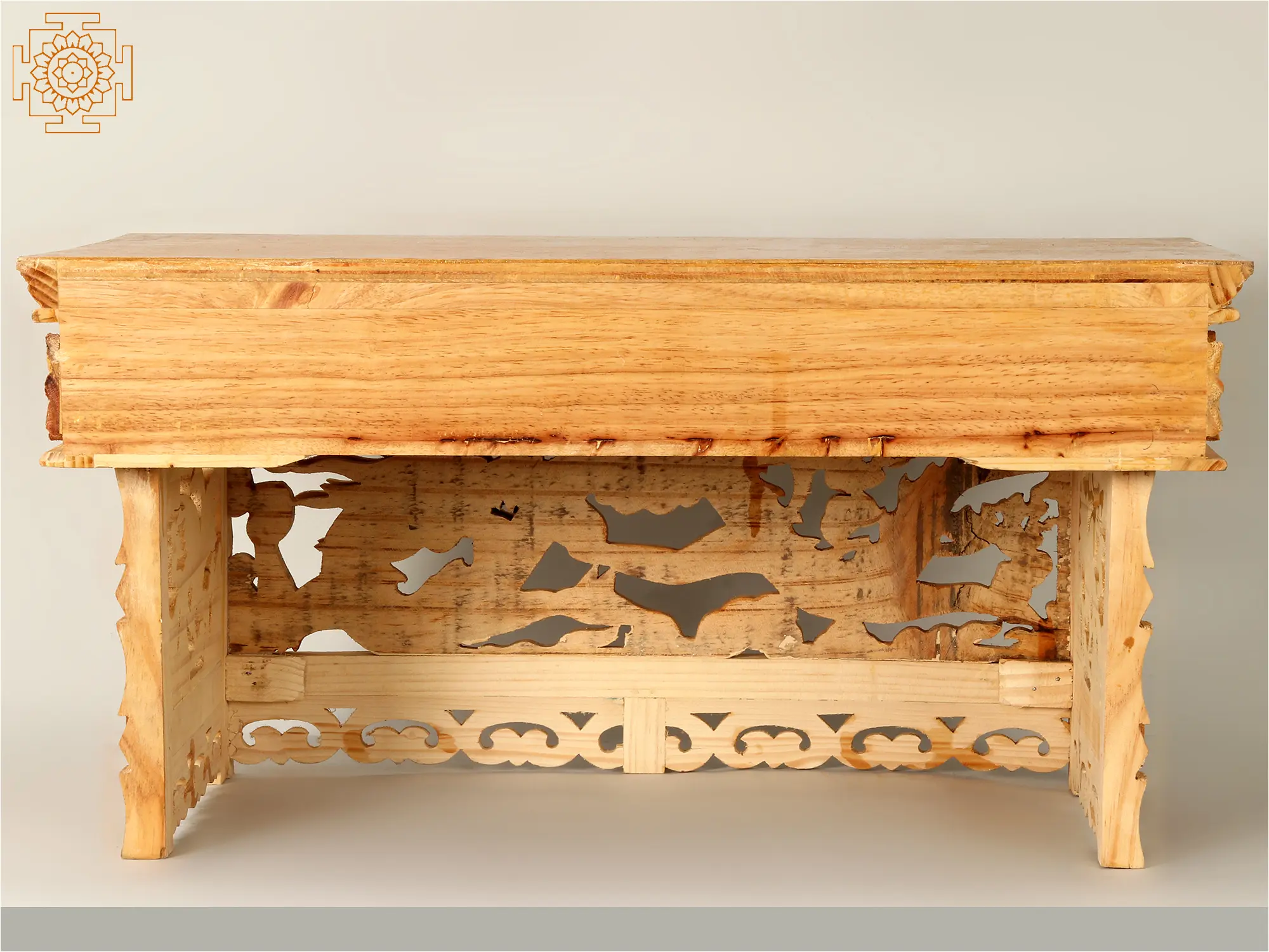 The wooden sculpture you see on this page doubles as a ritual pedestal (pooja chowki) and an elevated altar. As an altar, it could be used to arrange all your favourite deities across the smooth, natural-finish surface. Alternatively, it may serve as a plinth for a large, singular deity.