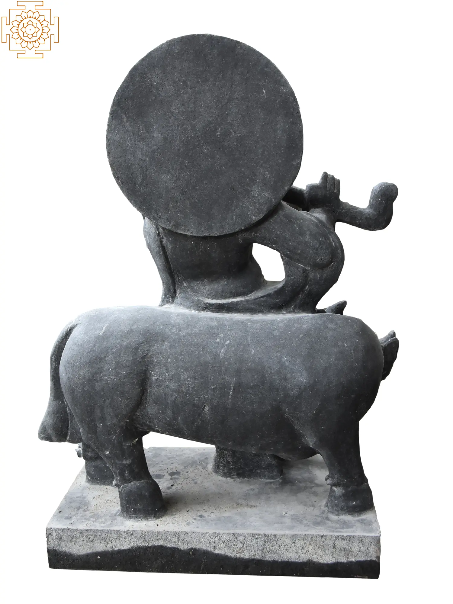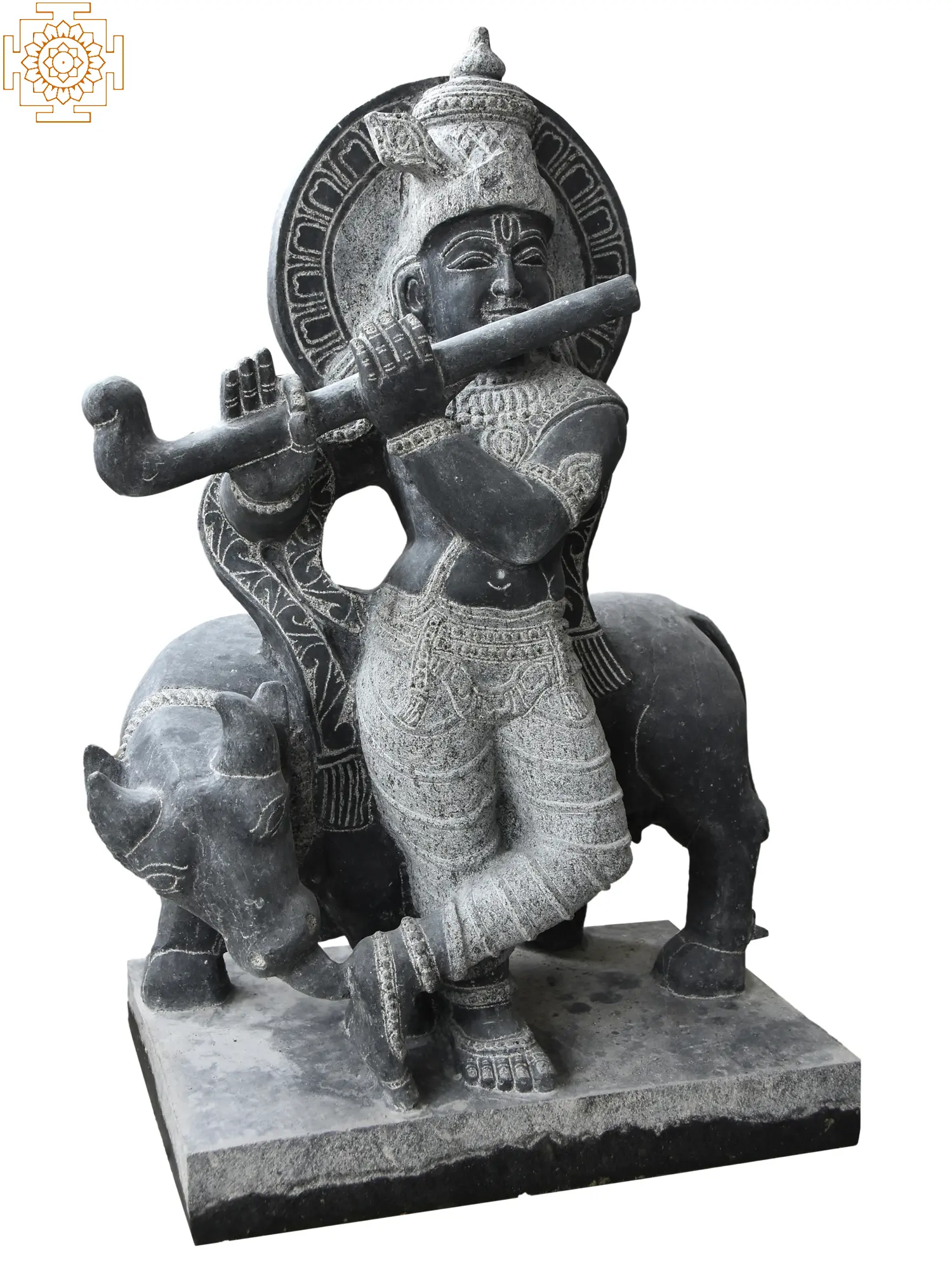 The harmonious symphony of love, Krishna's flute enchants the world, and his divine bond with the cow nourishes our souls. Captured in timeless granite, this finely carved statue brings forth the joyous spirit of Krishna, the eternal lover, and the mischievous divine child. As Krishna plays his enchanting flute, the cow, a symbol of motherly love, listens with devotion. The sculpture echoes the melody of interconnectedness and love that reverberates through the cosmos. This exquisite artwork can grace your space and radiate a reflection of the blissful unity between nature and the divine.