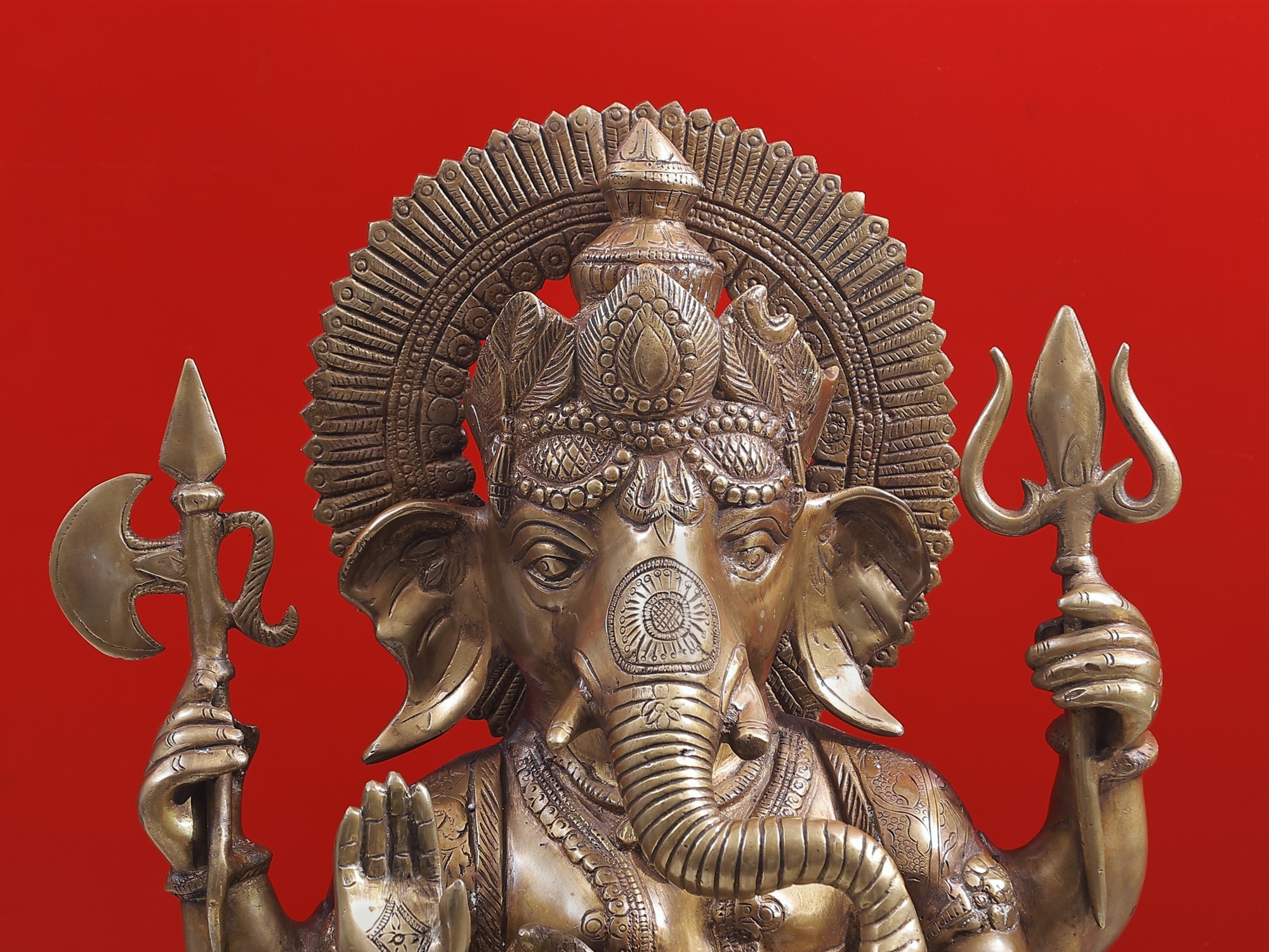 Apart from this, this Chaturbhuja handed form of Ganapati is the source of all forms of Ganesha as it is widely worshipped and also holds the symbolic and spiritual importance. He holds an axe, a Trishula and enjoys a Laddoo from his trunk. He poses an abhaya mudra with his lower right hand.