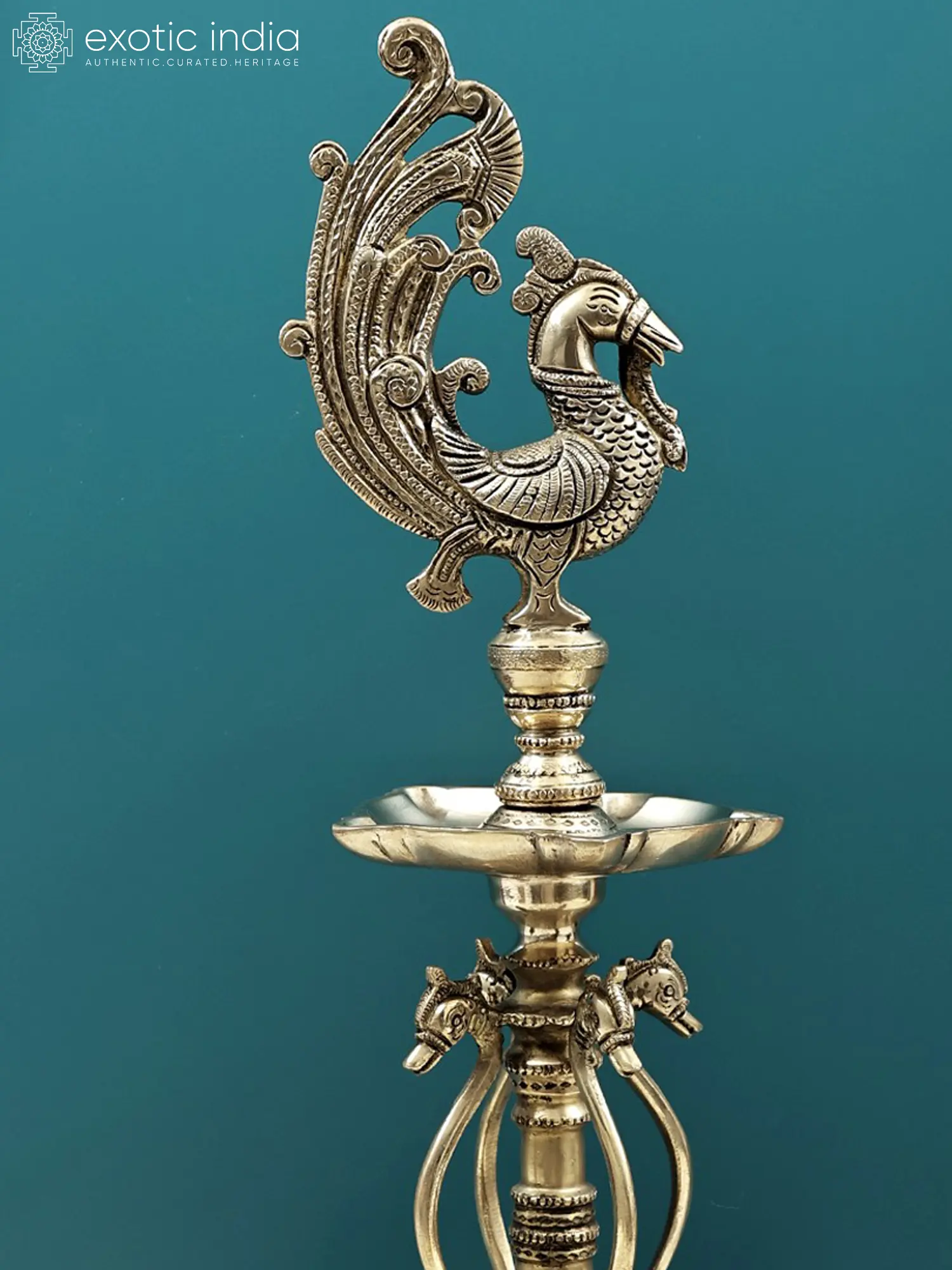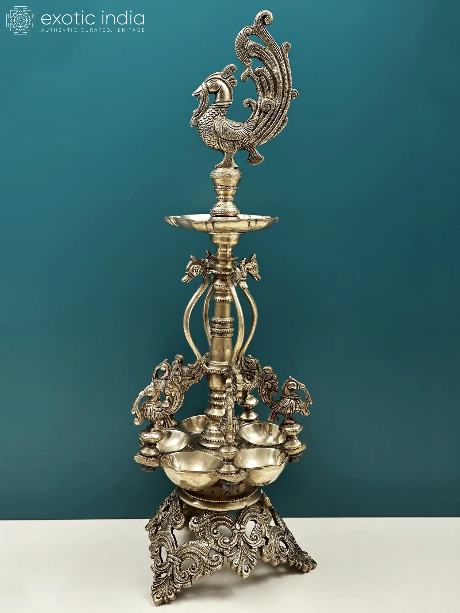 This exquisite lamp, crafted from luminous brass, stands as a testament to masterful artistry and spiritual significance. Standing tall at an impressive height, it is designed to be a centerpiece, an object of reverence, and a source of gentle, illuminating warmth. The lamp's design is deeply rooted in the rich tapestry of Indian culture and mythology, drawing inspiration from the majestic peacock, a creature often associated with divine beauty, grace, and auspiciousness. In Hindu mythology, the peacock is the celestial vehicle of Lord Kartikeya, the god of war and victory, and is also linked to the goddess Saraswati, the patron of arts, music, and knowledge, as well as the goddess Lakshmi, representing wealth and prosperity. Its vibrant plumage is seen as a symbol of the cosmic eye, observing the universe, and its dance is often interpreted as a harbinger of rain and renewal.
