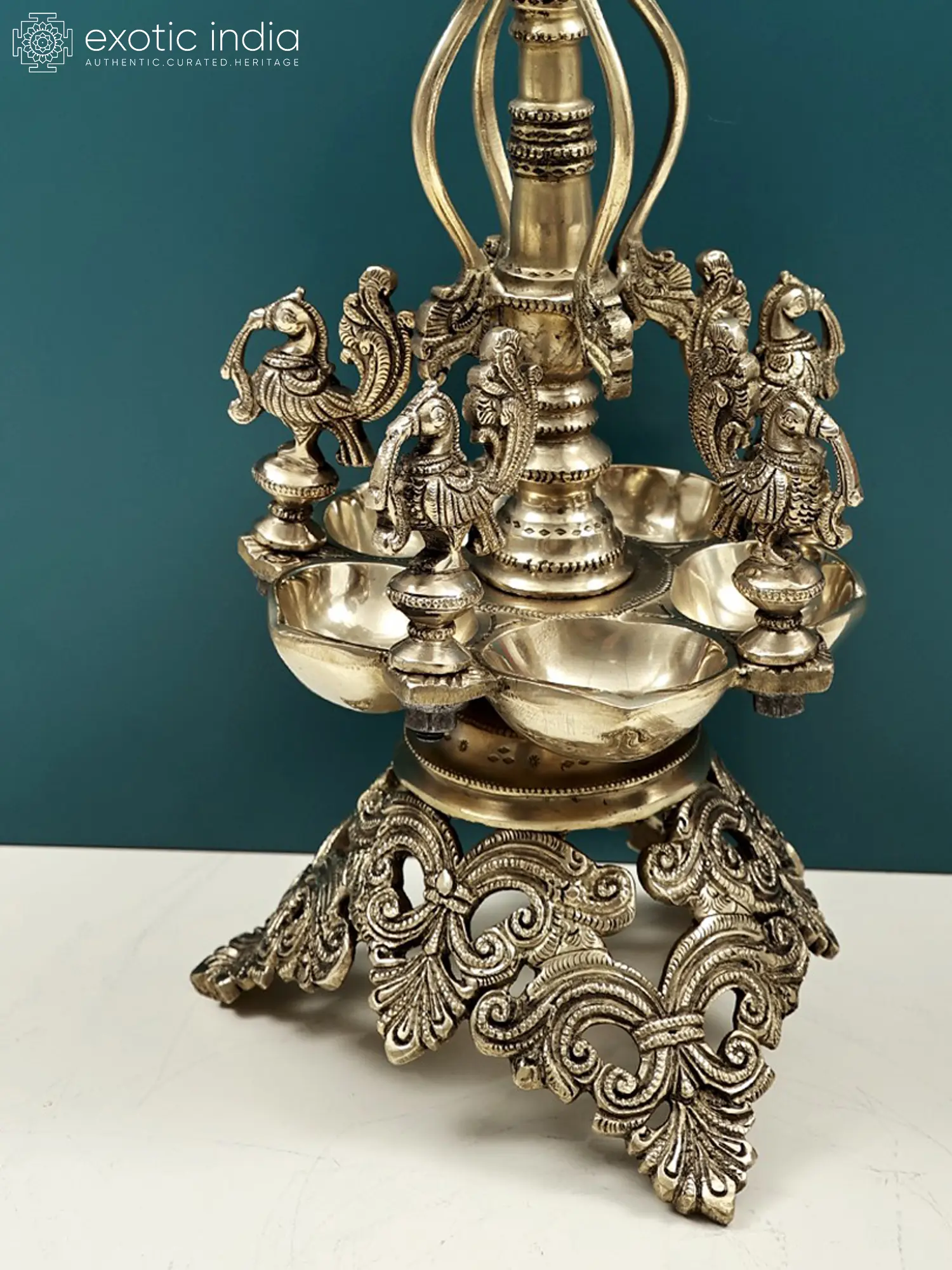 The form of this lamp is a visual poem. At its apex, a beautifully rendered peacock gracefully arches its neck, its intricately detailed feathers fanning out, capturing the essence of its natural splendor. Below this regal bird, a tiered structure unfolds, each level adorned with meticulous craftsmanship. The lamp features a generous platform designed to hold five wicks, allowing for a significant and steady diffusion of light. Surrounding the central column, small, charming figures of peacocks add to the overall aesthetic, creating a sense of divine company and enchantment. The base of the lamp is a marvel of intricate scrollwork and floral motifs, providing a stable and ornate foundation that speaks of enduring elegance and traditional design. The rich, warm hue of the brass enhances the lamp's opulent feel, making it a truly captivating object.