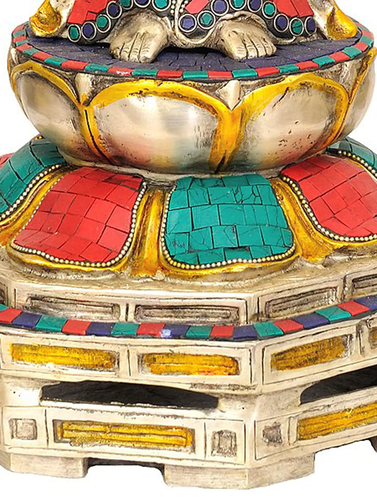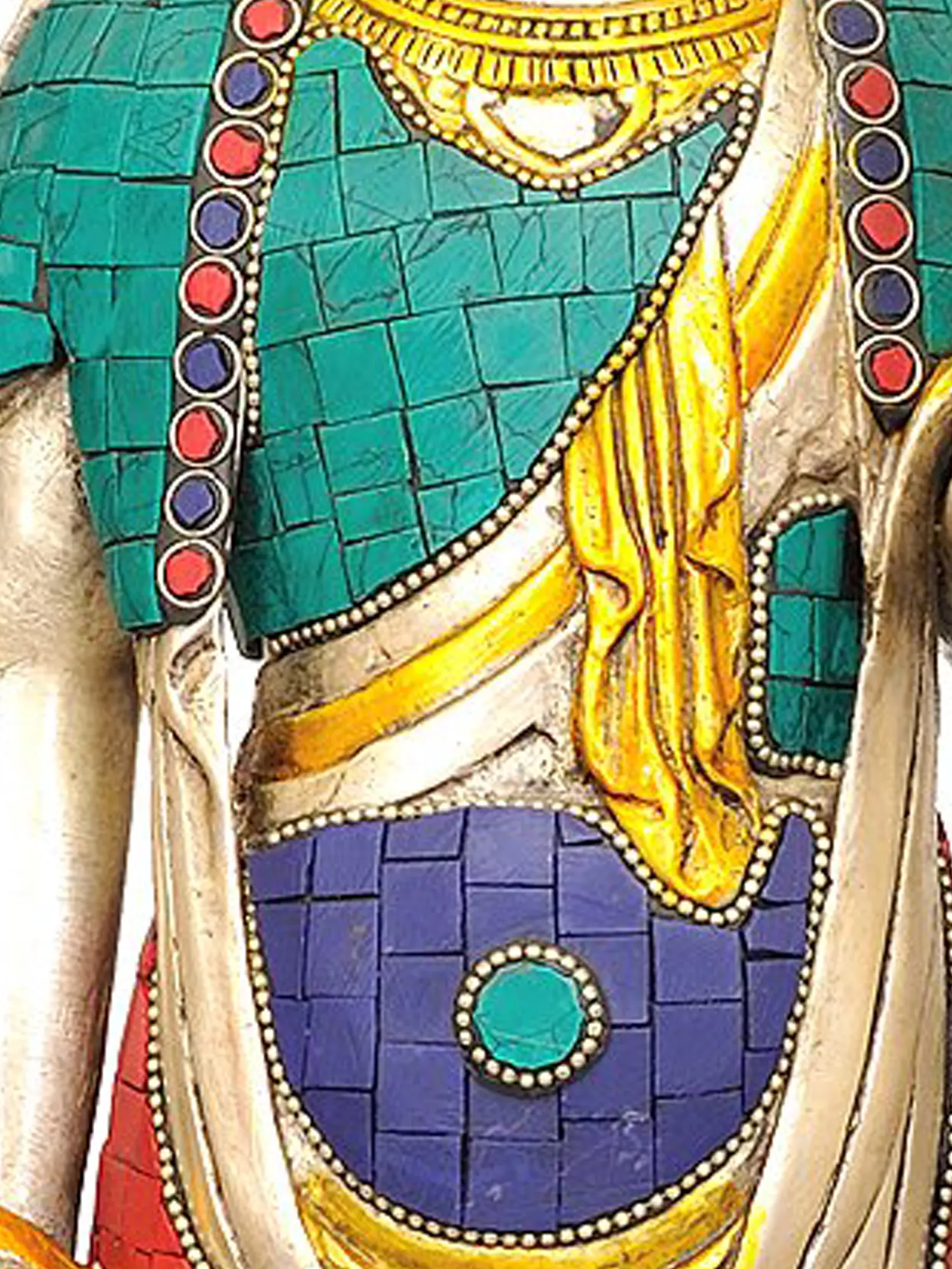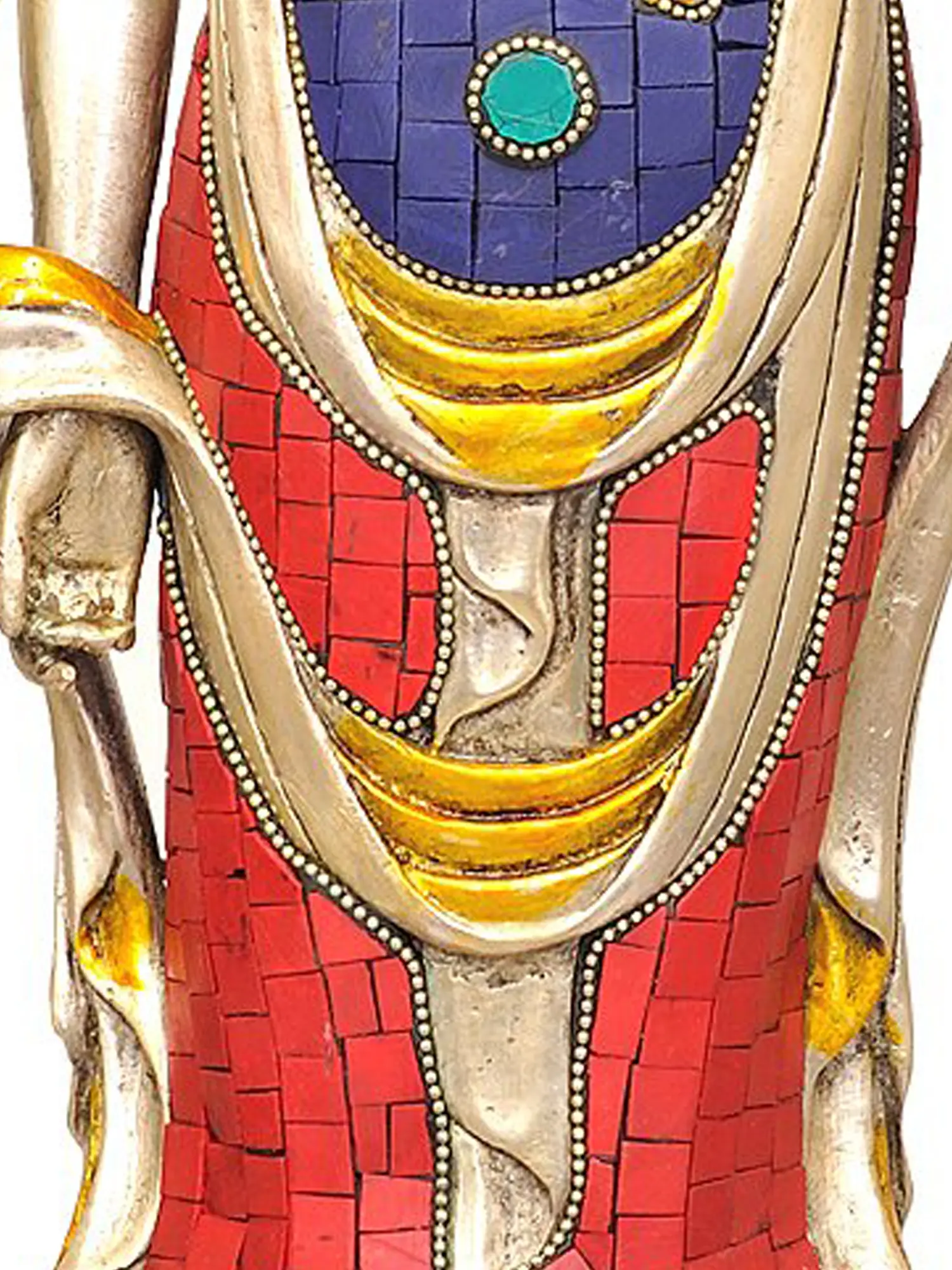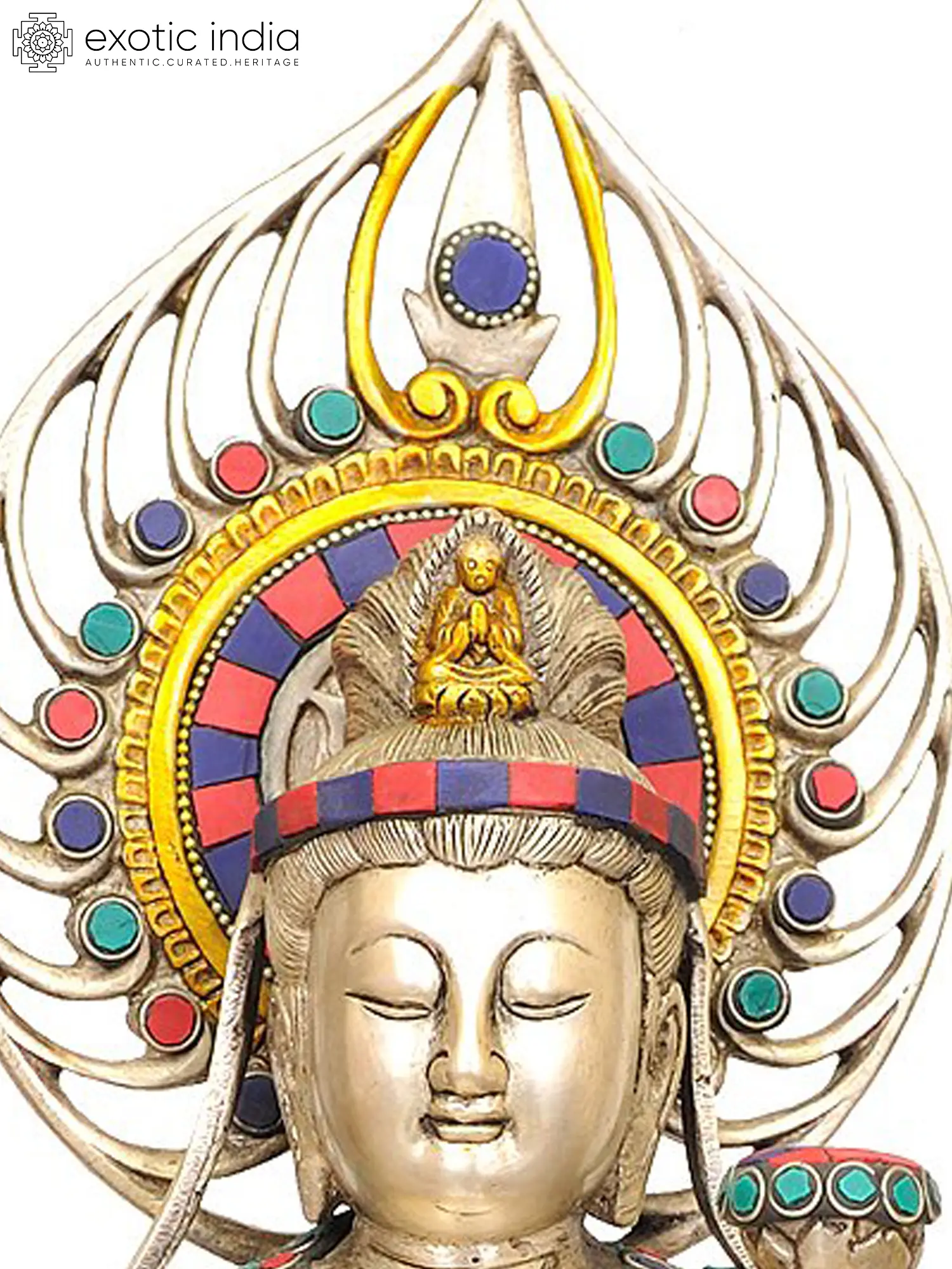 The statue is crafted from high-quality brass, a material traditionally associated with purity and durability in Indian art. What sets this particular rendition apart is its breathtaking inlay work, featuring vibrant turquoise and carnelian stones meticulously set into the brass. The turquoise, reminiscent of the boundless sky and pure water, symbolizes clarity and healing, while the deep red of carnelian evokes vitality and courage. Kuan Yin is depicted with her characteristic gentle expression, eyes downcast in meditative contemplation. She holds a lotus flower, a potent symbol in Buddhism representing purity, spiritual awakening, and the ability to rise above worldly attachments. The elaborate halo behind her head signifies her spiritual radiance and enlightenment. ––––––––––