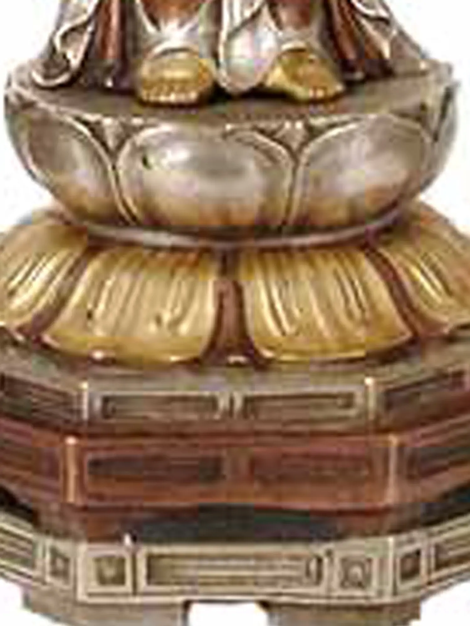 This exquisite 23.5-inch tall Kuan Yin statue is a testament to the rich artistic heritage of India. Hand-crafted from high-quality brass, each intricate detail—from the delicate folds of her robe to the serene expression on her face—has been meticulously carved by skilled artisans. The warm, rich tone of the brass enhances the statue's spiritual aura, giving it a timeless quality. The use of brass, a material long associated with strength and resilience in many cultures, adds another layer of symbolism to the piece. The base of the statue is equally well-crafted, with layered details that add to the overall elegance and grandeur of the piece.
