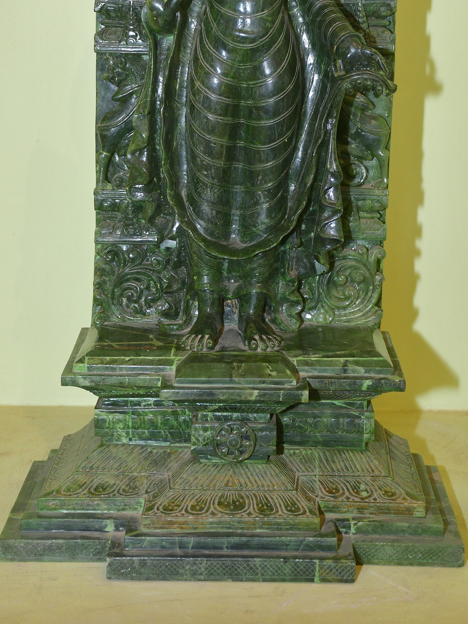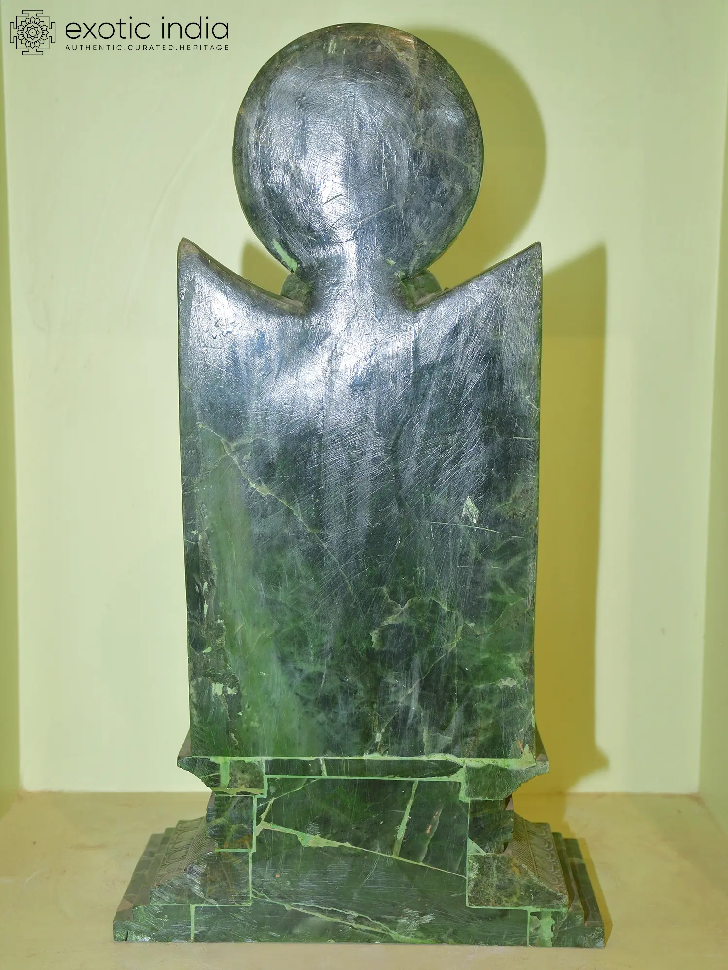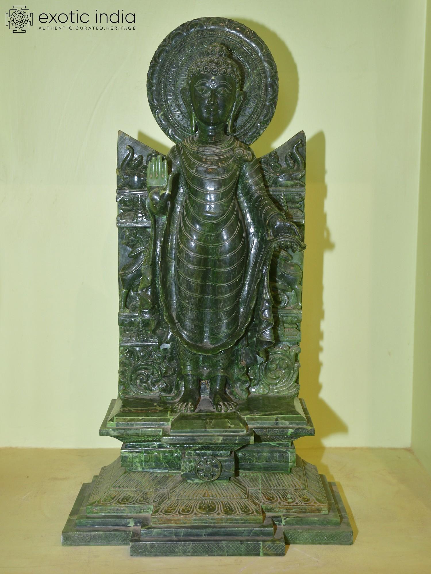 The choice of stone from Odisha is significant, linking this artwork to a lineage of spiritual and artistic expression. The region has been a cradle of various religions and their art forms, including Buddhism, Jainism, and Hinduism, for millennia. The stone itself, with its deep green tones and natural veining, lends a unique character to each sculpture. The smooth, polished finish enhances the play of light and shadow, bringing the divine form to life. The detailed carvings on the pedestal and the background panel, often incorporating floral motifs, mythical creatures, or symbolic representations, further enrich the narrative and visual appeal of the artwork. This statue is not merely an object of devotion but a masterpiece of craftsmanship, carrying the weight of history, spirituality, and artistic excellence. It invites contemplation, fosters peace, and serves as a constant reminder of the path to enlightenment.