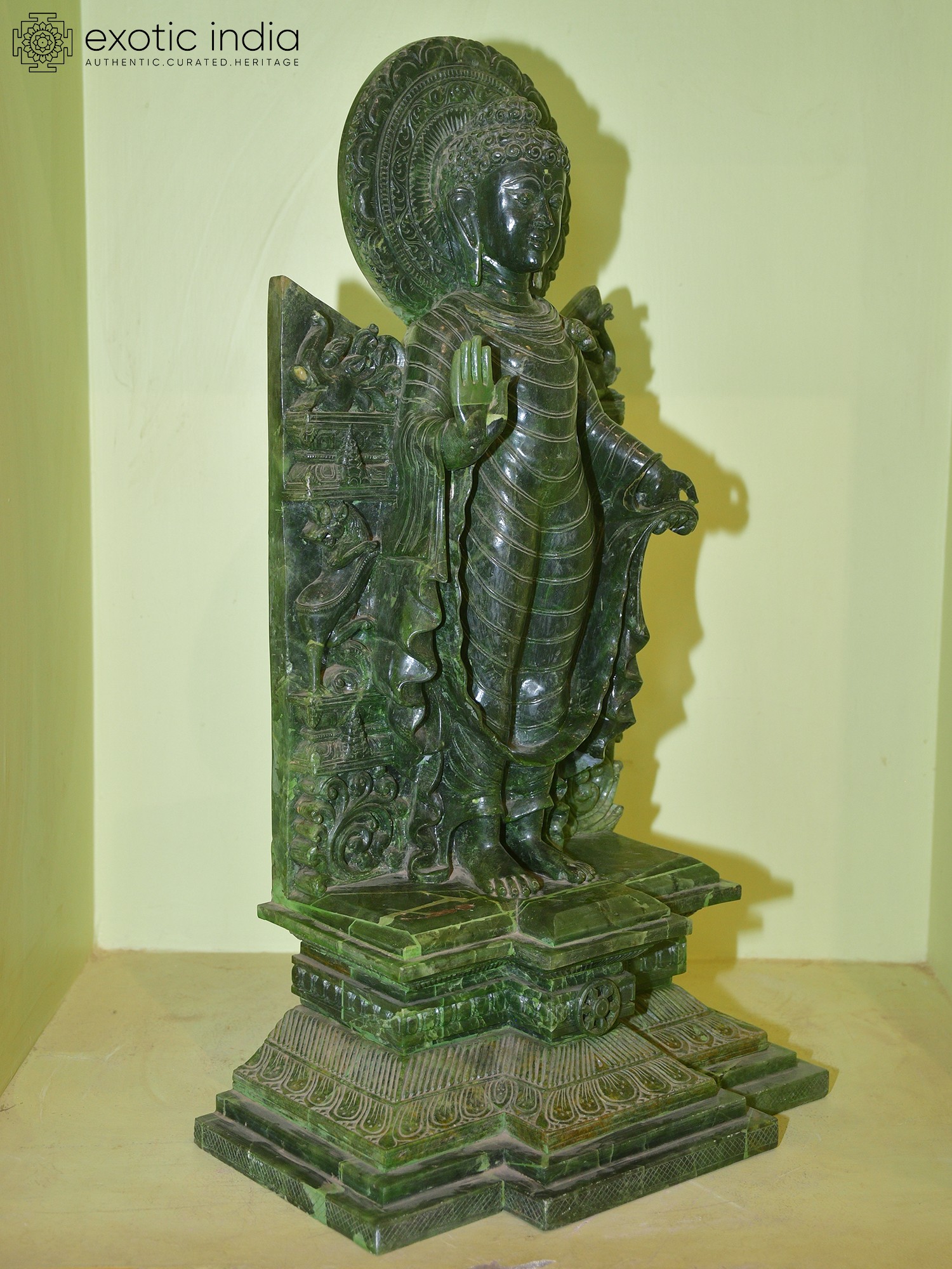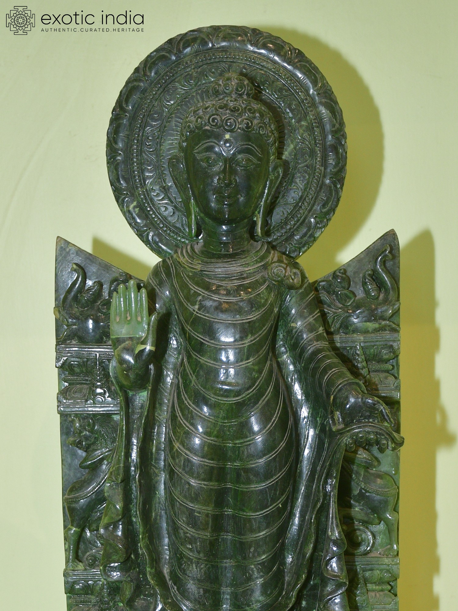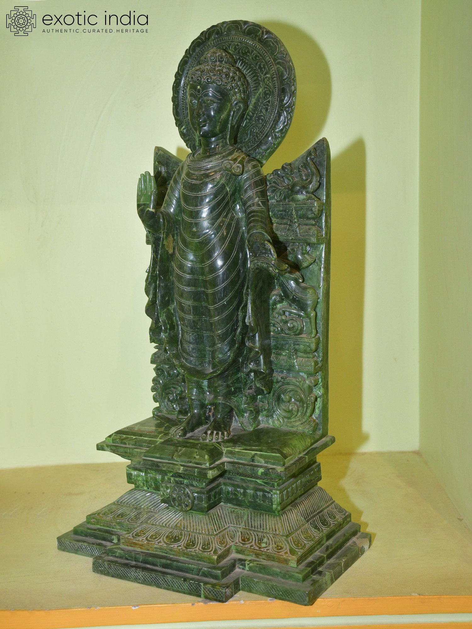 This exquisite hand-carved statue, hewn from deep green stone, captures the benevolent presence of Lord Buddha in a gesture of profound blessing. The standing posture, a powerful representation of his enduring teachings, exudes an aura of peace and compassion that can transform any space into a sanctuary of mindfulness. The verdant hue of the stone evokes nature's own serenity, mirroring the tranquility Buddha sought and ultimately attained, and which he so generously offers to the world. Originating from the rich artistic traditions of Odisha, India, renowned for its skilled stonemasons and ancient sculptural heritage, this piece embodies centuries of spiritual devotion. The meticulous detailing, from the serene countenance of the Buddha to the intricate folds of his monastic robes, speaks of a craftsman's deep understanding and reverence for the subject. The circular *ushnisha*, a cranial protuberance symbolizing Buddha's wisdom, and the delicate *urna*, the tuft of hair between his eyebrows representing his spiritual insight, are rendered with profound attention.