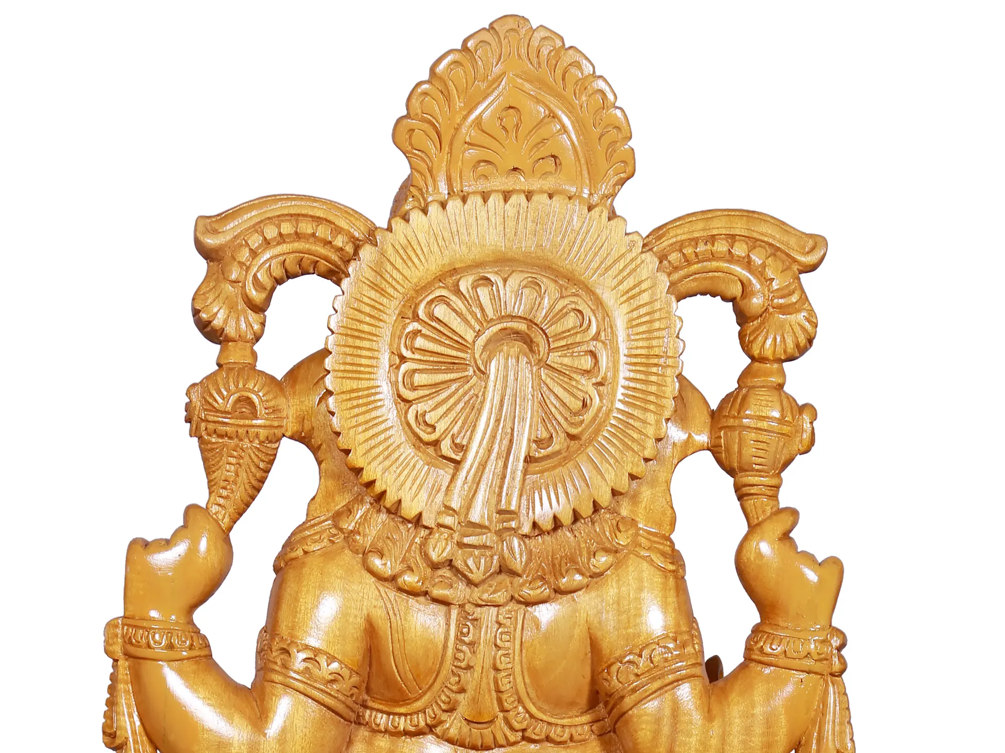 Invite the auspicious presence of Lord Ganpati, the remover of obstacles and the bestower of wisdom and prosperity, into your home with this exquisite wooden sculpture. Crafted with meticulous attention to detail from fine whitewood, this statue captures the serene and powerful essence of the beloved elephant-headed deity. Standing tall on an intricately carved pedestal, this representation of Lord Ganpati is a testament to masterful craftsmanship and deep spiritual devotion.