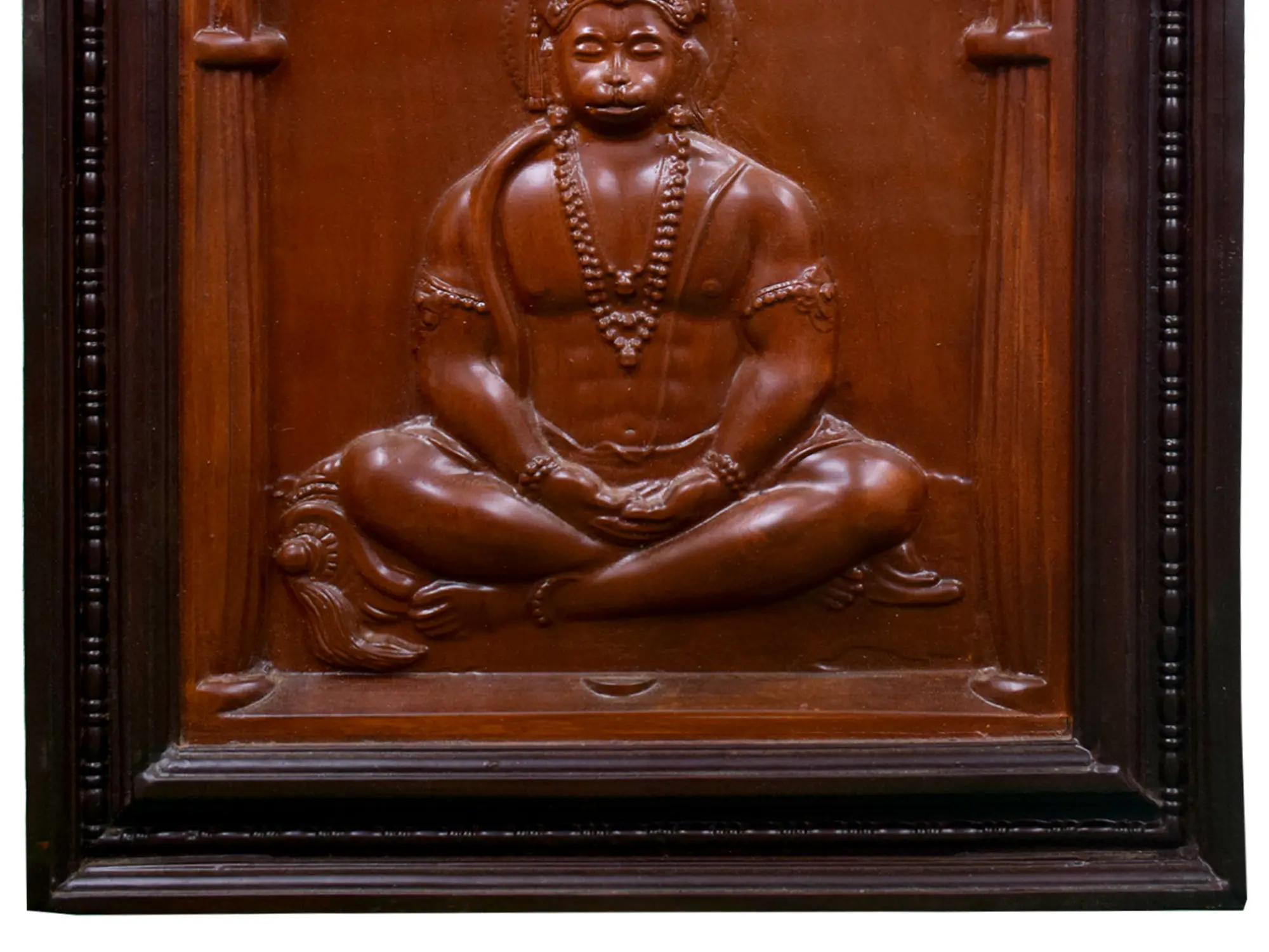 This beautifully crafted piece serves as a powerful reminder of the values that Hanuman represents: devotion, strength, integrity, and humility. Whether displayed in a meditation room, living area, or as a focal point in your puja space, this framed relief is more than just a decorative item; it is a conduit for peace and spiritual reflection. The natural beauty of the carved wood, combined with the powerful imagery of Hanuman in meditation, creates a piece that resonates with both aesthetic appeal and deep spiritual meaning. It is a testament to the enduring artistry of traditional carving and a cherished embodiment of a divine hero revered across generations.