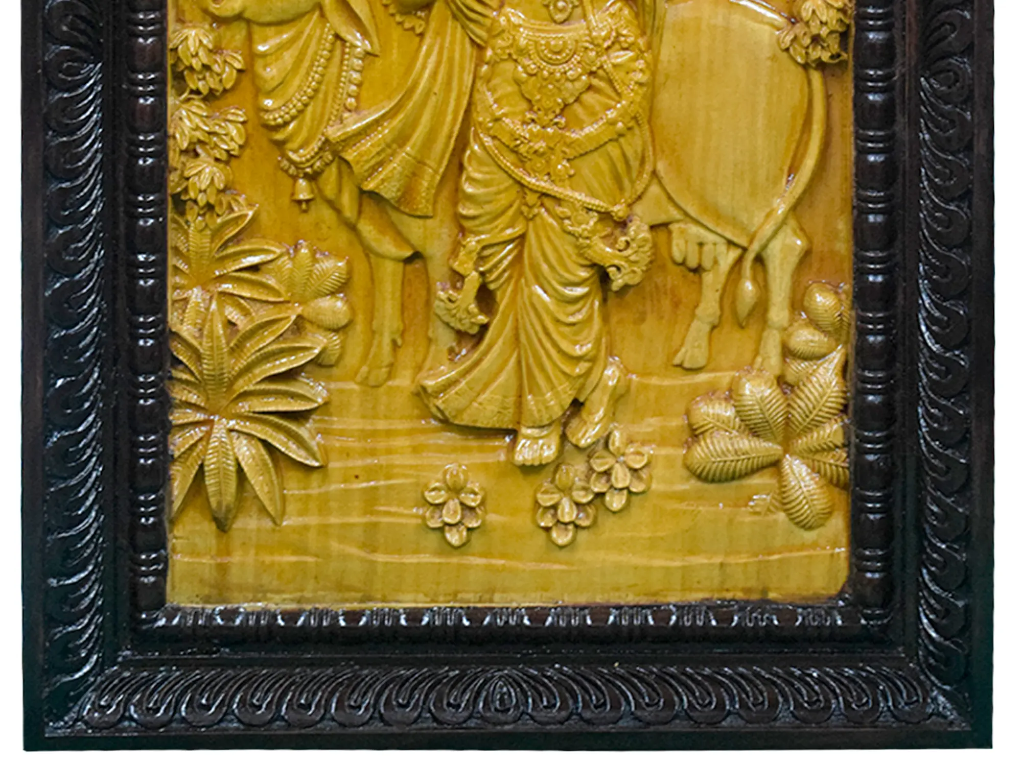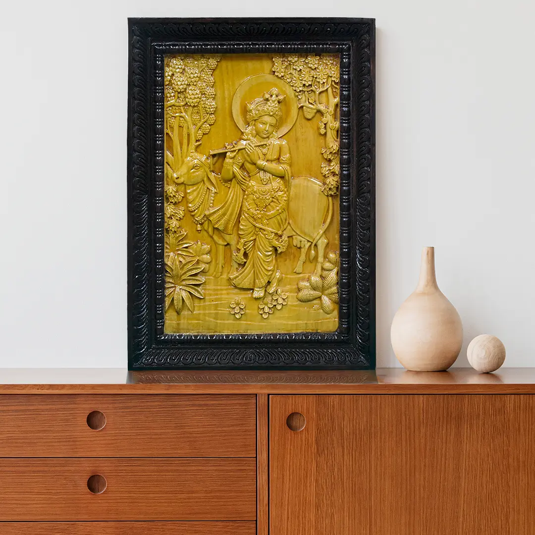 This exquisite framed sculpture captures the essence of Lord Krishna, the beloved deity, in his form as Dwarkadhish, the king of Dwarka. Rendered in warm, honey-toned white cedar wood, the intricate carving depicts Krishna with his iconic flute, its melody weaving through the serene atmosphere. He stands gracefully, adorned with a majestic crown and flowing dhoti, his divine presence radiating peace and compassion. The scene is brought to life by the surrounding elements. To Krishna's left, a gentle cow, a symbol of nourishment and purity in Hindu tradition, stands attentively. The cow is depicted with a subtle elegance, draped in ornate adornments befitting a divine companion. Lush trees with bountiful fruits and foliage frame the central figure, creating a naturalistic and harmonious setting that evokes the divine forests of Vrindavan or the majestic gardens of Dwarka. Delicate flowers bloom at the base, adding to the overall beauty and tranquility of the composition. The artistry of this piece is evident in every detail, from the lifelike rendering of Krishna's serene expression and the intricate folds of his garments to the textured bark of the trees and the delicate petals of the flowers. The white cedar wood itself, known for its durability and fine grain, has been expertly carved to bring out the subtle nuances of light and shadow, giving the sculpture a captivating depth and dimension.
