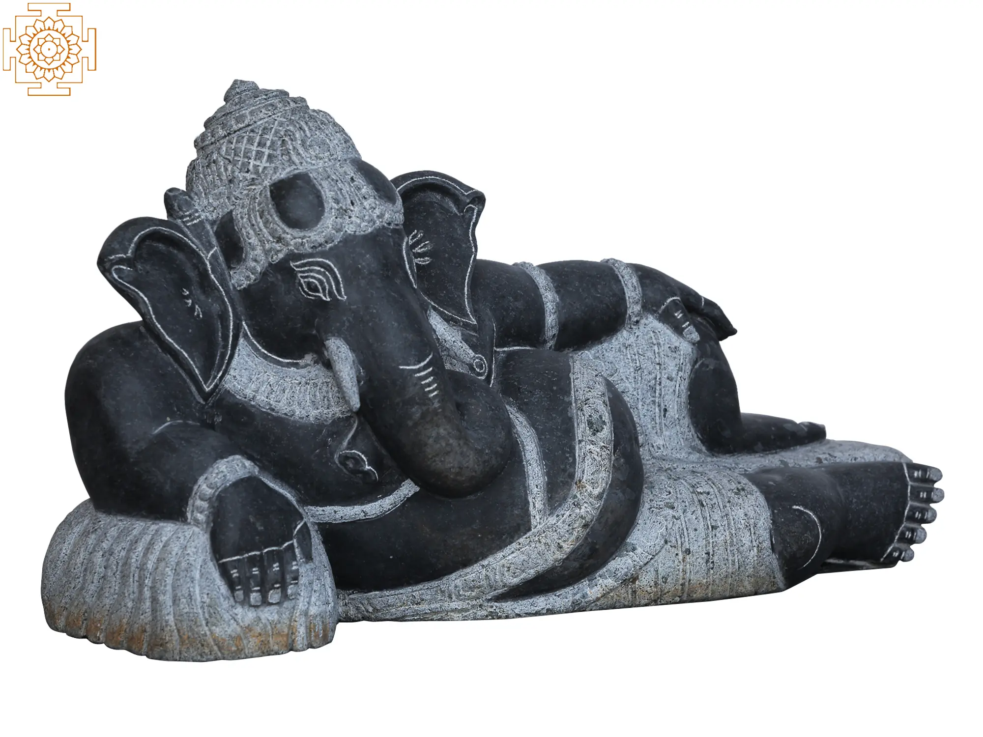 Lord Ganesha in a serene and tranquil pose, embodying a sense of peace and contentment. Often depicted reclining or lounging comfortably.