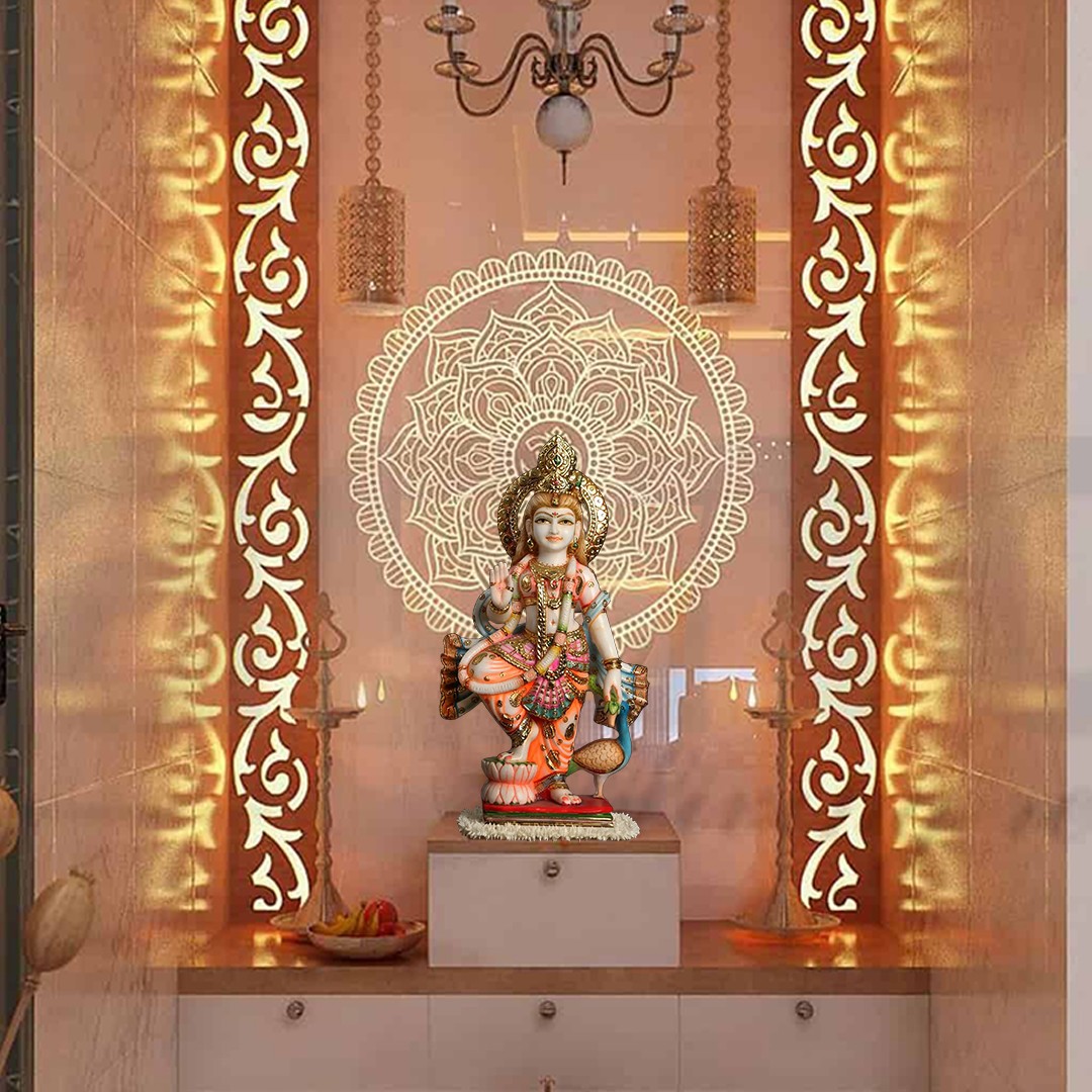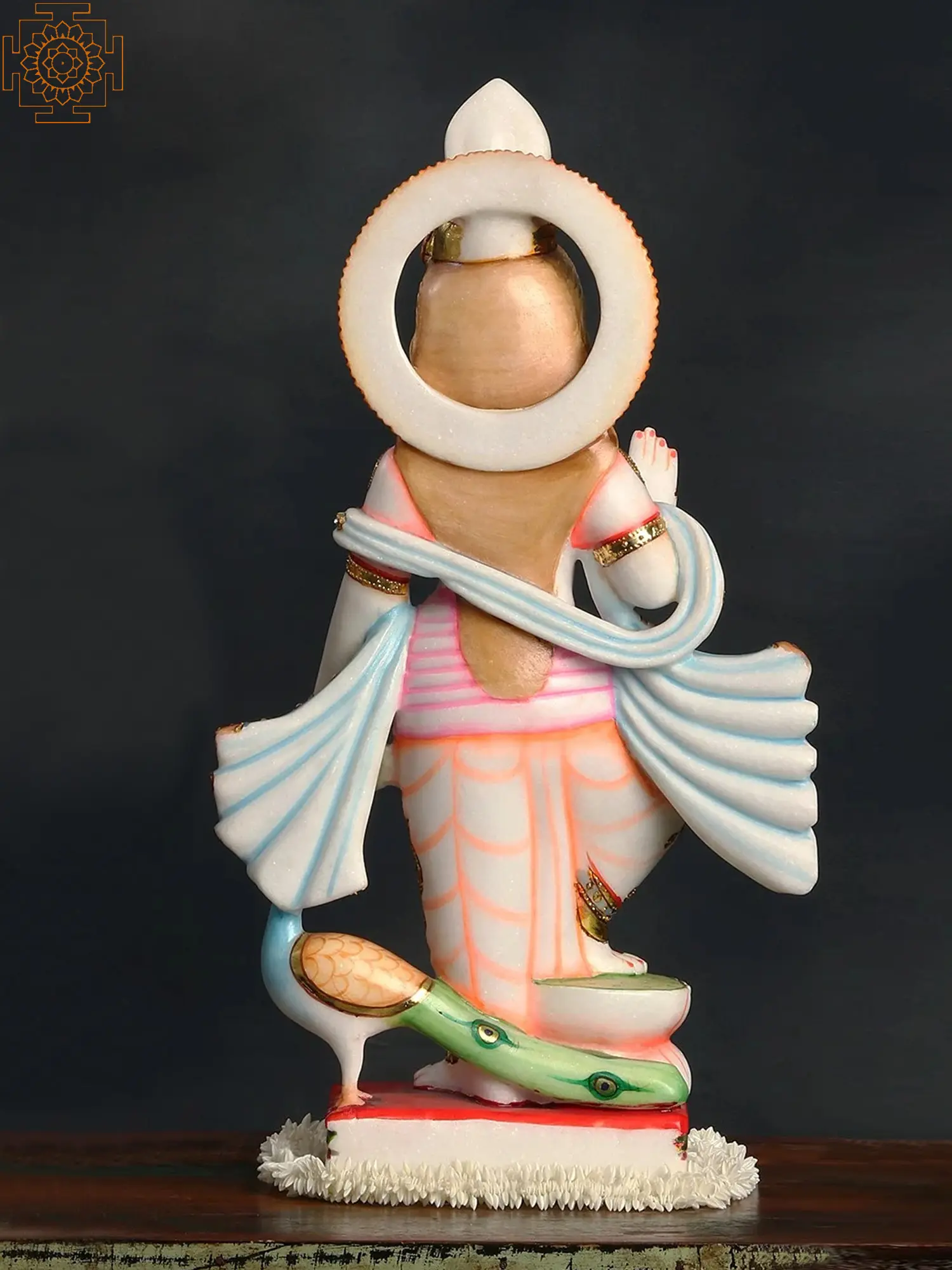The Alhadini Shakti (she who is the cause of joy) of Krishna and the queen of Vrindavan, goddess Radha in Krishna-bhakti is the path and the mantra to reach Krishna. The purity of her love and the strength of her devotion to Krishna is the guiding light for Bhaktas. Her unblemished character and heavenly beauty are evoked in this white marble statute. Youthful and brimming with beauty, goddess Radha stands in a majestic pose, with one leg placed on a pink lotus and the other firmly balancing her body. Attired in a paisley-patterned traditional dhoti and blouse, Radha is wrapped in a blue chunri- symbolizing her connection with the blue-skinned Krishna.