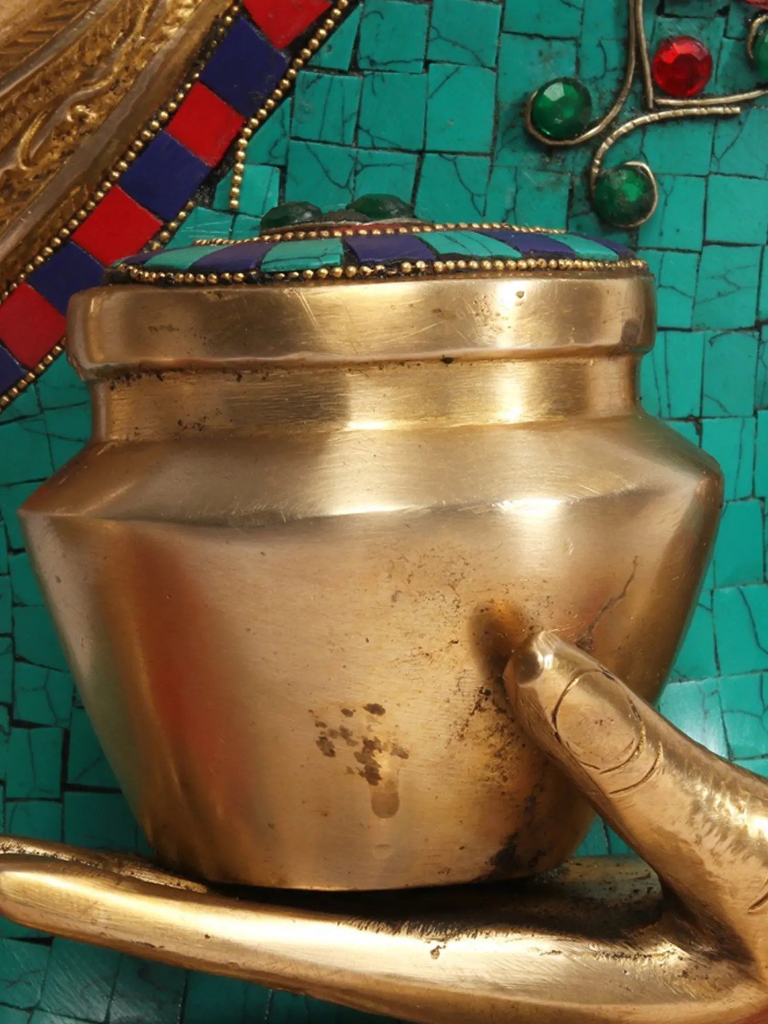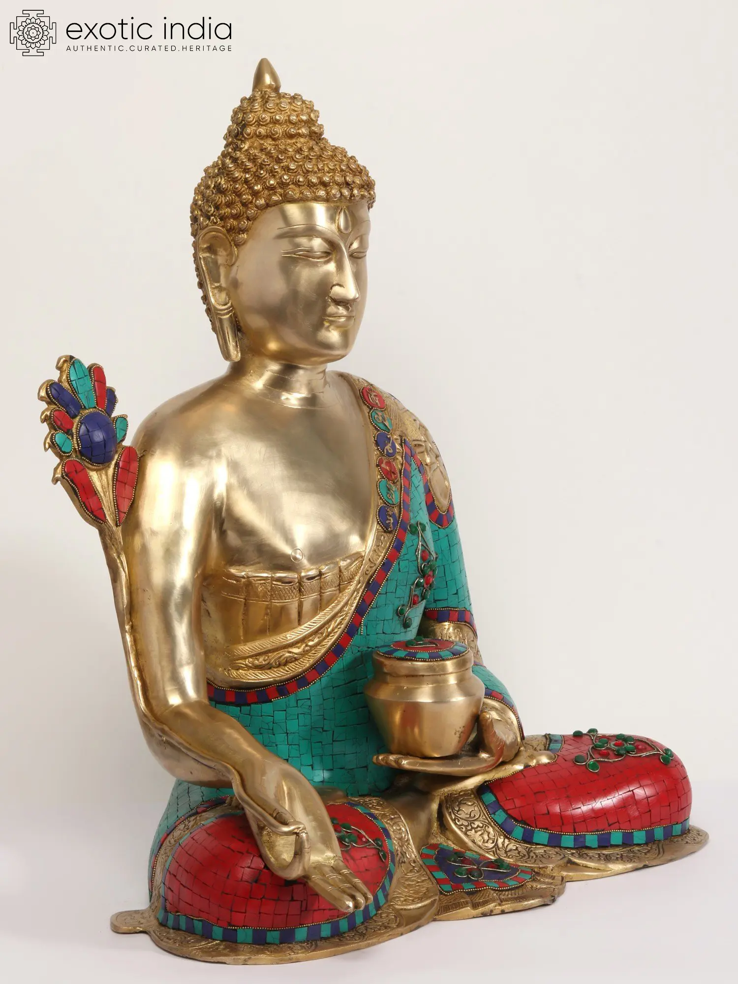 This magnificent brass statue embodies the serene and compassionate presence of the Medicine Buddha, also known as Bhaisajyaguru. In Tibetan Buddhism, the Medicine Buddha is revered as the embodiment of all the Buddhas of the ten directions, a celestial physician who cures not only physical ailments but also the afflictions of the mind, such as greed, hatred, and delusion. His practice is believed to bestow blessings of health, longevity, and spiritual awakening. This particular rendition is a masterpiece of Indian craftsmanship, meticulously handcrafted from high-quality brass. The statue is adorned with exquisite inlay work, featuring vibrant turquoise and red stones, interspersed with hints of blue and green, adding a touch of opulence and symbolic depth. The rich colors are reminiscent of the precious jewels and medicinal herbs that are often associated with the Medicine Buddha and his celestial Pure Land, Vaiduryaprabha. The Medicine Buddha is depicted in his traditional meditative posture, seated in vajrasana (lotus position). His right hand rests on his knee, palm facing outward, in the gesture of bestowing blessings and fearlessness (abhaya mudra). His left hand cradles a medicine bowl, typically overflowing with the nectar of immortality and the potent herbs that symbolize his healing powers.