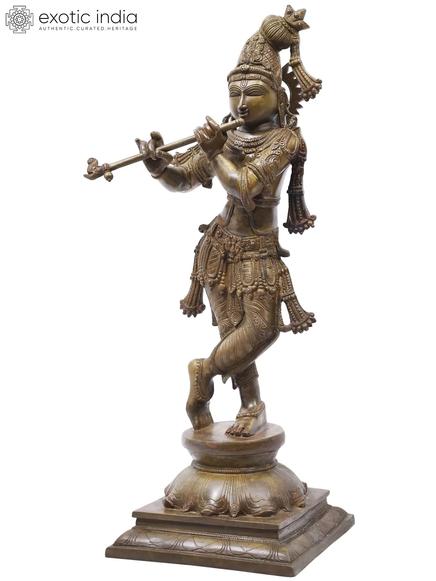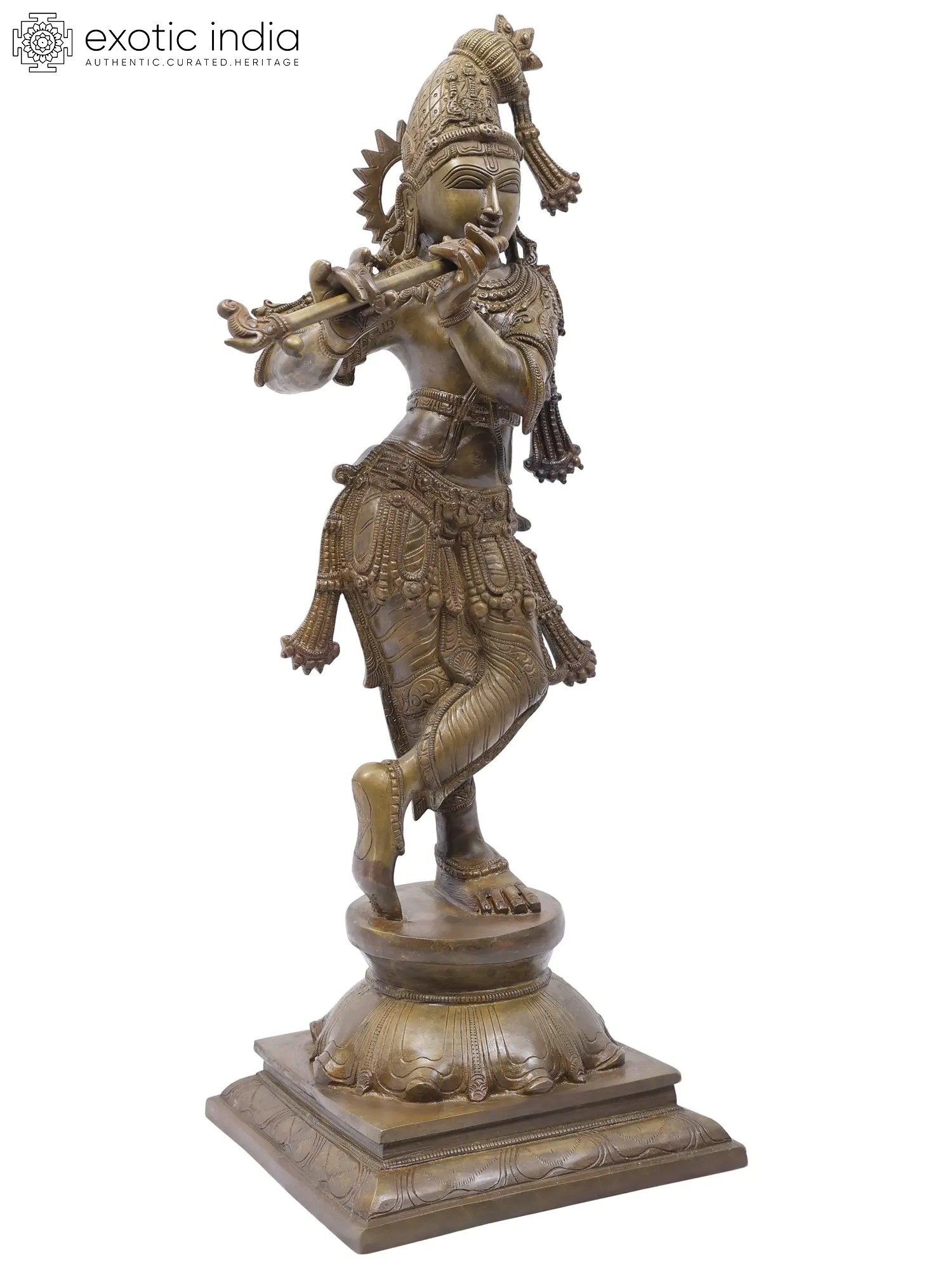 The features of His countenance have been painstakingly engraved to convey a composure of divine calm and wisdom. Sculpted from brass, which is a popular medium for art of a devotional-spiritual nature, this Krishna murti comes in two select finish variations, each of which has been curated for our collection because of its elegance.