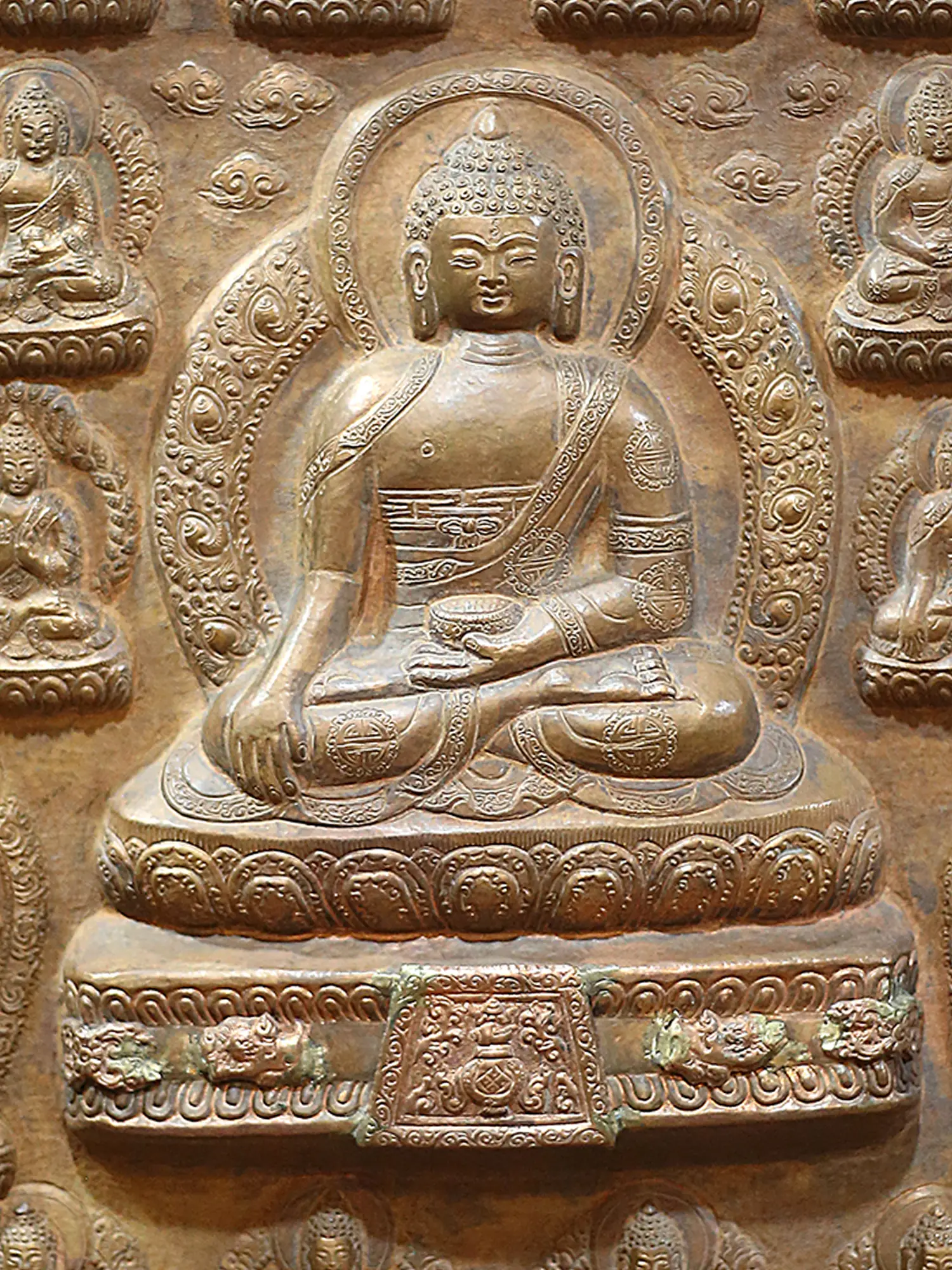 The copper wall hanging image of 35 Buddhas from Nepal brings to your space the powers and benevolence of Thirty-five Confession Buddhas, whose refuge can salvage a human being from the Samsara- the ocean of existence. Thirty-four Buddhas are depicted seated on an individual lotus throne with aureoles behind them, with Shakyamuni Buddha in the center. With the potent presence of the Buddhas of Confession, this copper wall hanging is a Thangka- a ritual image to be used during the meditation and worship of these heavenly Buddhas.