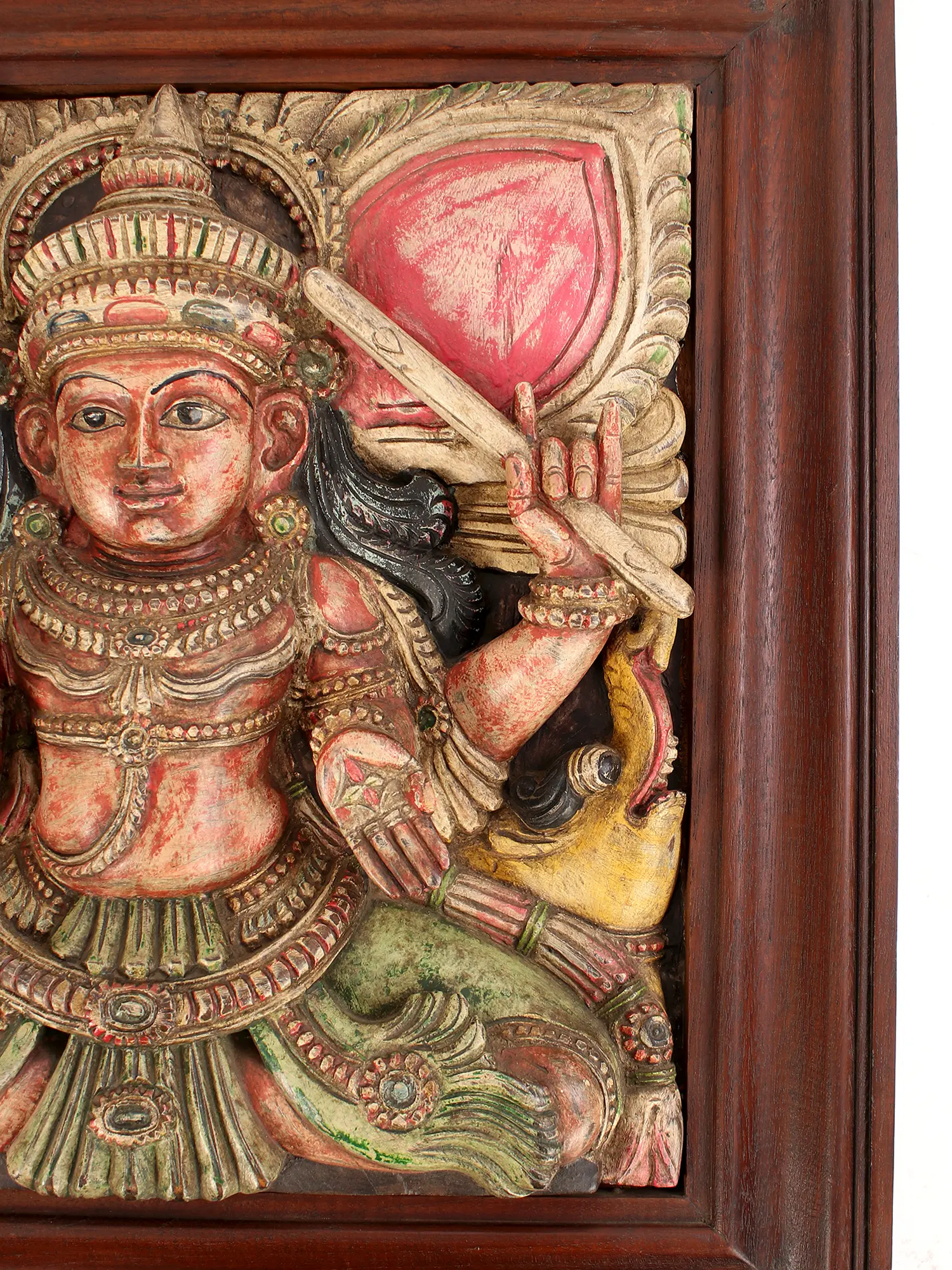 This wall panel is more than just a decorative item; it is a testament to the skill of artisans who have preserved traditional woodworking techniques. The deep relief carving creates a sense of three-dimensionality, making Lord Indra appear almost alive. Each element, from the flowing drapery to the subtle nuances of his facial features, has been rendered with care and reverence. The panel is framed in a sturdy, dark wooden border, providing a classic and elegant finish that ensures it will be a cherished centerpiece in any room. Whether displayed in a meditation space, living room, or study, this artwork serves as a beautiful reminder of spiritual devotion and the rich tapestry of Hindu culture. It’s a piece that resonates with history, artistry, and divine energy.