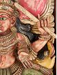 In Hindu mythology, Indra is a pivotal figure, renowned for his strength, courage, and leadership. He is often depicted as a warrior god, protecting the cosmos from demons and obstacles. Stories abound of his exploits, from defeating Vritra, the serpent who withheld the world's waters, thus bringing forth life-giving rain, to his role in the churning of the ocean for the nectar of immortality, Amrita. His celestial vehicle, the white elephant Airavata, is a symbol of his regal status and strength. This panel, with its detailed depiction, invites contemplation of these ancient tales and the enduring power of faith. The intricate ornamentation, including the elaborate headdress and the divine adornments, speaks to his supreme position within the celestial hierarchy. The serene yet powerful expression on his face embodies a divine balance of compassion and authority. ––––––––––––––––––––