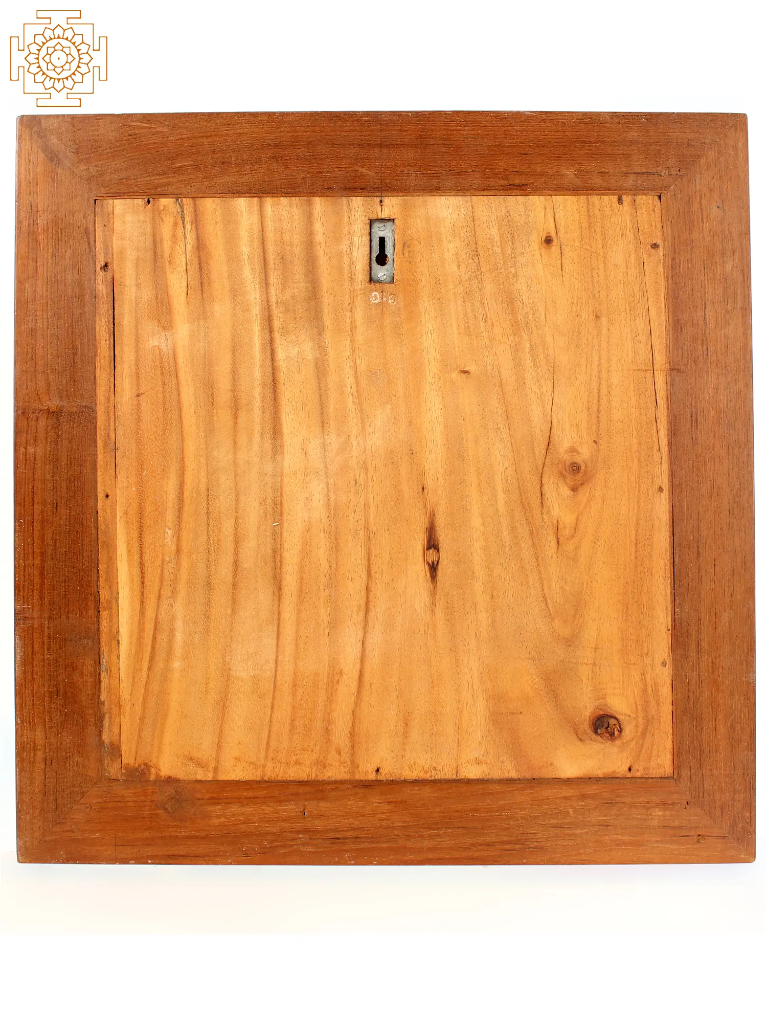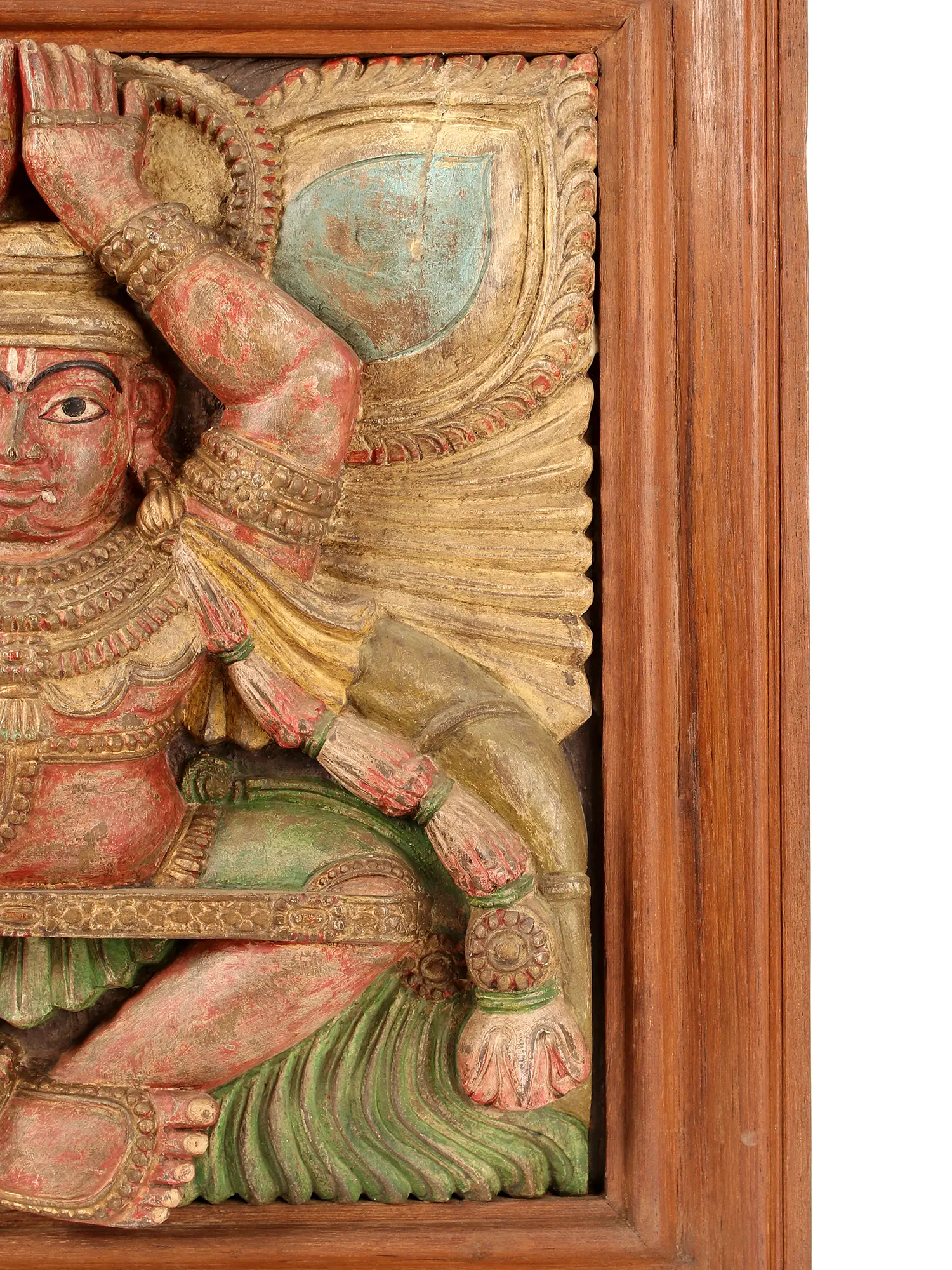 The colours and engravings that define the background of dancing Indra, create an impression of the ethereal and the otherworldly. Along the top, there is a gigantic pale blue lotus petal in each corner. Immediately below, are waves of gold giving off the illusion of a winged Indra. At the bottom are downward lines etched into the wood painted a vivid green colour.