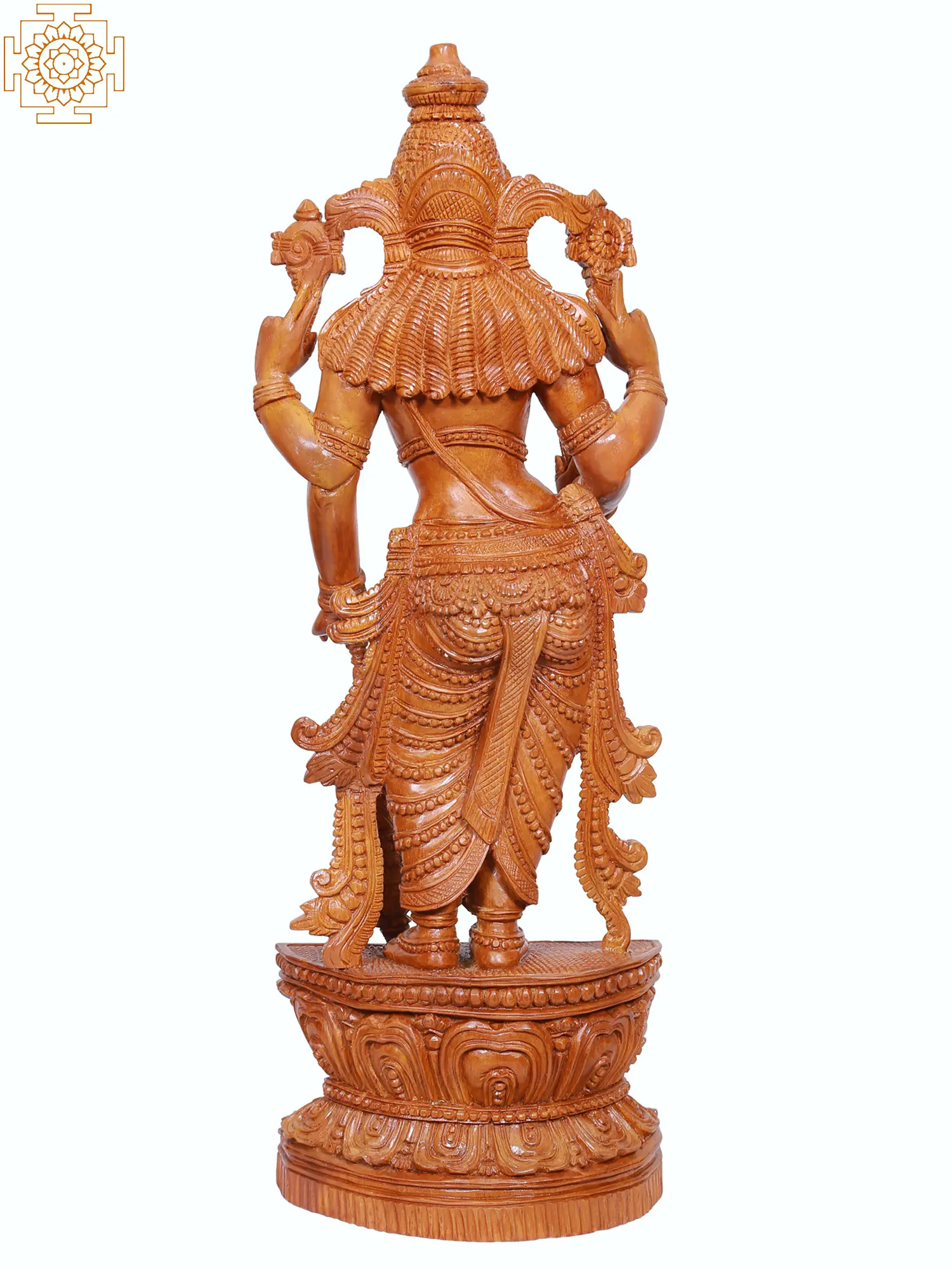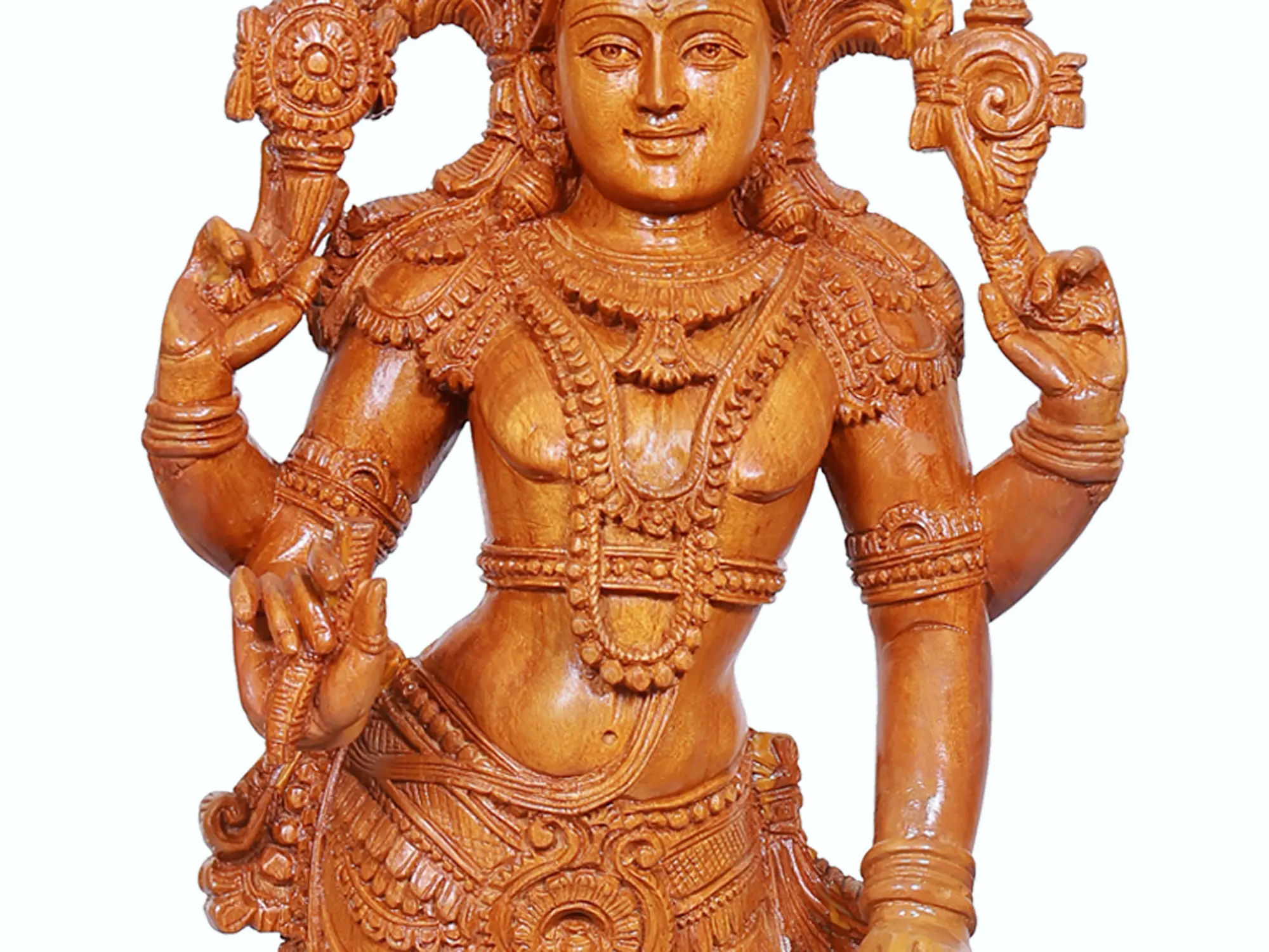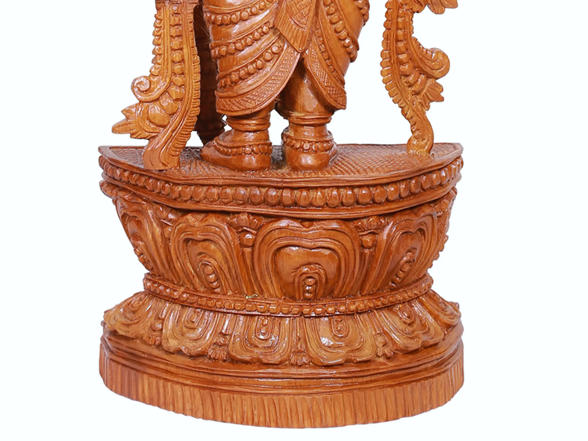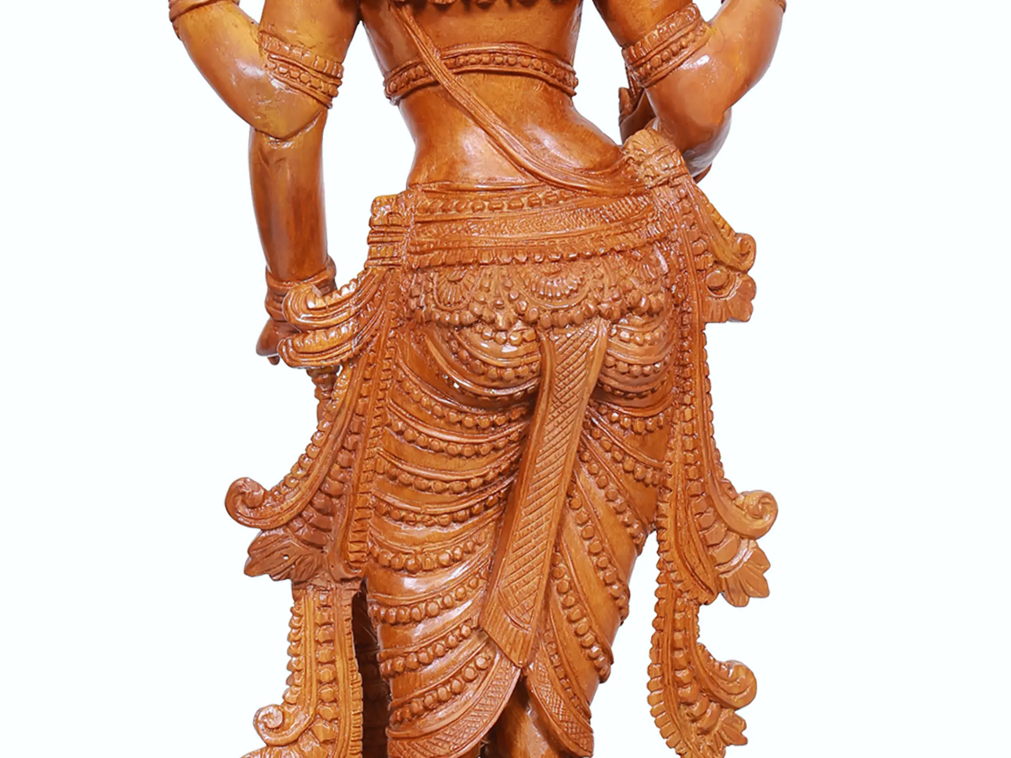 Enter the world of divinity with this minutely carved wooden sculpture of Lord Hari Vishnu. With meticulous craftsmanship, the statue brings forth the majesty and grace of Lord Vishnu. Adorned with sacred symbols such as the Sudarshan Chakra and the lotus flower, Lord Vishnu's appearance reflects his role as the preserver and sustainer of the universe. His hands hold symbolic objects, signifying his divine attributes and cosmic power. This magnificent statue not only showcases the artistic excellence of the craftsman but also invites devotees to connect with the divine energy of Lord Vishnu, fostering a sense of peace, protection, and spiritual harmony.