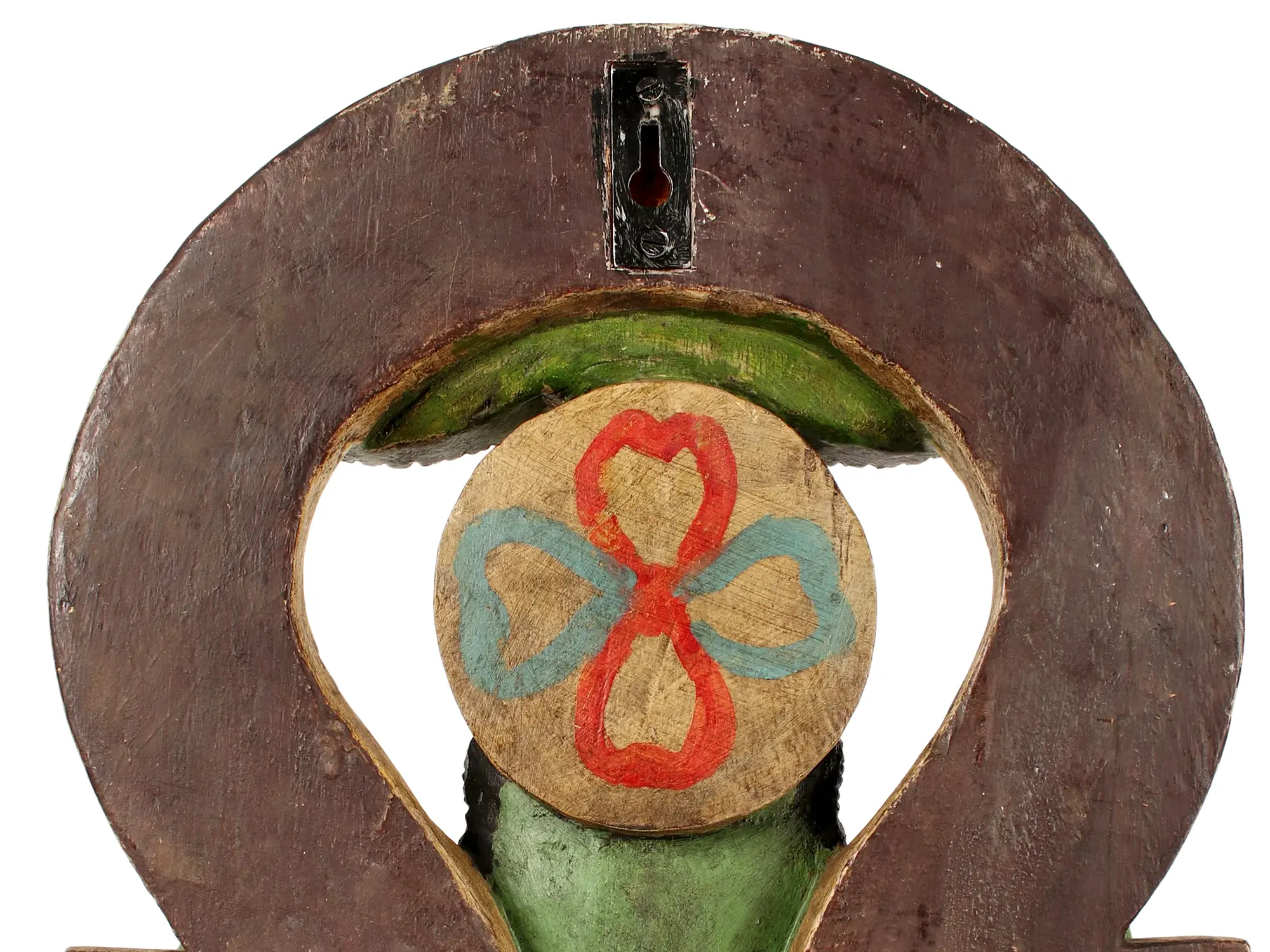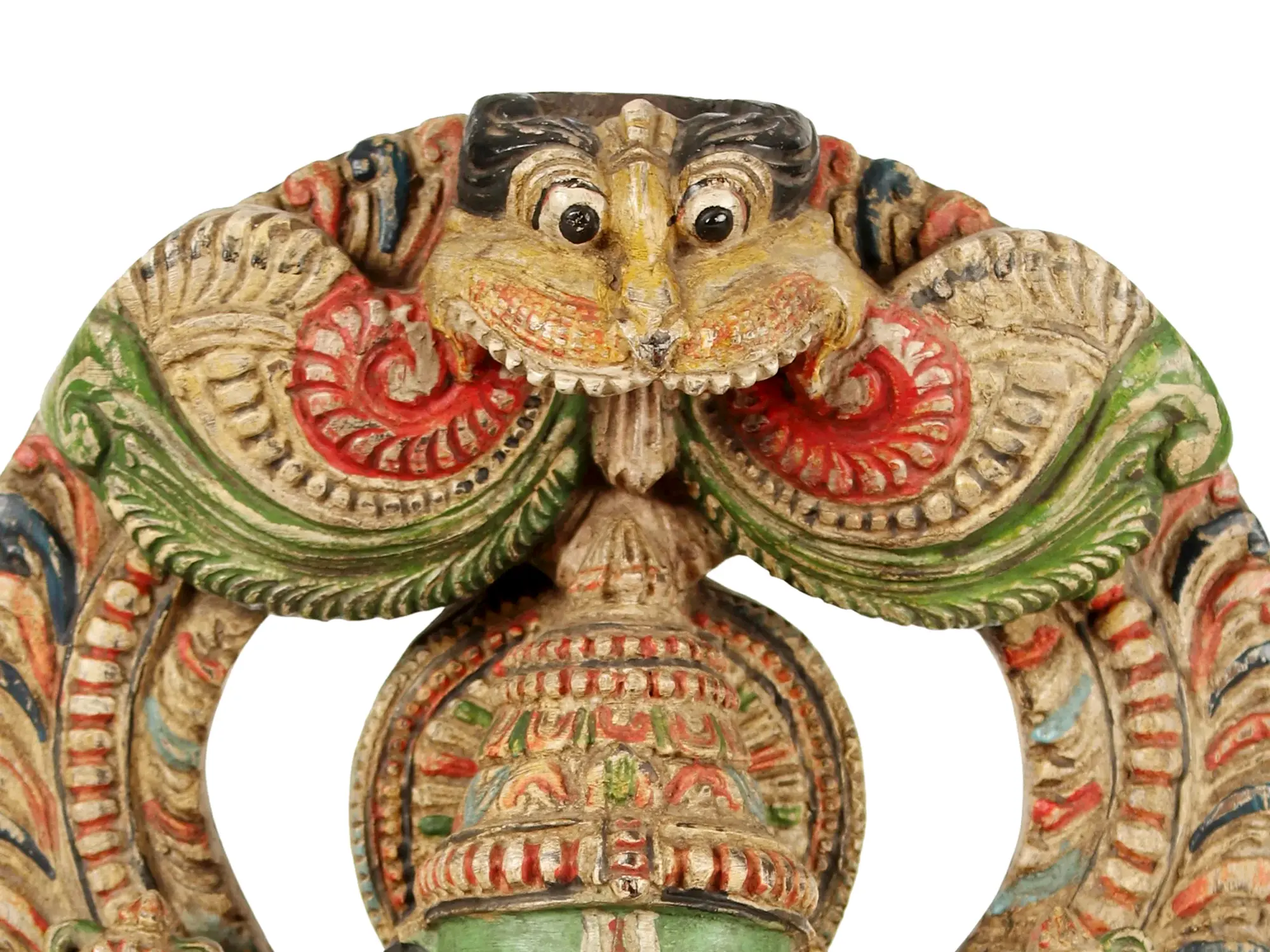 Crafted from fine wood, this piece showcases meticulous artistry. The vibrant colors, though weathered with time, still speak of a rich tradition of craftsmanship. The elaborate headdress, the ornate jewelry adorning his form, and the intricate patterns on his garments all contribute to the statue's captivating presence. The symbolic arch behind Hanuman, possibly depicting makaras (mythical sea creatures) or other auspicious motifs, adds a layer of grandeur and protection, hinting at the protective aura Hanuman is believed to possess. The inclusion of the Shri Yantra, a sacred geometric symbol representing cosmic energy and feminine power, subtly placed in the corner, further imbues the piece with spiritual significance. This auspicious emblem is believed to attract wealth, prosperity, and well-being, creating a harmonious environment for its beholder.