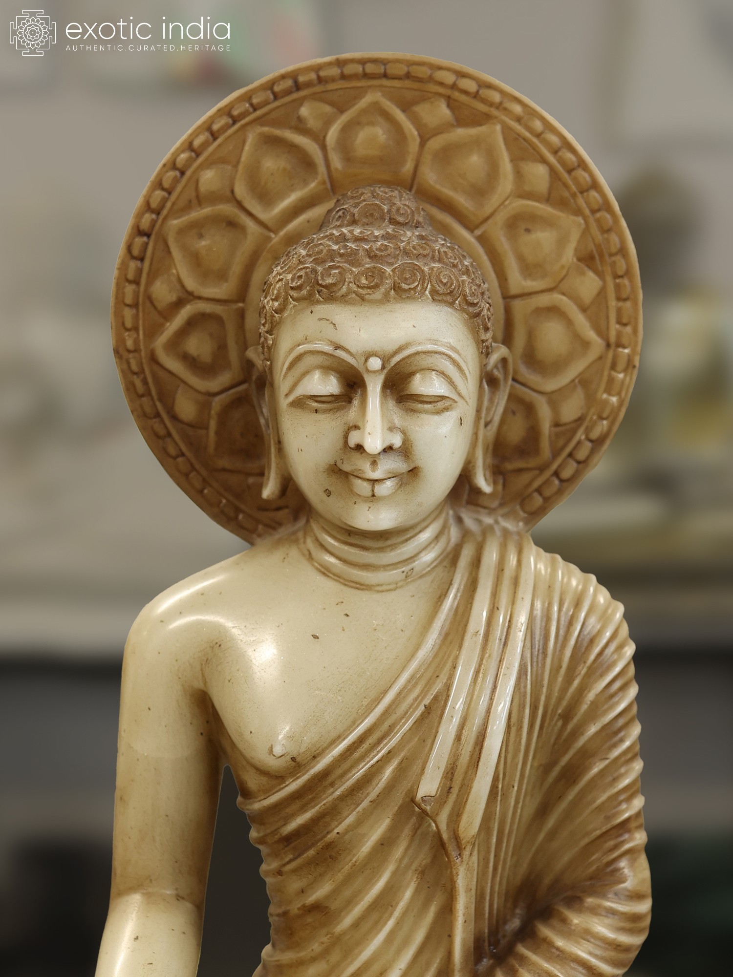 The 24-inch stature of this Buddha lends it a commanding yet gentle presence, perfectly proportioned to grace your home or meditation space. Its thoughtful dimensions, approximately 16 inches wide and 8 inches deep, allow it to command attention without overwhelming its environment. The serene expression, the delicate folds of the robe, and the intricate detailing of the halo all contribute to a composition that is both visually captivating and spiritually resonant. You will be drawn to the subtle, natural hues of the marble, enhanced by a finish that highlights its inherent beauty.