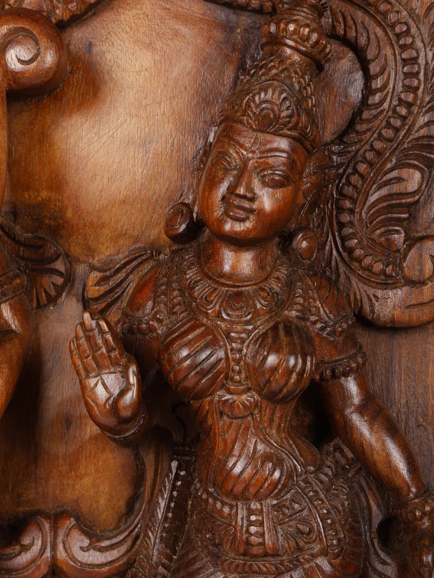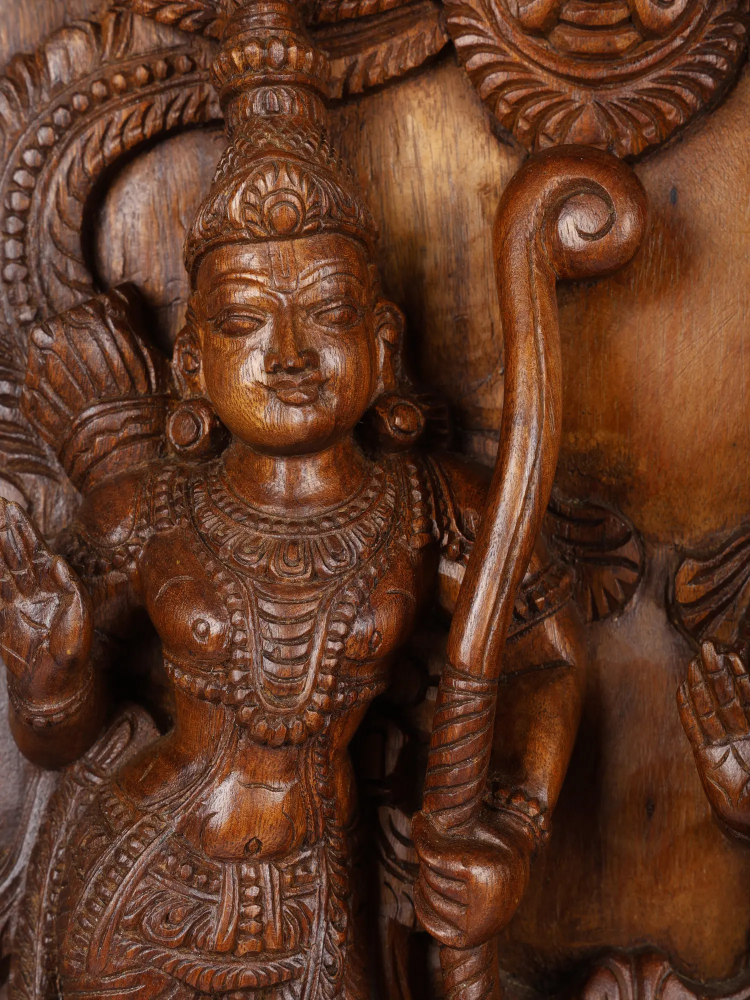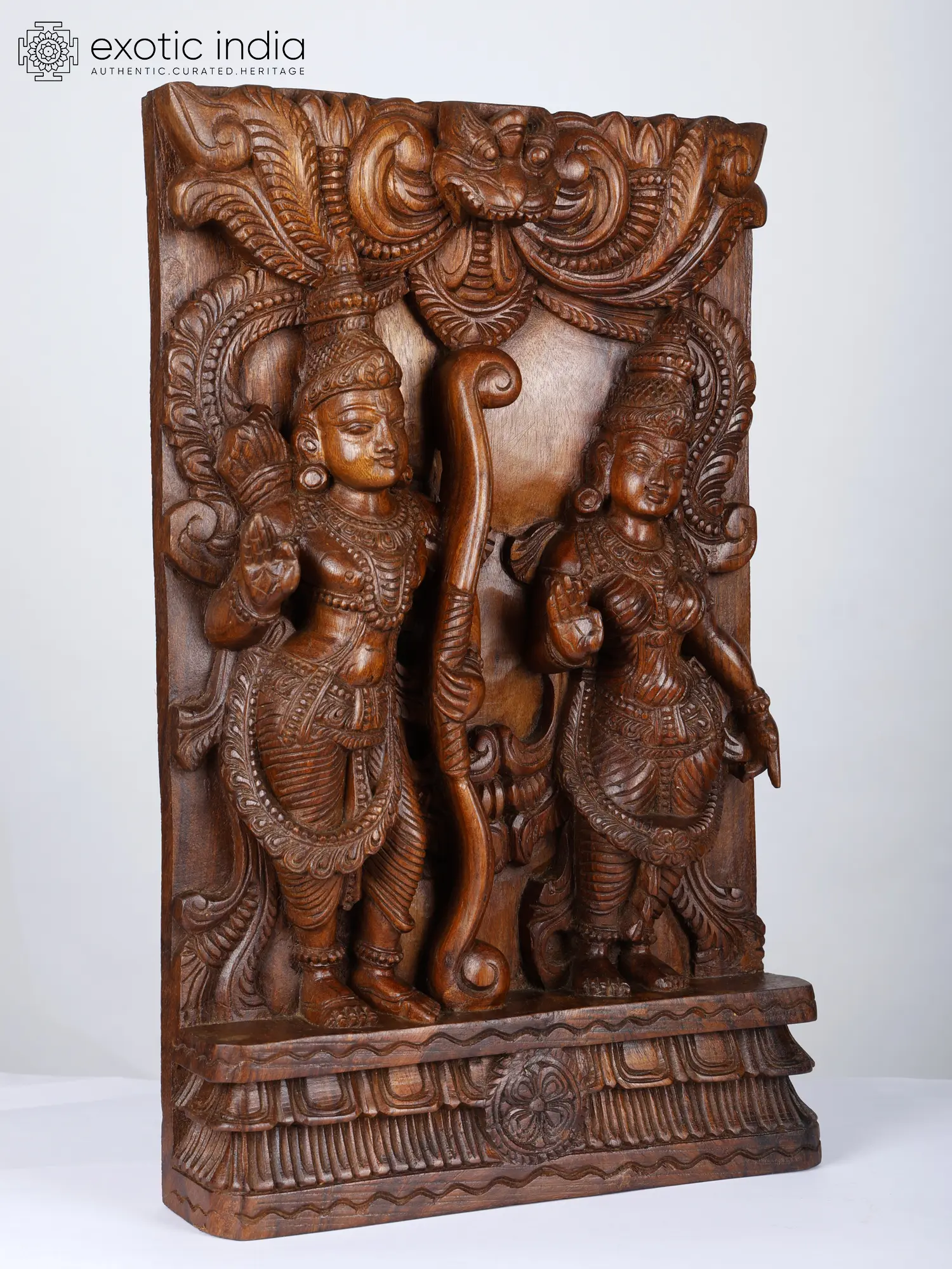 This wood-carved statue on the rectangular wooden plank portrays an enchanting scene of Blessing Siya-Rama, capturing the divine union of Lord Rama and Goddess Sita. Both stand gracefully in a Tribhanga pose, exuding elegance and grace, while blessing their devotees with the Abhaya Mudra, imparting fearlessness and protection.