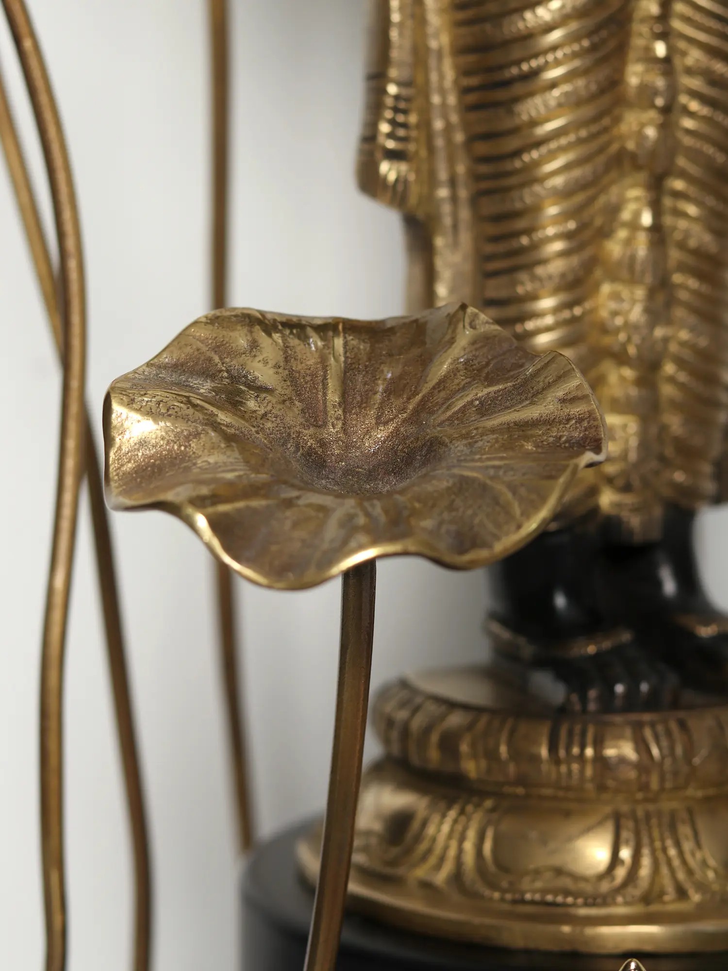 The lotus flowers surrounding the central figures symbolize purity, enlightenment, and detachment from worldly desires. In Hindu mythology, the lotus is frequently associated with deities, representing their divine emergence from the primordial waters of creation. The carefully detailed craftsmanship extends to every element, from the intricate patterns on Balaji's garments to the delicate rendering of Lakshmi's serene demeanor. Every aspect is designed to evoke reverence and inspire contemplation, fostering a spiritual atmosphere wherever it is placed.