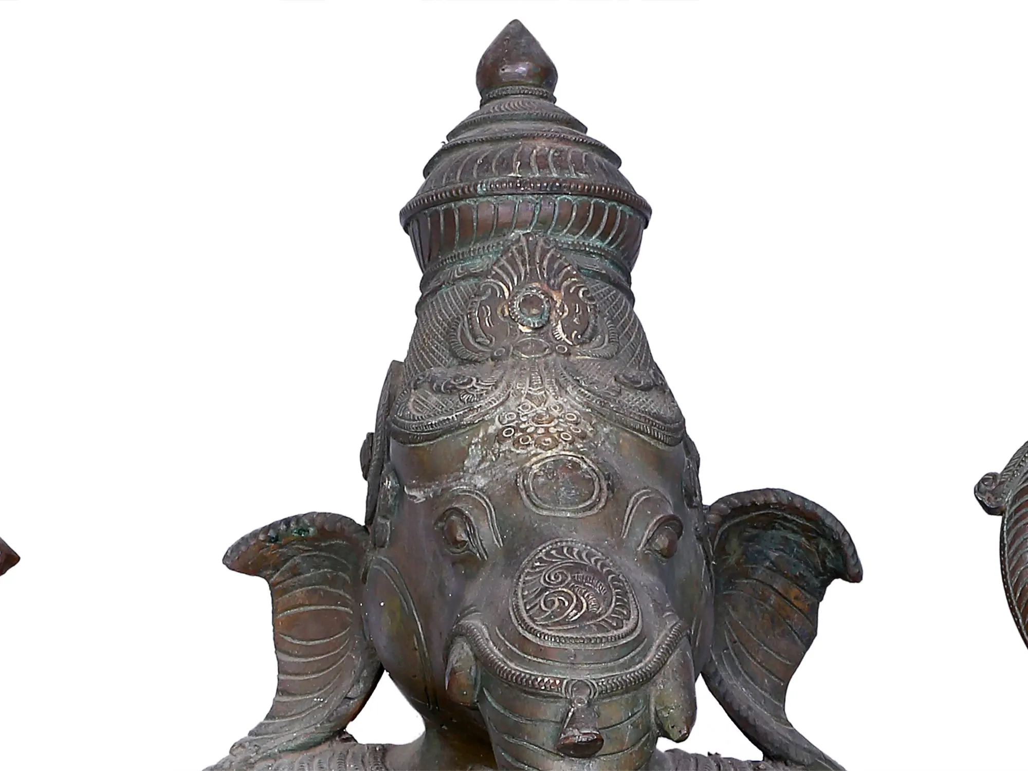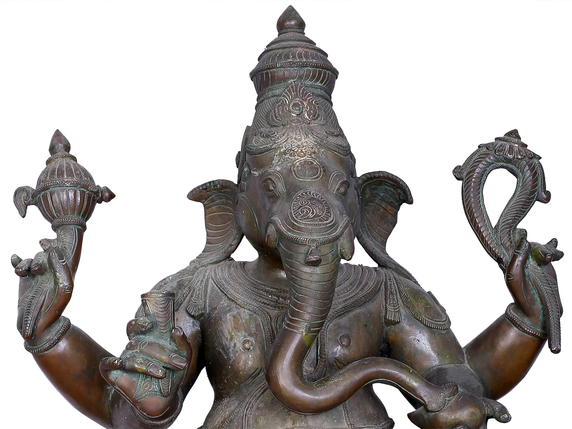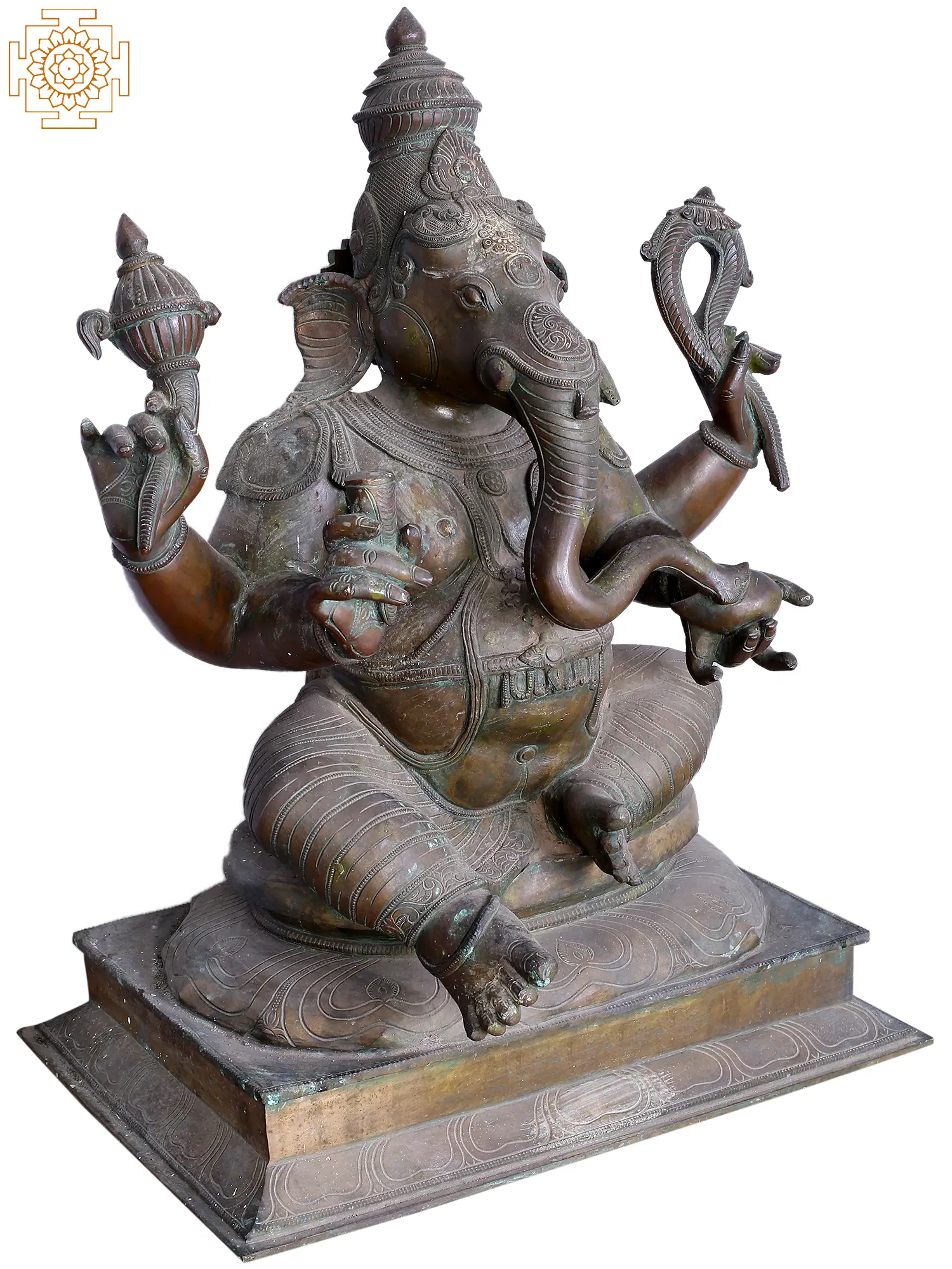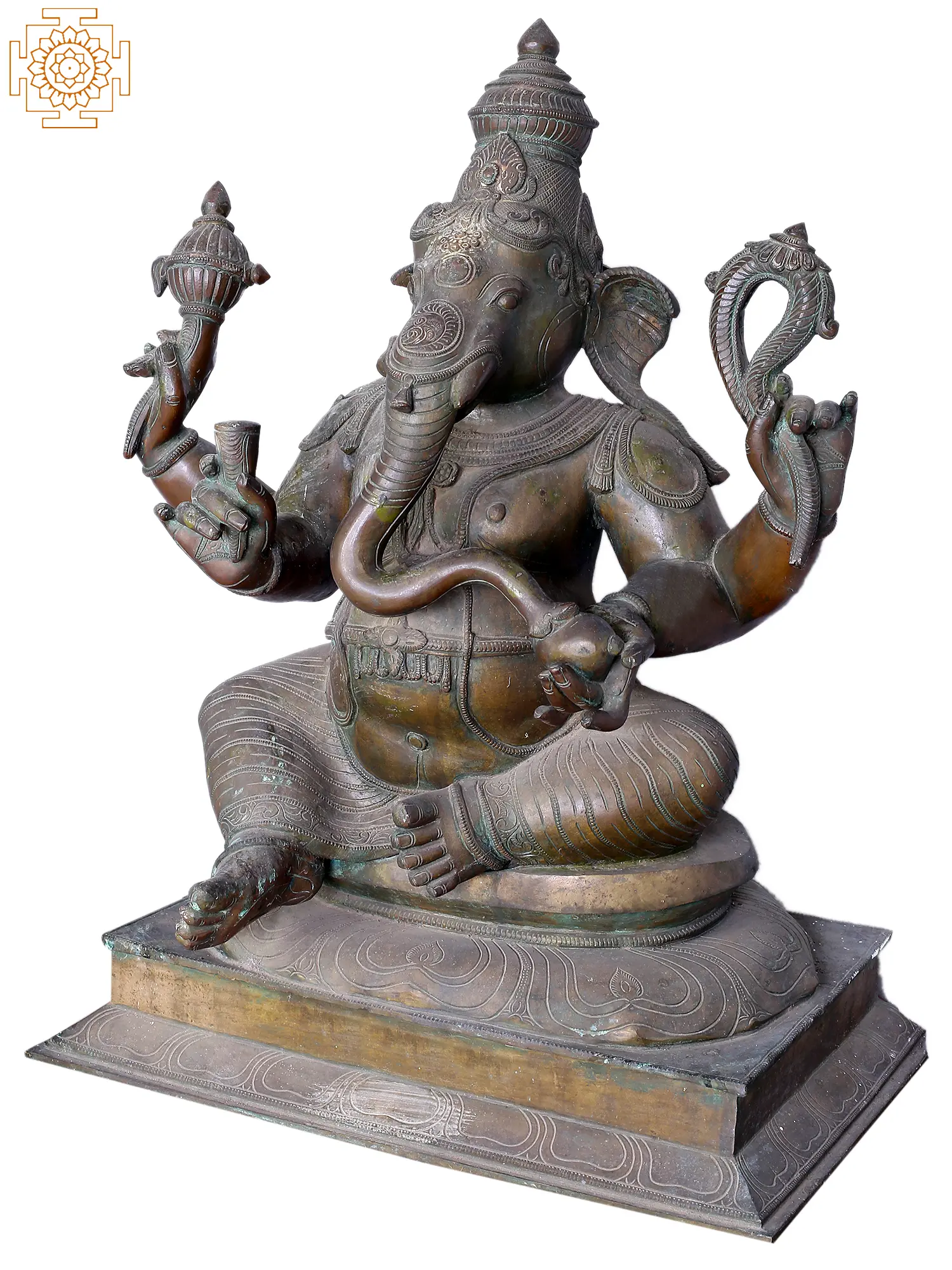 Behold a magnificent bronze representation of Lord Ganesha, the beloved elephant-headed deity revered as the remover of obstacles, the patron of arts and sciences, and the intellect personified. This commanding 24-inch sculpture captures Ganesha in a seated posture of regal repose upon an ornate throne, exuding an aura of profound wisdom and benevolent power. Crafted with exceptional skill using the ancient Madhuchista Vidhana (lost-wax) technique, this statue is a testament to traditional artistry and spiritual devotion. The use of Panchaloha, a sacred five-metal alloy revered in South Indian iconography, imbues the sculpture with a unique luster and spiritual significance, believed to resonate with cosmic energies.