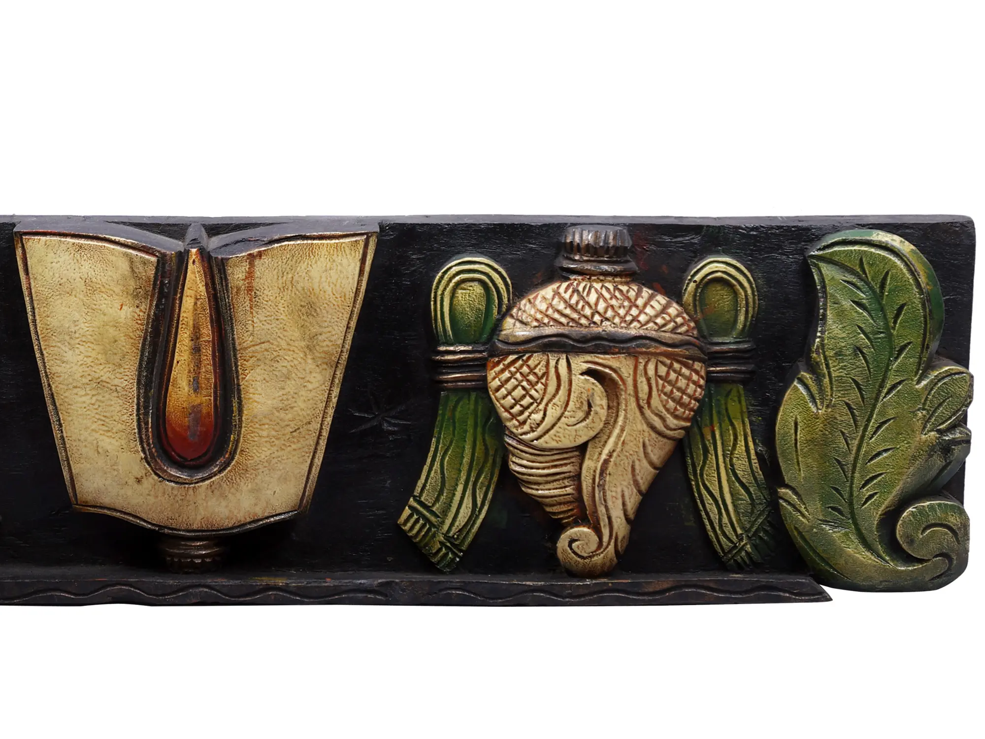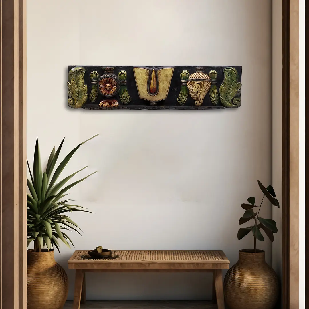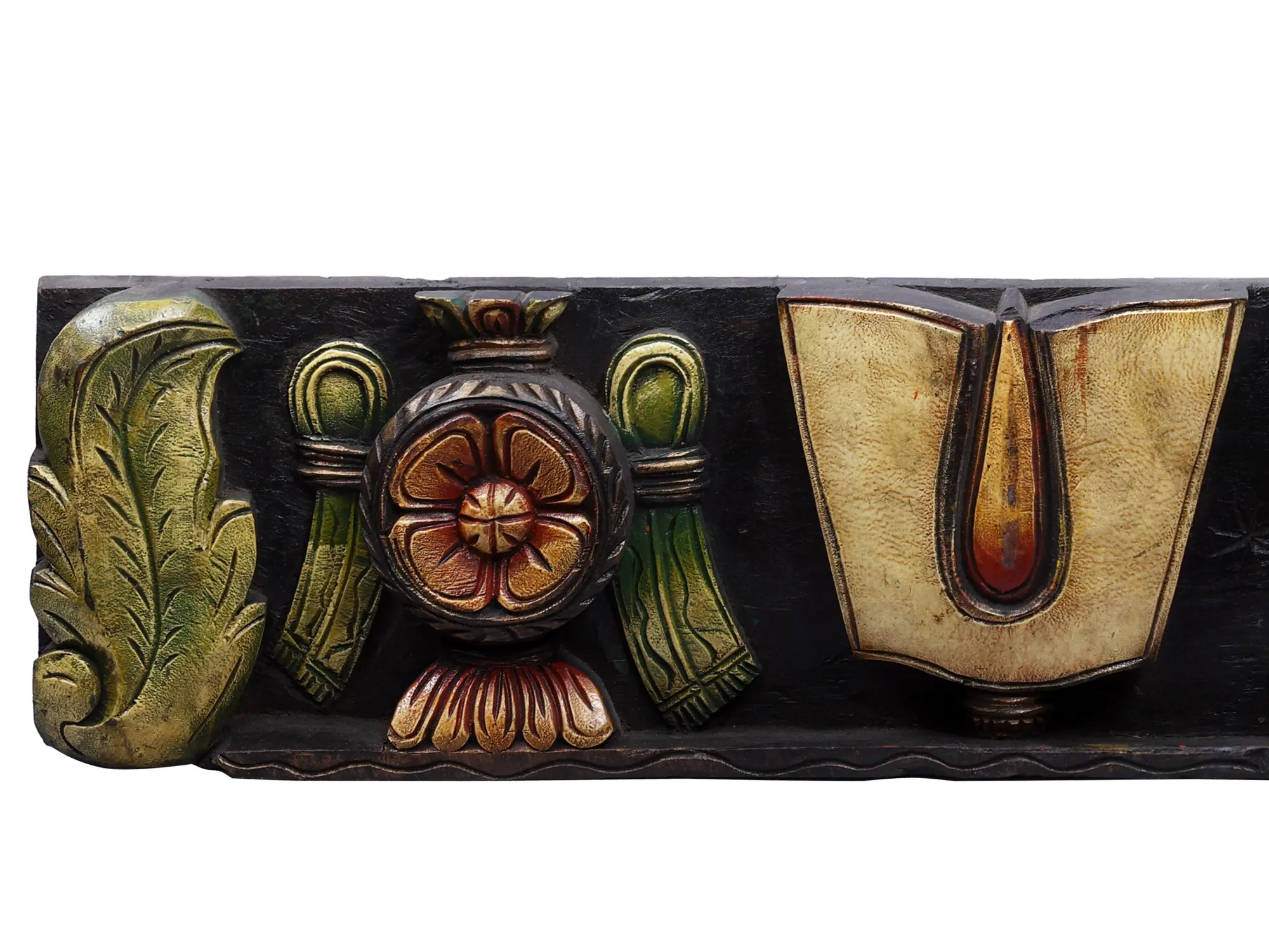 For the devotees of Sri Tirupati Balaji and Vishnu across the world, these divine attributes- Shankha (conch) and Chakra (discus) and his Tilak (forehead mark) are the most sacred and auspicious symbols, representing the omnipresent and eternal guardian of the three realms. This wooden wall hanging becomes a divine symbol, adorned by the three emblems of Vaishnavism.