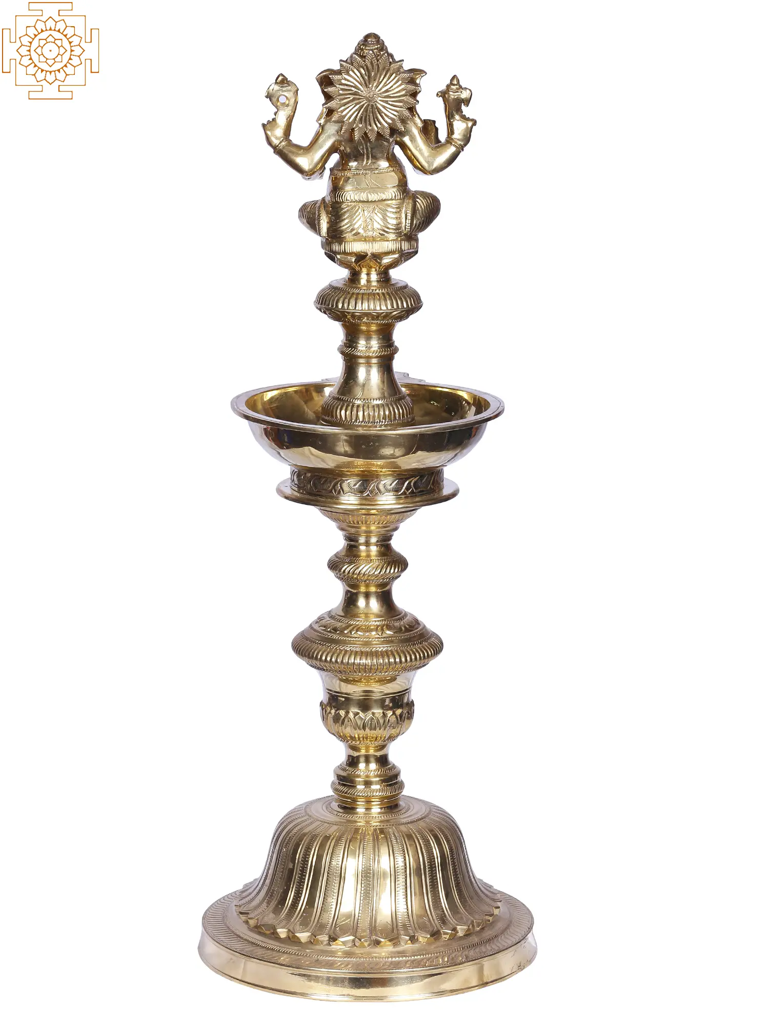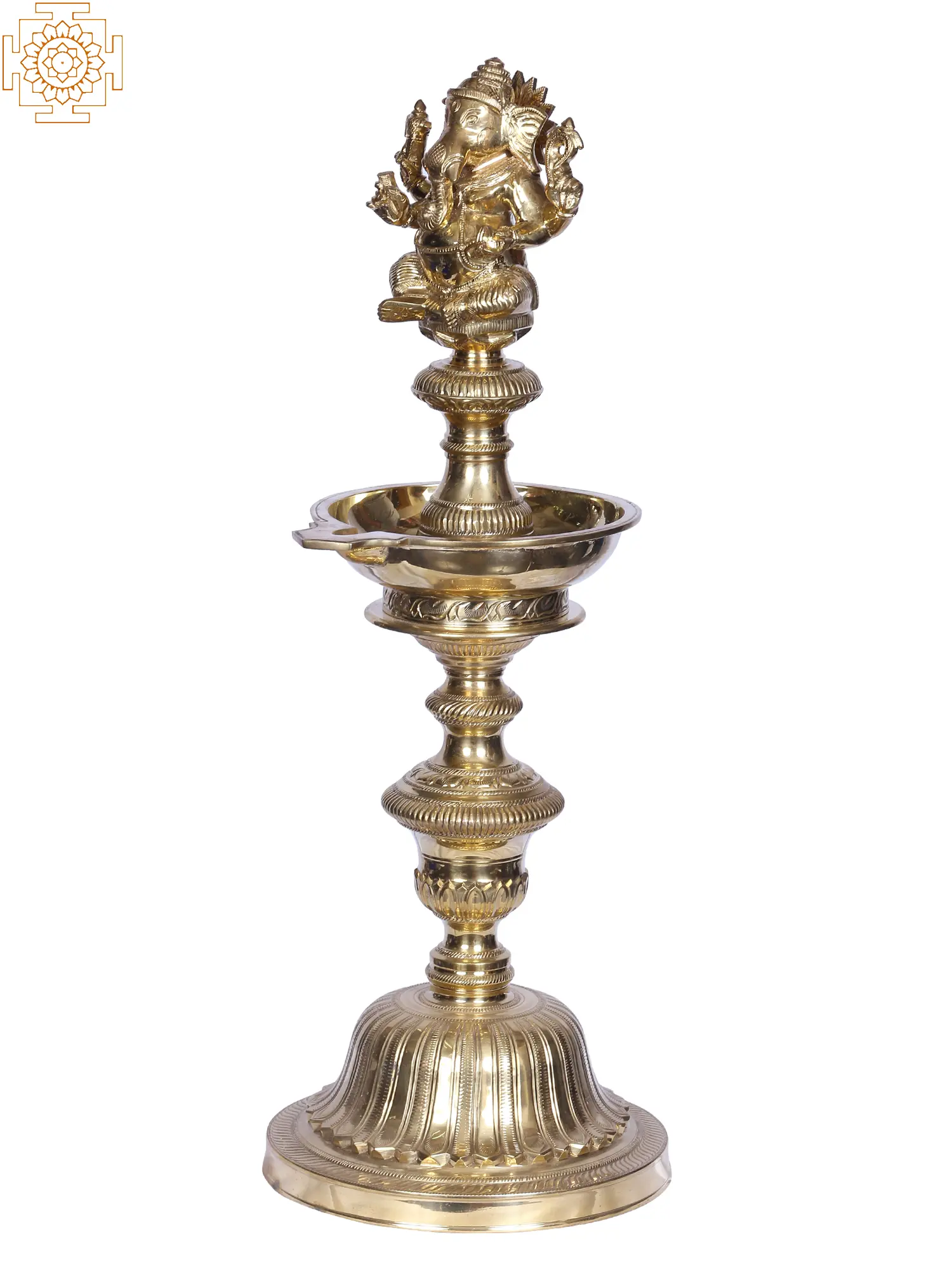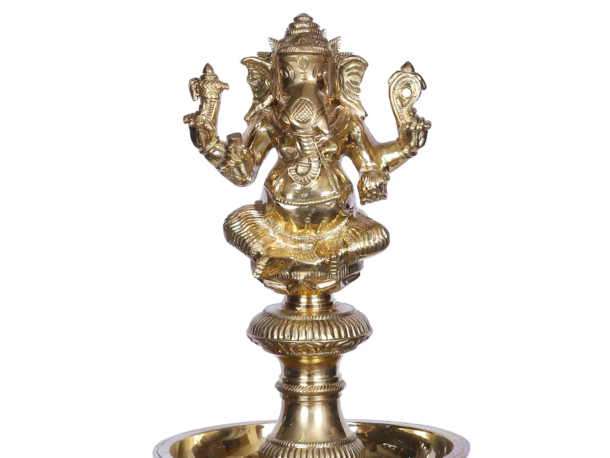 The picture of Lord Ganesha is regarded sacred and is utilized to augment the holiness of numerous ceremonial artifacts. This columnar lamp, known traditionally as a Kuthu Vilakku, is an essential feature of many ritualistic events and is adorned with a sculpture of Lord Ganesha seated on the highest level of the stand, which stays at the core of the main oil basin. An intricate stand is affixed to the main light, which is further supported at the base by a platform in the shape of an inverted lotus. It is said that lighting a Kuthu Villaku with a Ganesha image eliminates negative energy or Vighna and provides good luck and wealth to the place.