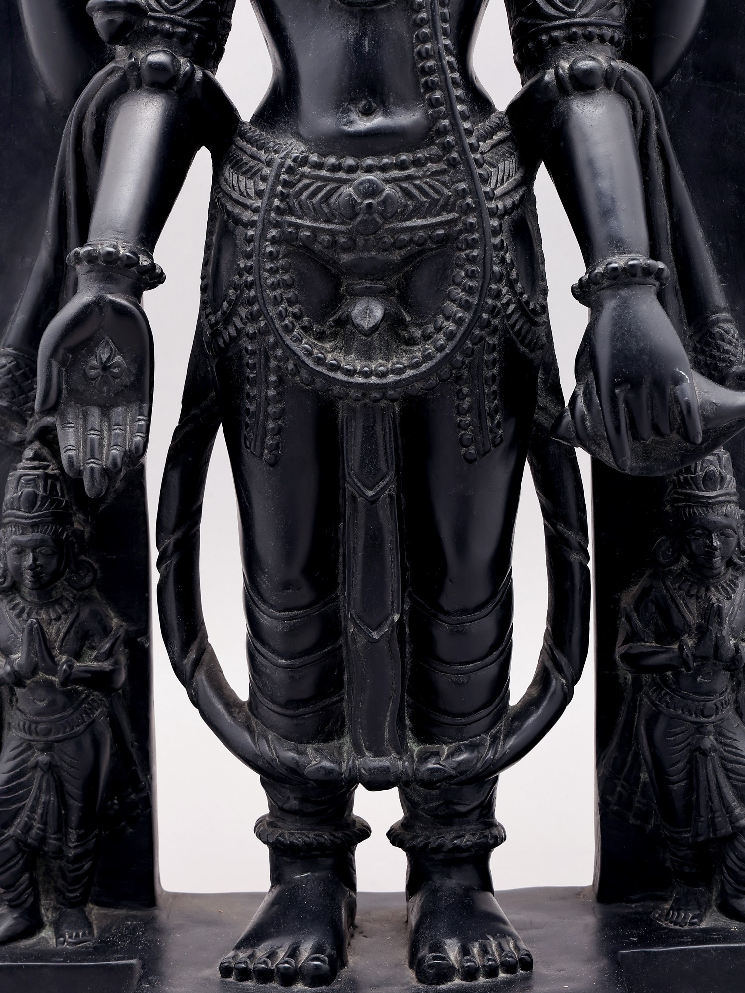 Depicts Vishnu with four arms, symbolizing his power and dominion over the four directions.