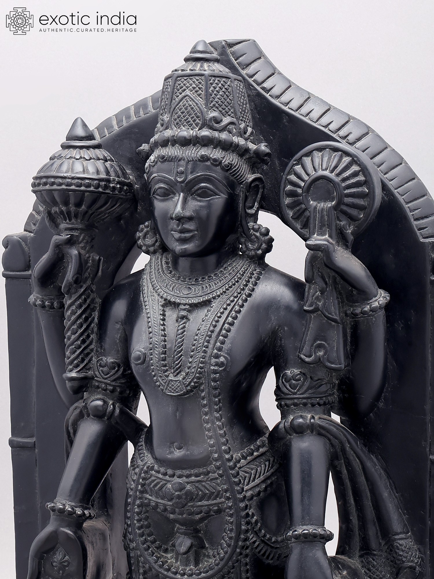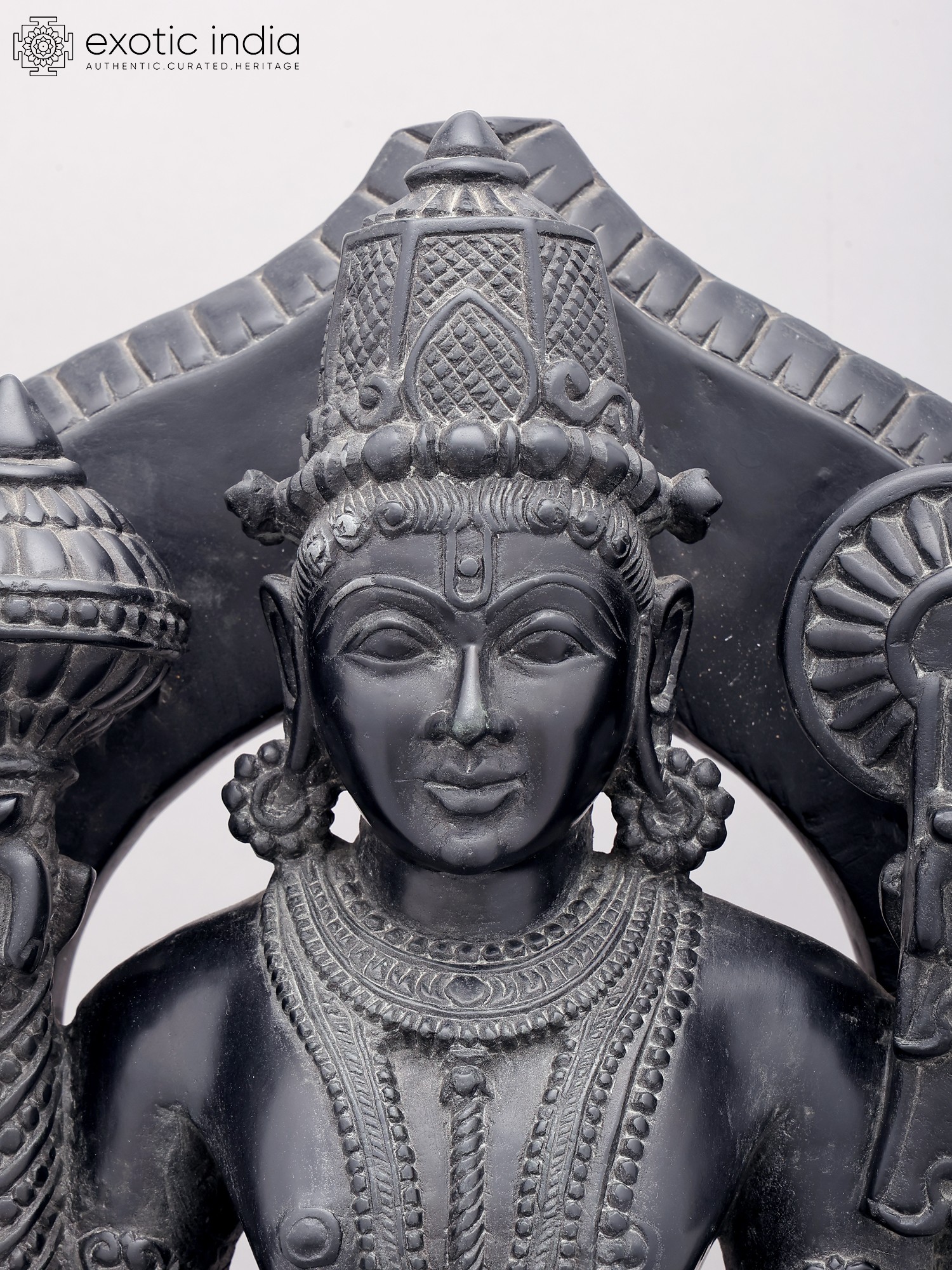 Showcases intricate detailing in attire, jewelry, and divine attributes like the conch and discus.