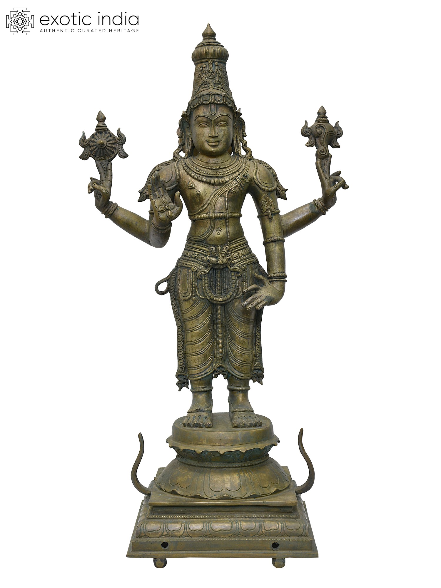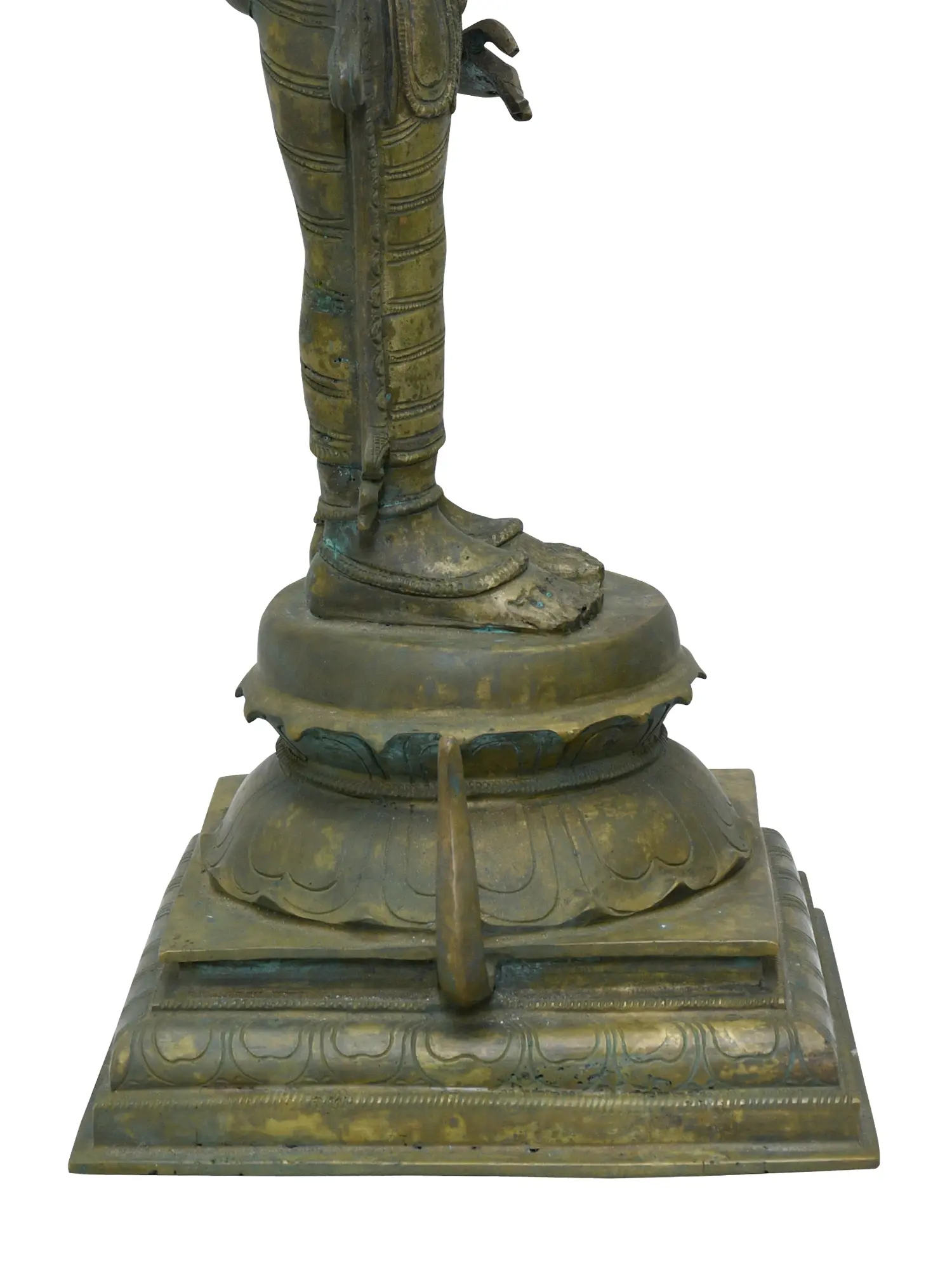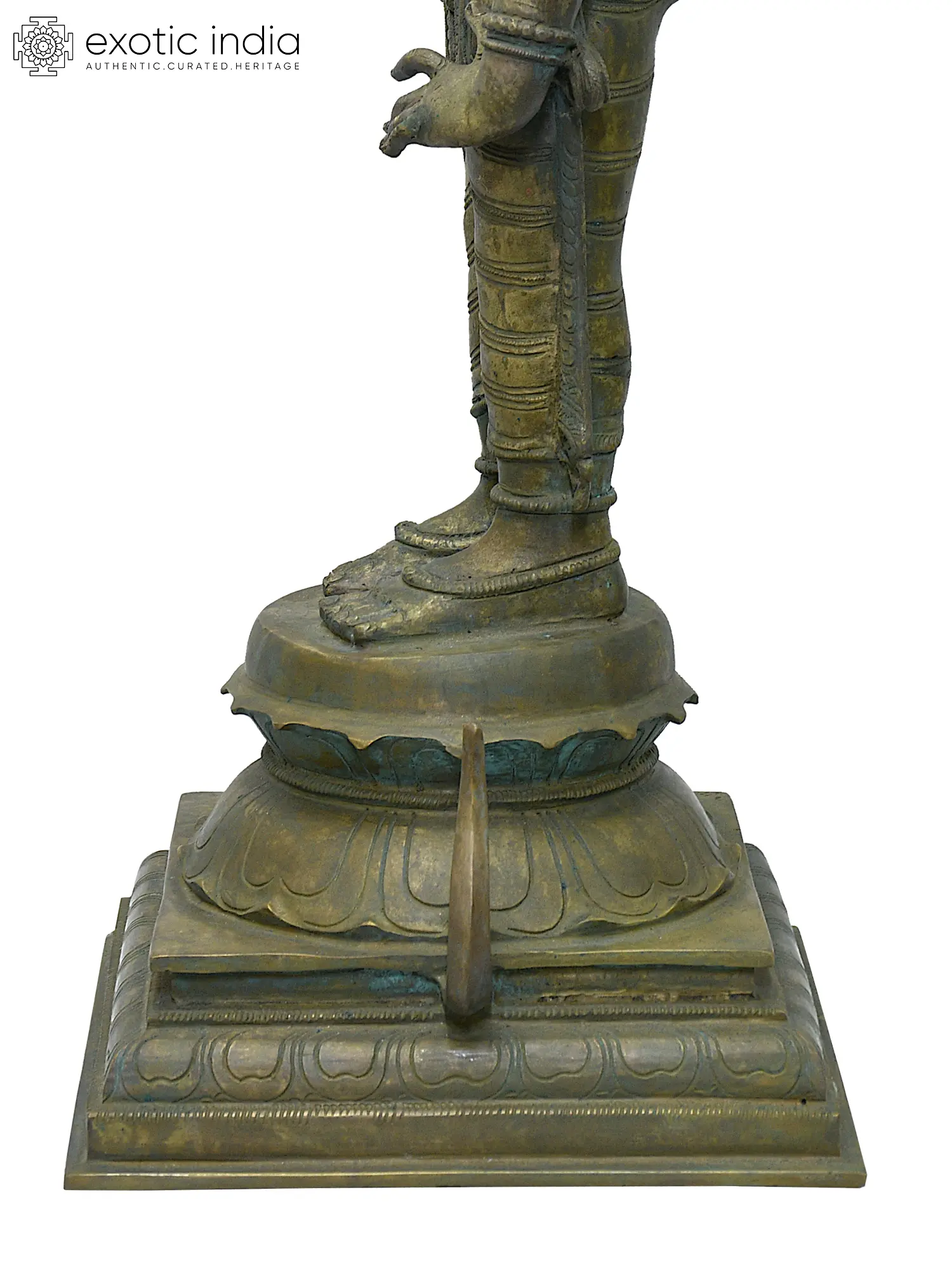 13" Standing Lord Vishnu with Sridevi and Bhudevi on Kirtimukha Throne | Madhuchista Vidhana (Lost-Wax) | Panchaloha Bronze from Swamimalai