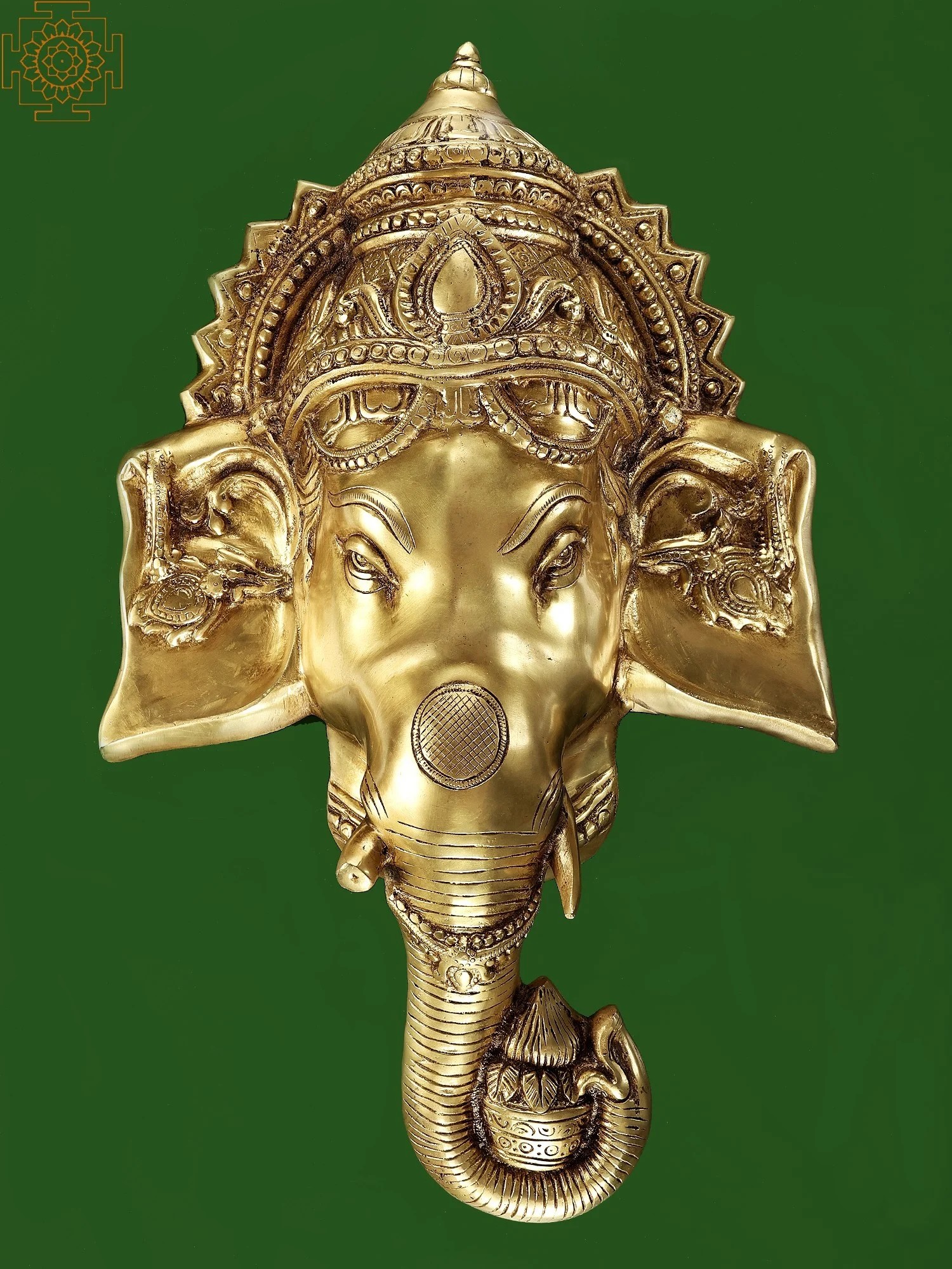 The Ganesha mask that you see on this page is a pure brass composition. Dreamy half-shut eyes indicative of deep introspection, an ornate crown engraved in perfect symmetry, and a serrated trunk give life to the lustrous, golden medium. Note the lifelike musculature of the Lord’s ears, and the gorgeous adornments that grace the delicate inner folds.