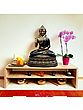 This sculpture is intricately and carefully carved which delineates plenty of his characteristics. There are 3 lines on his neck symbolising vital disciplines – conduct, concentration, and wisdom. Furthermore, his right shoulder is bare because usually, monks merely had a single fabric to wrap around their body and if right handed, the monk would cover his left shoulder and keep the right bare, as in the case of Budha, where he is wearing a black fabric with a golden lining on his left shoulder. He is also seen sitting on a pedestal carved with lotus petals and his earlobes are also outreached to make a lotus petal, this flower’s significance is that it symbolises the one who overcame the pain prevailing in the material world and became enlightened. Budha’s hair is engraved in such a manner that they appear like snails and there is a cone like crest on his head. He is meditating on a meticulously carved Bodh gaya, on which Budha renounced his princely life to wander and practice asceticism. His eyes and the body language reveal how he is ruminating in a tranquil and composed manner.