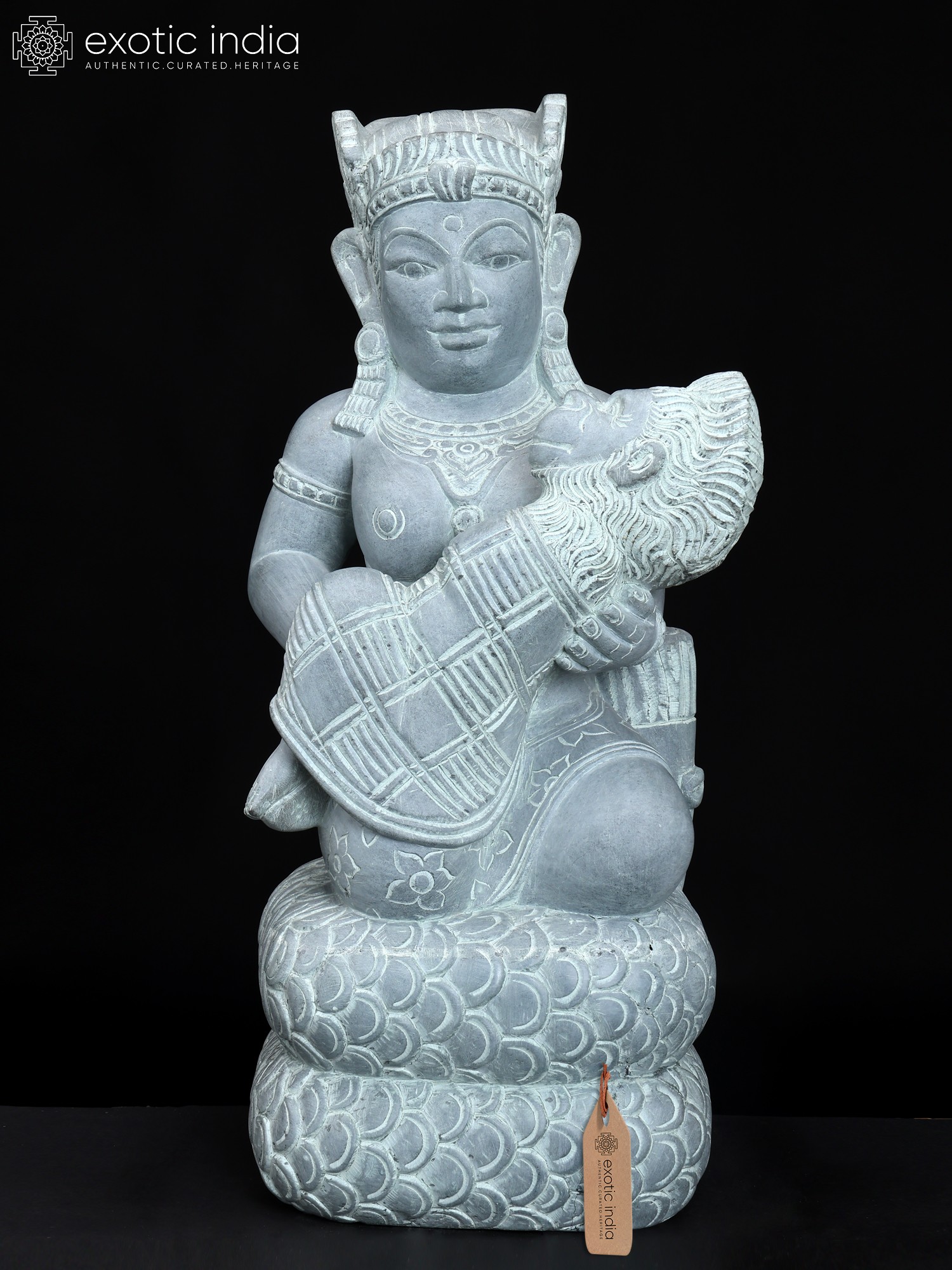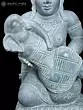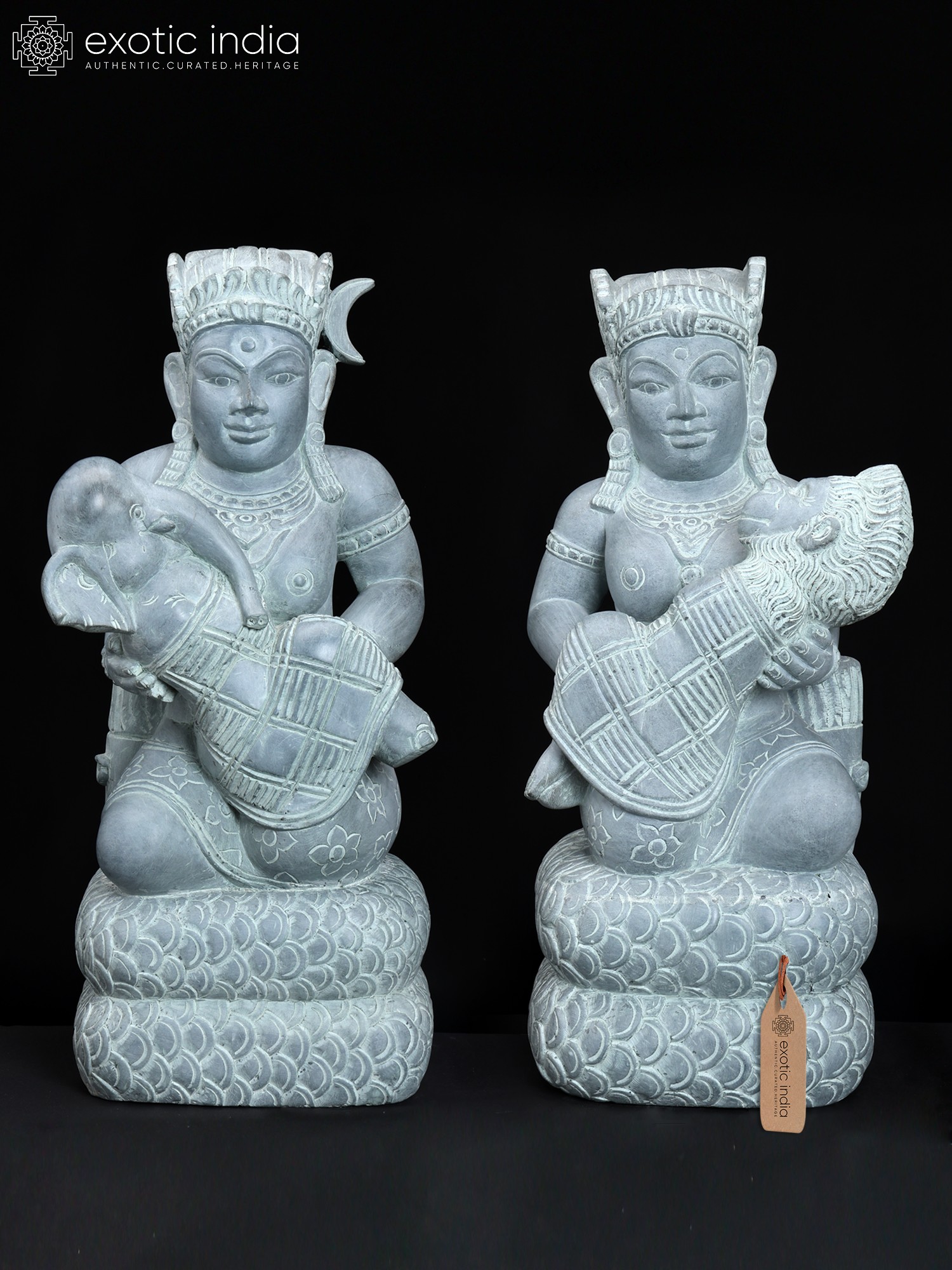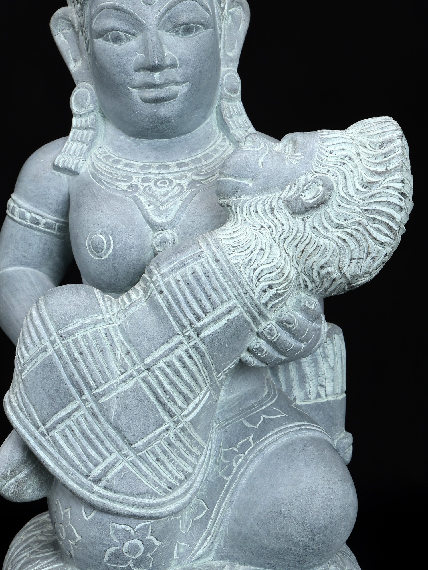 24" Goddess Parvati with Ganesha and Mata Anjani with Hanuman | Pair of Granite Stone Statues from Mahabalipuram