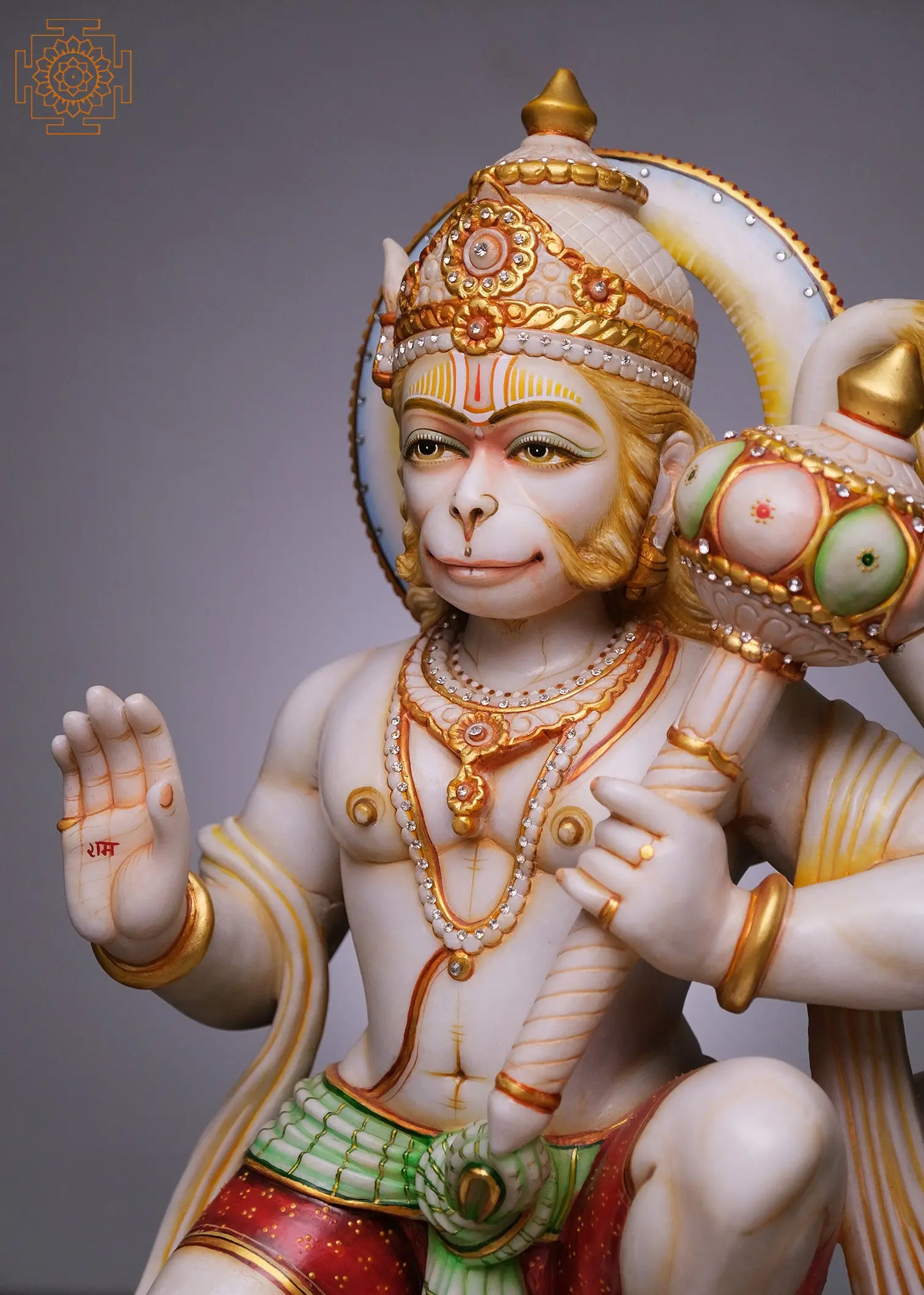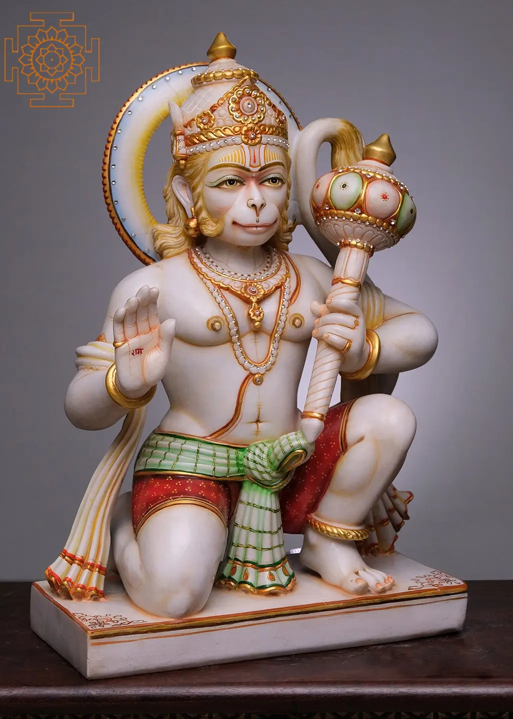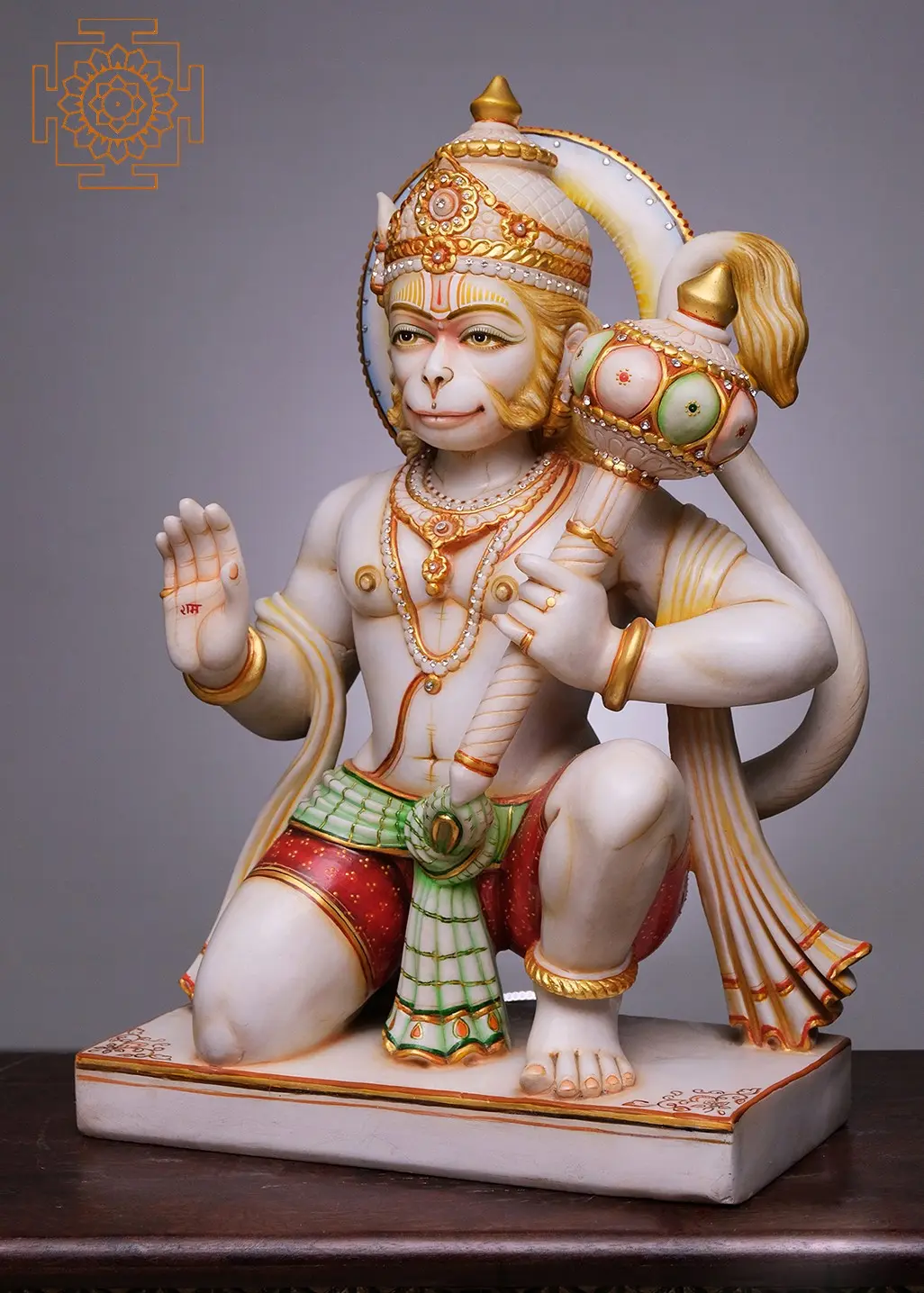 This magnificent statue, meticulously handcrafted from pure white marble, captures the essence of Lord Hanuman, the epitome of devotion, strength, and loyalty. Standing at an impressive 24 inches, this sculpture is a testament to the artistry and spiritual reverence that goes into its creation. Hanuman, often referred to as the "Monkey God," is a central figure in the Hindu epic, the Ramayana, revered for his unwavering dedication to Lord Rama. His posture in this artwork is one of gentle readiness and profound humility. Kneeling with one knee raised and the other touching the ground, he holds his divine mace, the Gada, with a firm yet graceful grip. The Gada symbolizes his power and his role as a protector, while his raised right hand, with the palm facing outwards, is a gesture of blessing and reassurance, embodying his benevolent nature. The inscription "Ram" etched on his palm is a subtle yet powerful reminder of his constant devotion to the divine. The sculptor has paid exquisite attention to detail, from the intricate crown adorning his head to the delicate necklaces and bracelets that embellish his form. The facial features are rendered with a serene and intelligent expression, reflecting Hanuman's wisdom and his deep connection to the divine. The use of white marble lends an ethereal quality to the statue, making it appear almost alive, radiating a sense of peace and spiritual energy. The subtle hand-painting and golden accents further enhance its visual appeal, bringing out the intricate ornamentation and adding a touch of regal splendor.