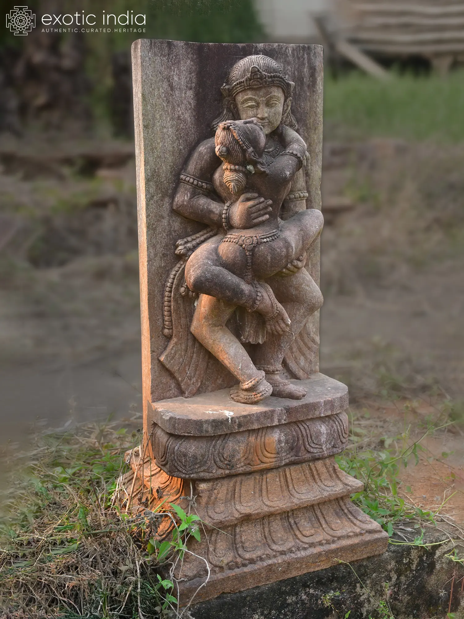 The dynamic composition showcases figures in a tender embrace, their forms flowing together with graceful fluidity. You'll appreciate the intricate details in their ornamentation, from the delicate jewelry adorning their limbs to the thoughtfully rendered hairstyles, all rendered with remarkable depth and clarity. The subtle variations in the sandstone's surface lend a lifelike warmth to the figures, making their connection palpable. Standing at a generous 24 inches in height, its commanding presence is balanced by its intimate portrayal, creating a focal point that draws the eye and stirs the soul.