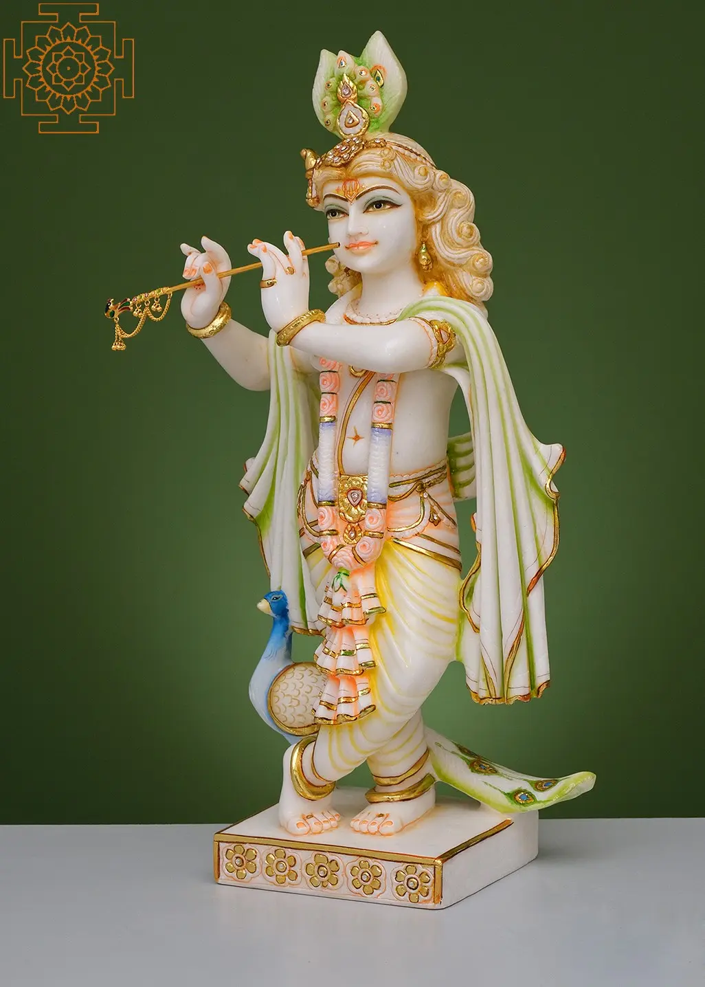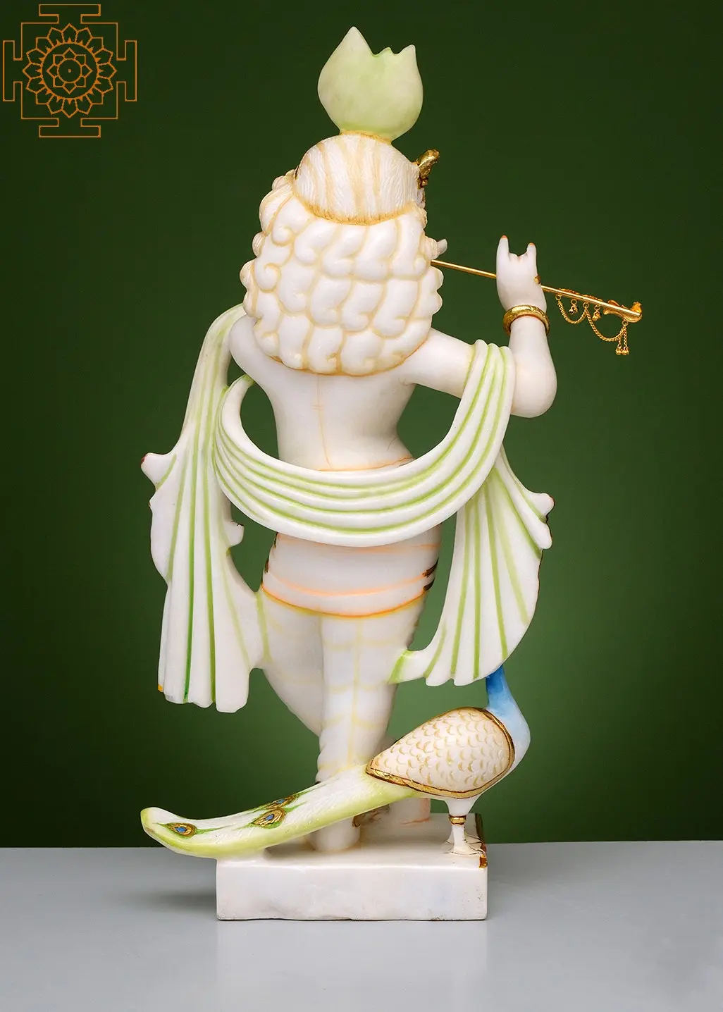 24" Krishna Playing Flute With Peacock | Handmade | White Marble Krishna | Krishna Statue