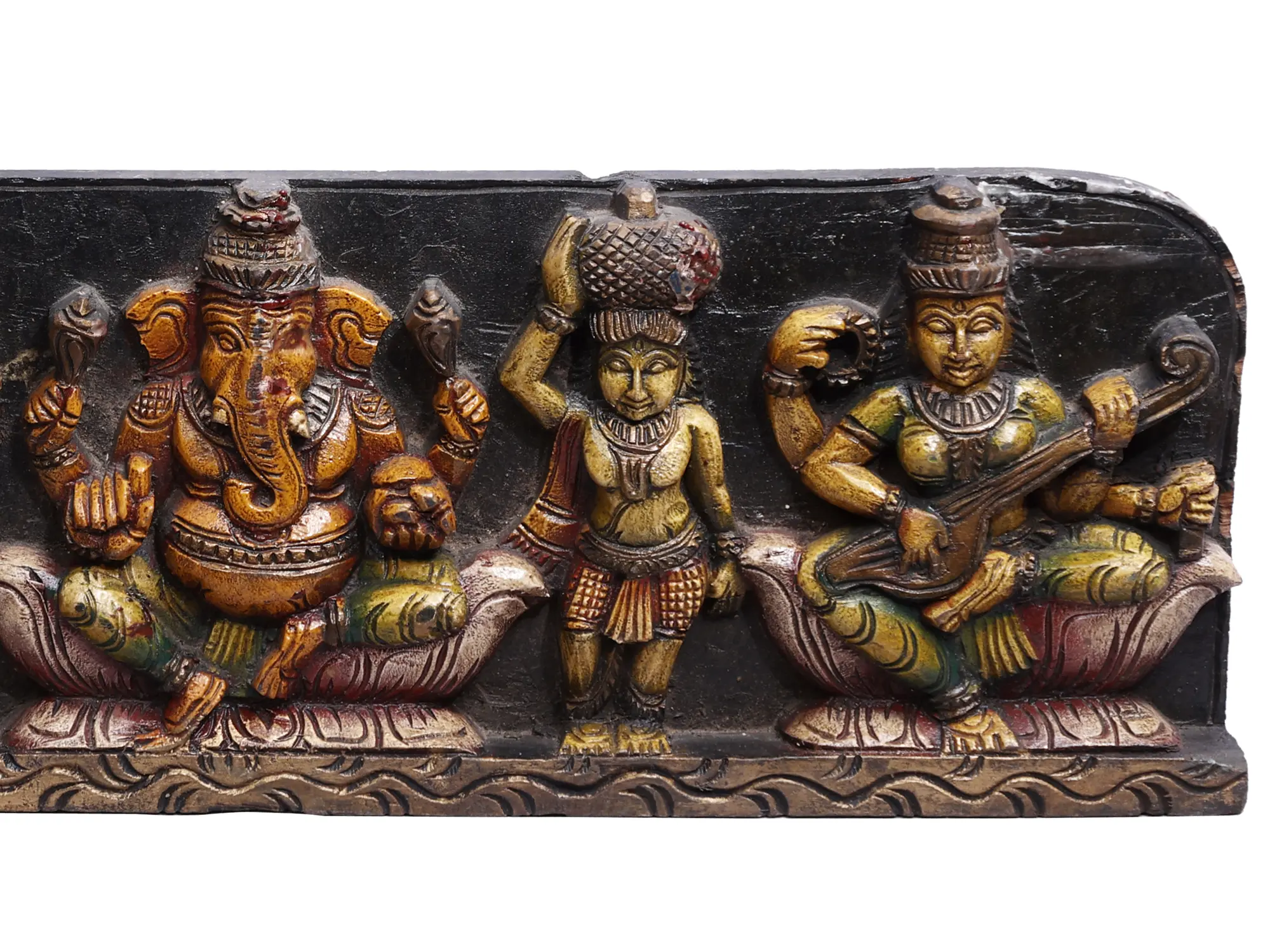 In his aspect as “Baala Ganapati” or the child Ganesha, one of his attributes is the jackfruit, which represents the virtuous fertility of the earth. As the embodiment of the divine and nurturing powers of the earth and maternal prowess, goddesses Lakshmi and Saraswati amplify the religious and aesthetic value of this unique piece of traditional Indian art.