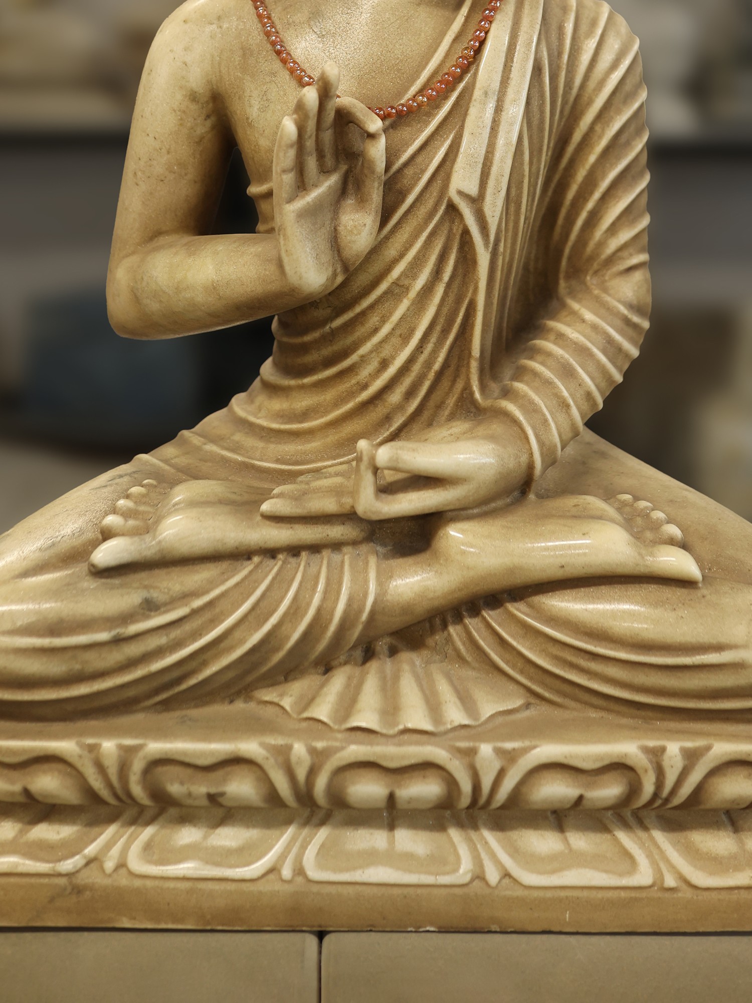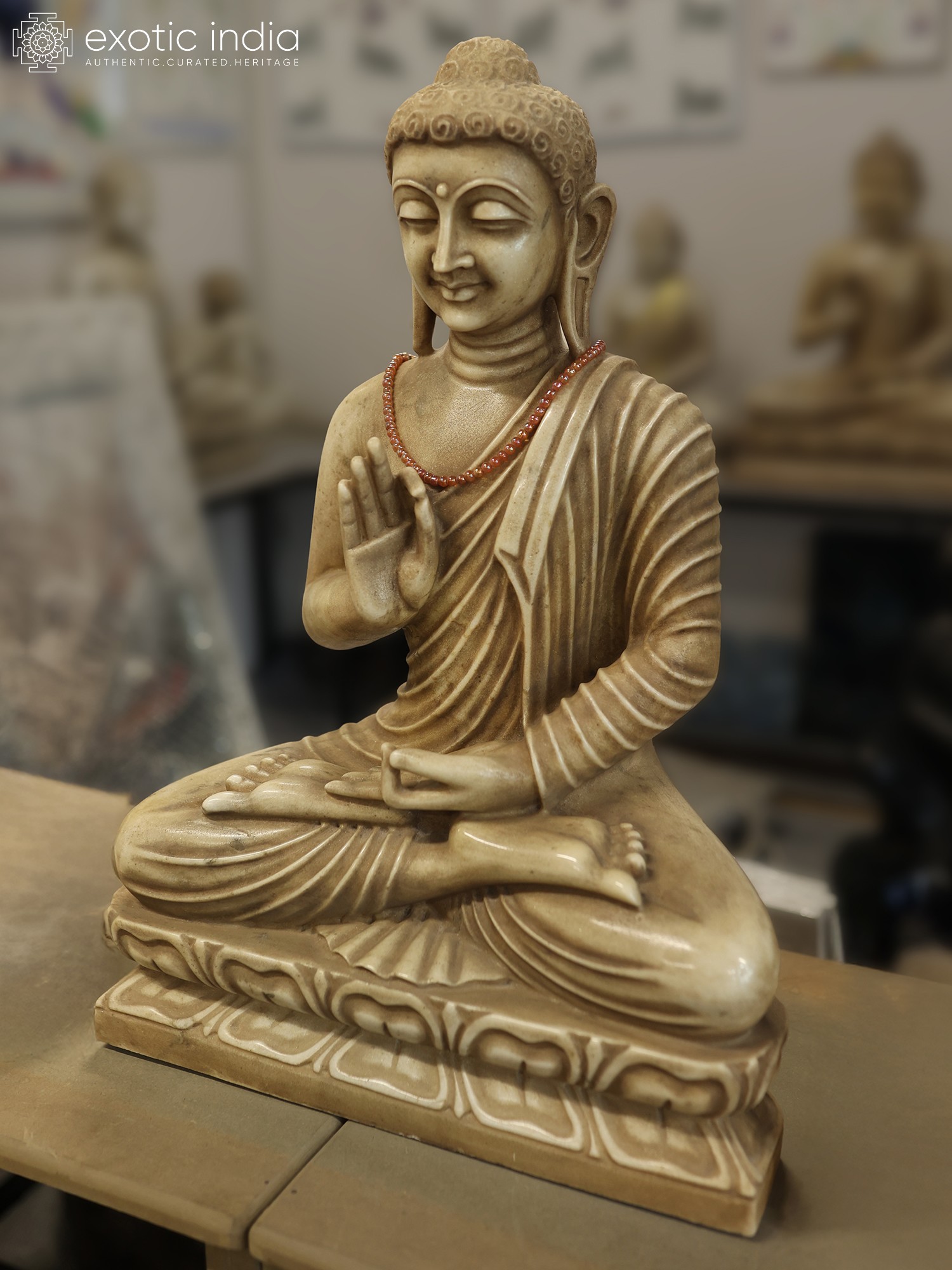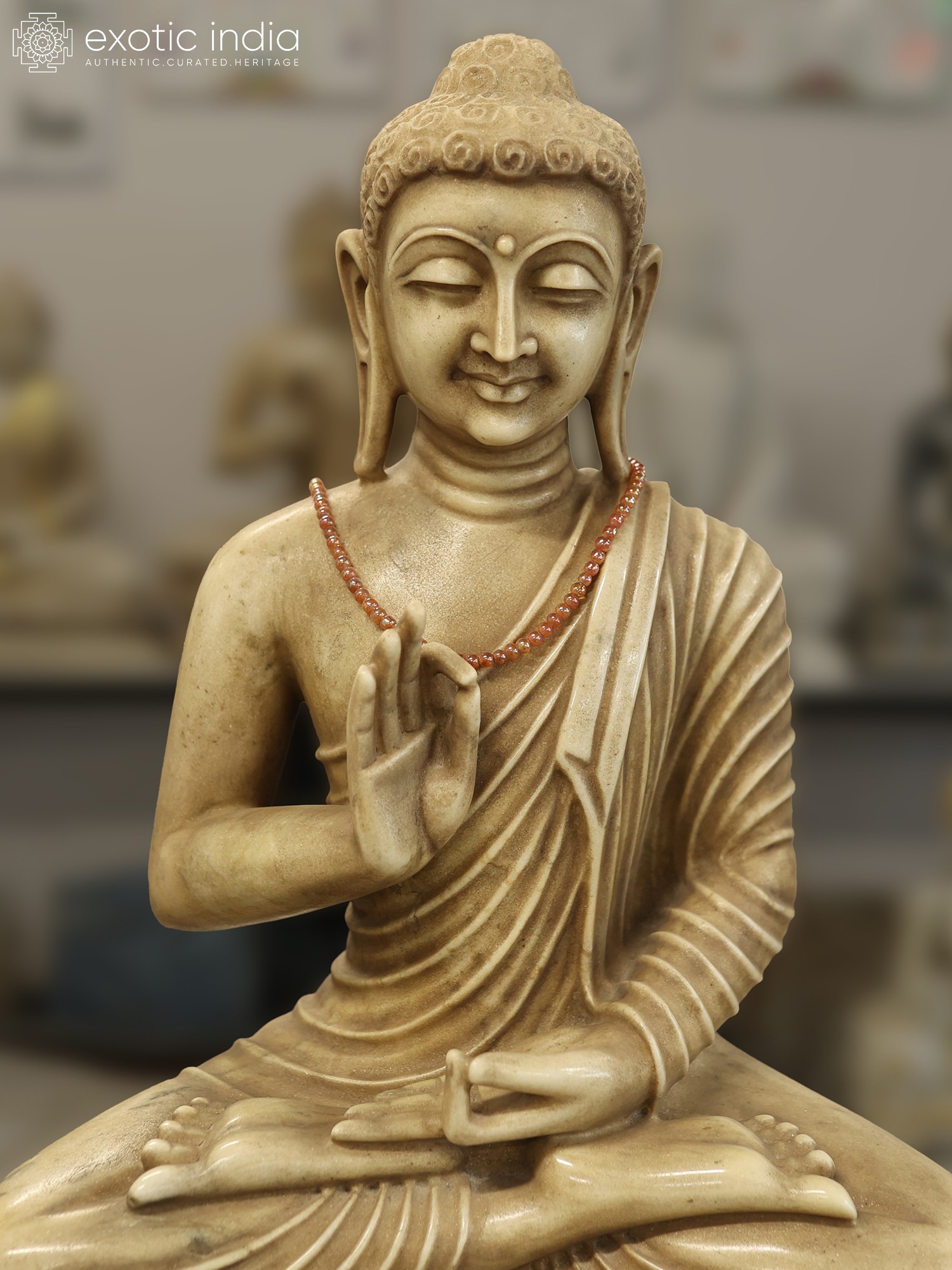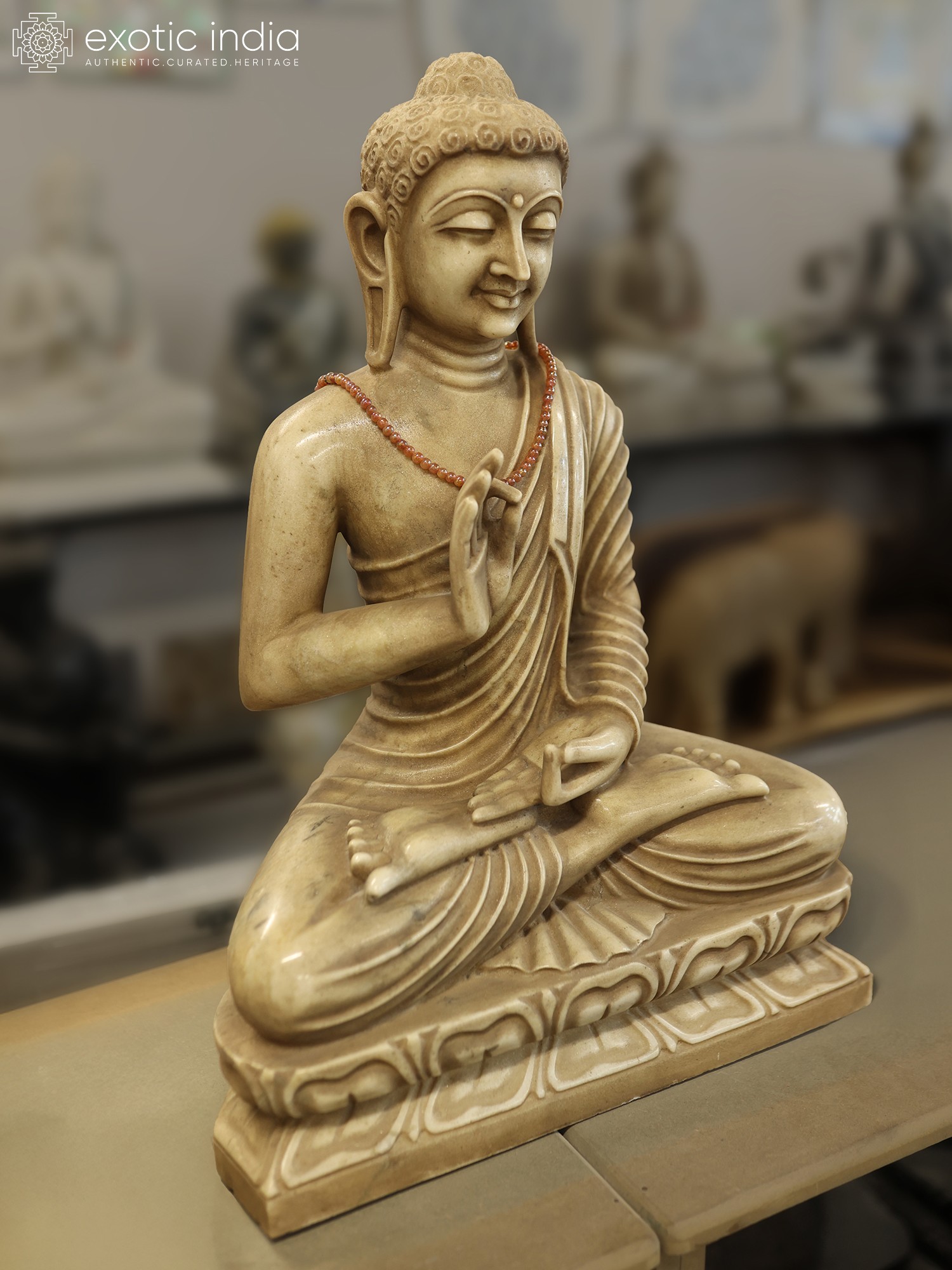 The dimensionality of this artwork is evident in its serene posture, seated in a meditative cross-legged stance upon an intricately carved pedestal. The depiction of the Vitarka Mudra, with the thumb and index finger touching, signifies the transmission of knowledge and the discourse of teachings, an uplifting gesture you'll find endlessly inspiring. Its substantial presence, measuring 24 inches in height, ensures it commands attention with quiet grace.