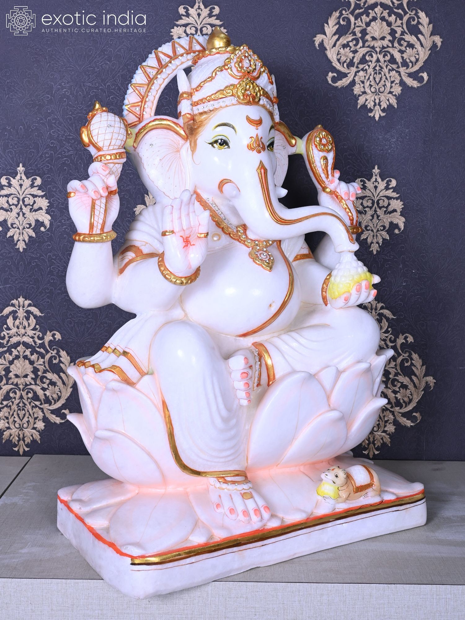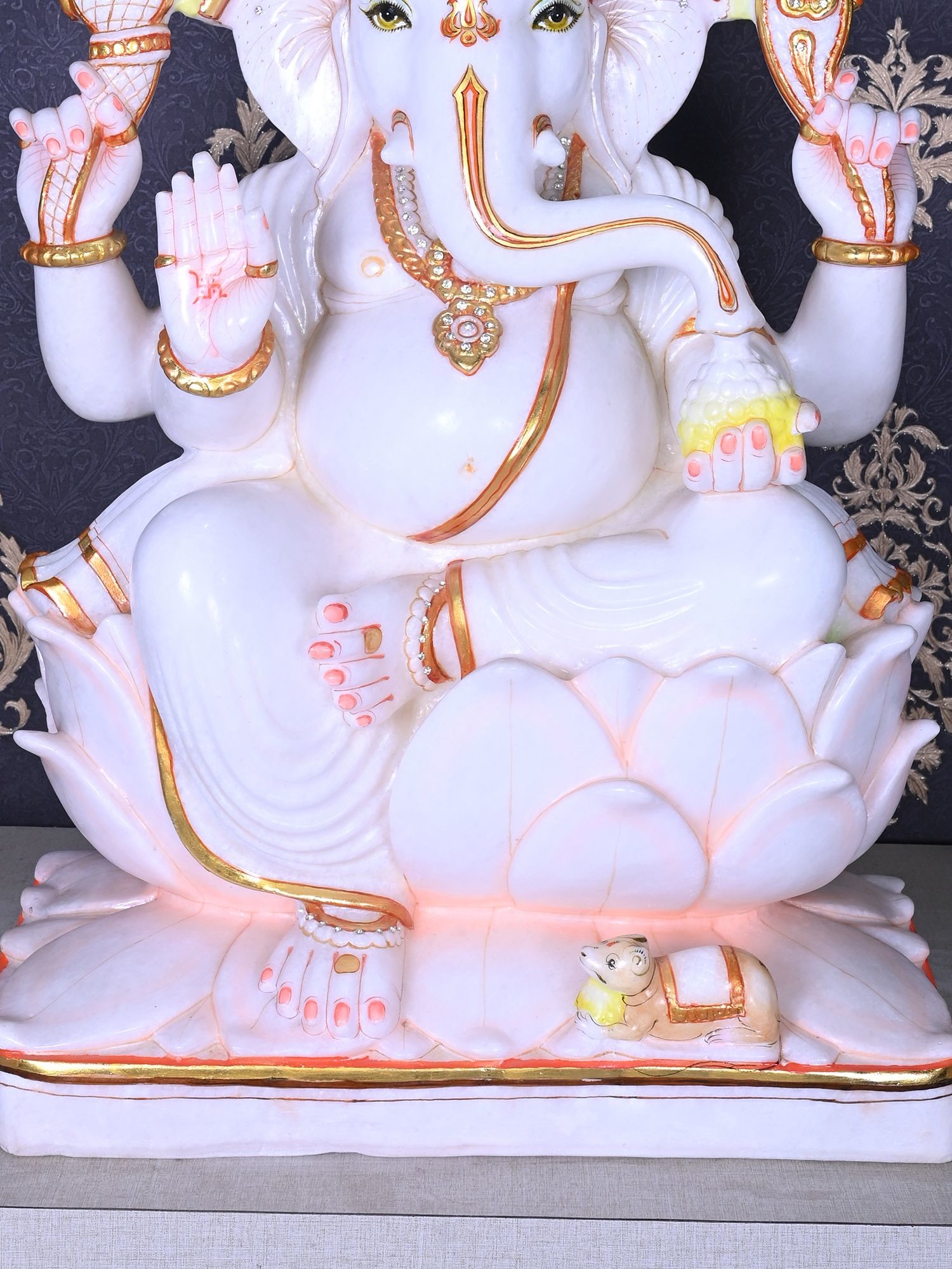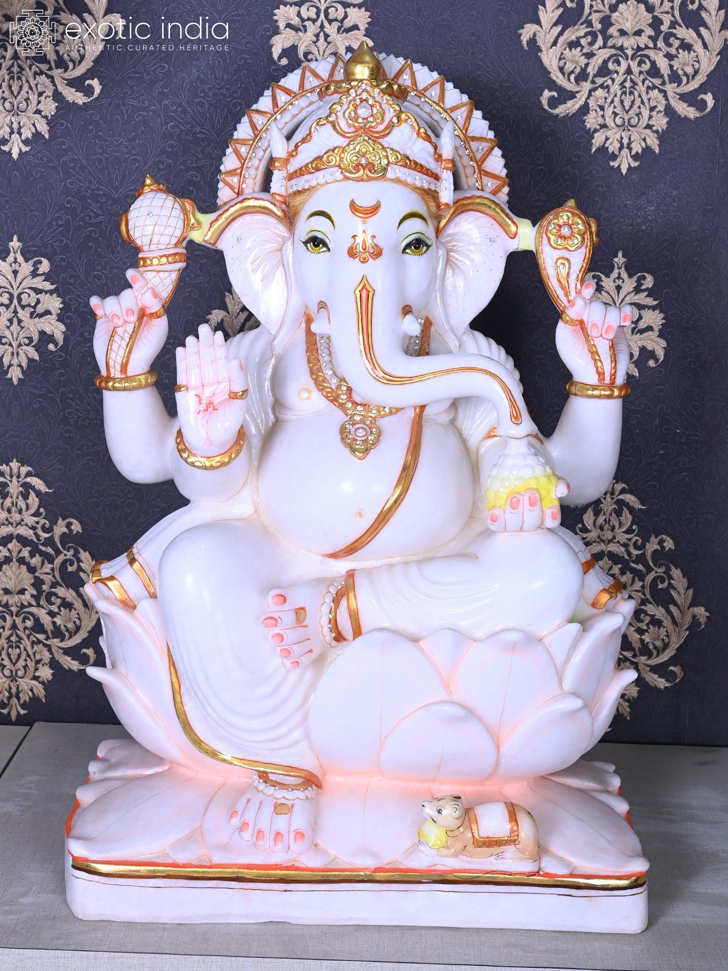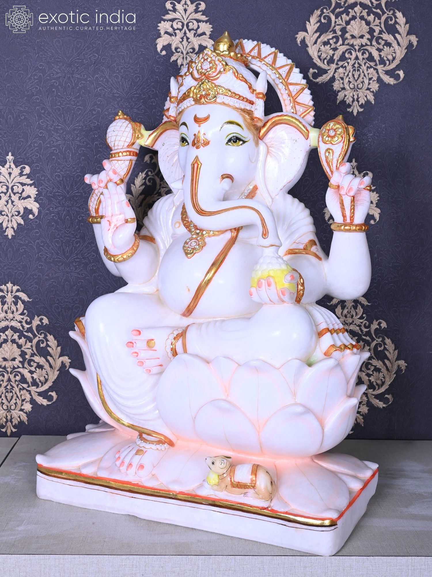 30" Lord Ganesha Statue with Mushaka | White Makrana Marble