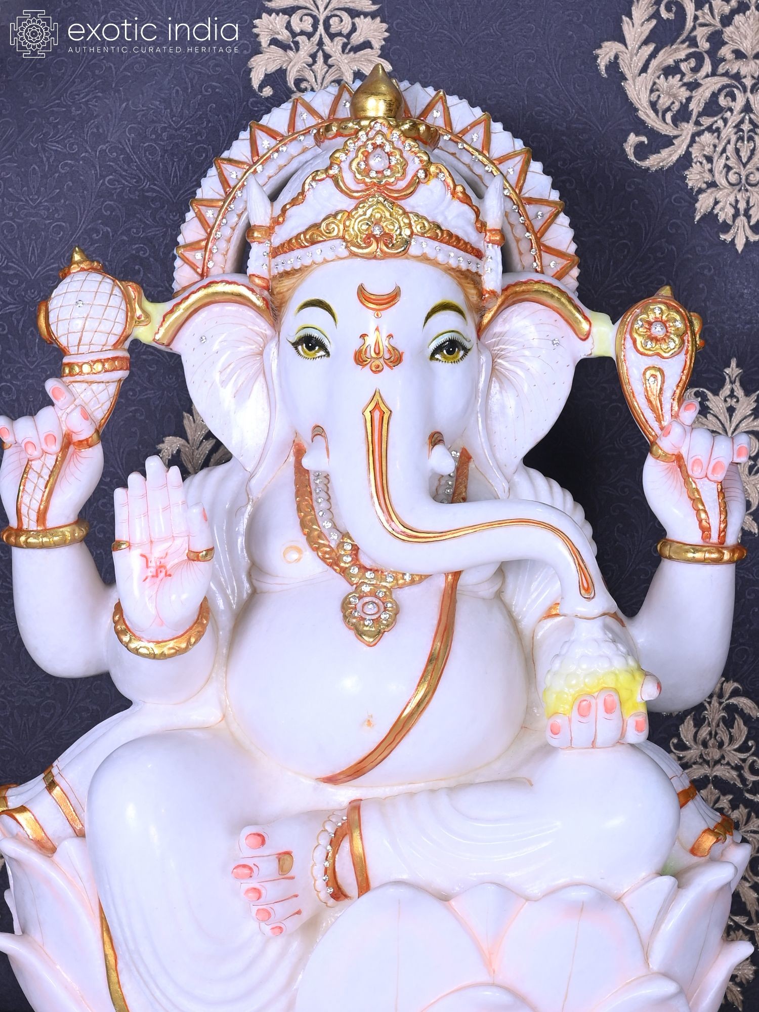 Features Ganesha holding his iconic attributes, symbolizing wisdom and prosperity.